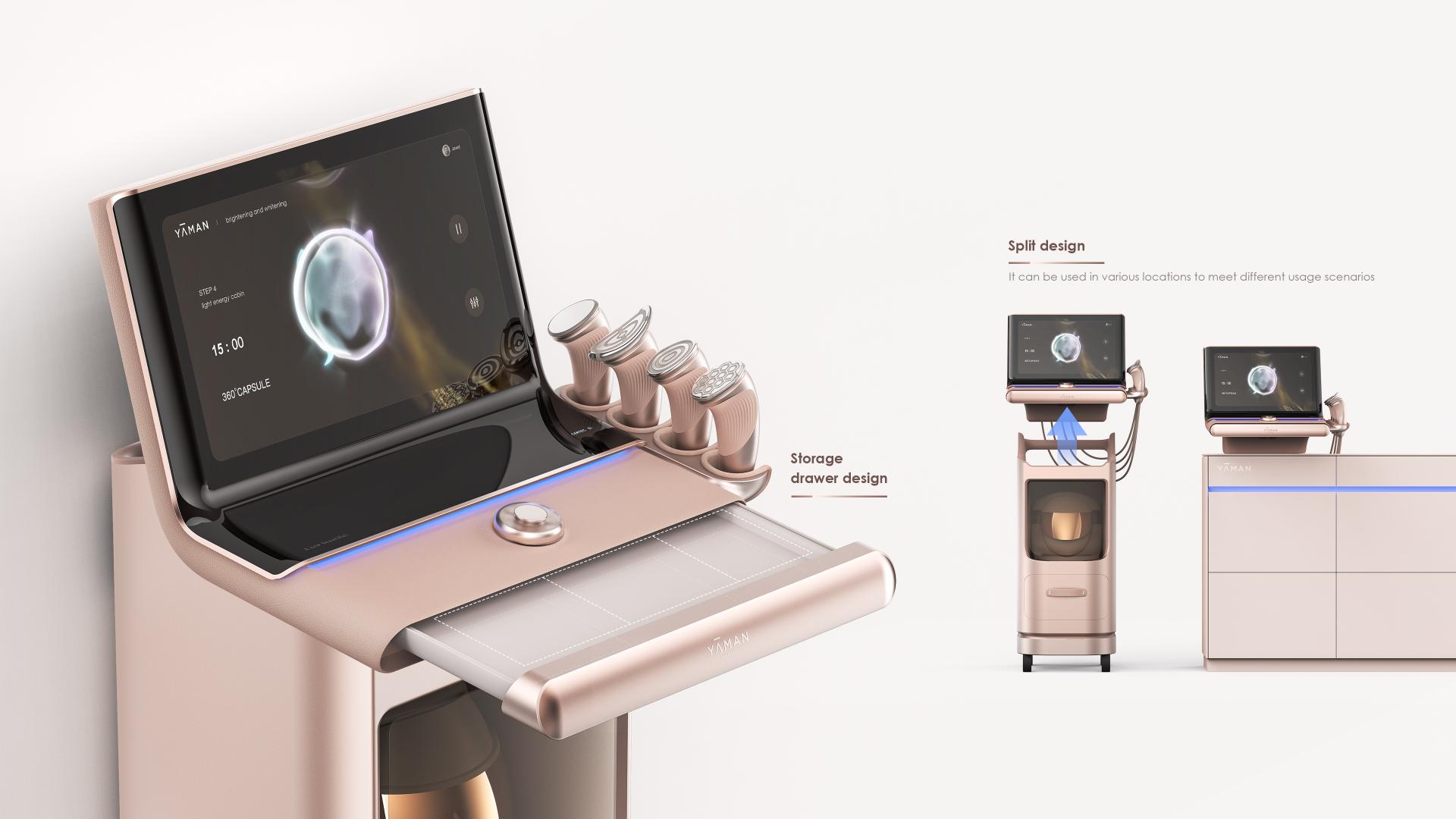 The PSM300 features a visually integrated screen design, inspired by automotive central control panels. Utilizing large curvature design elements, the screen is seamlessly blending into the curved surface. When the screen is off, it is visually hidden, creating a harmonious beauty of technology and nature. Its overall shape is minimalist yet elegant, with a color scheme that complements the sophisticated style of high-end beauty salons. Adhering to user experience as the key point, the storage drawer design was derived. It can be easily integrated whether placed at home or in a professional beauty salon.