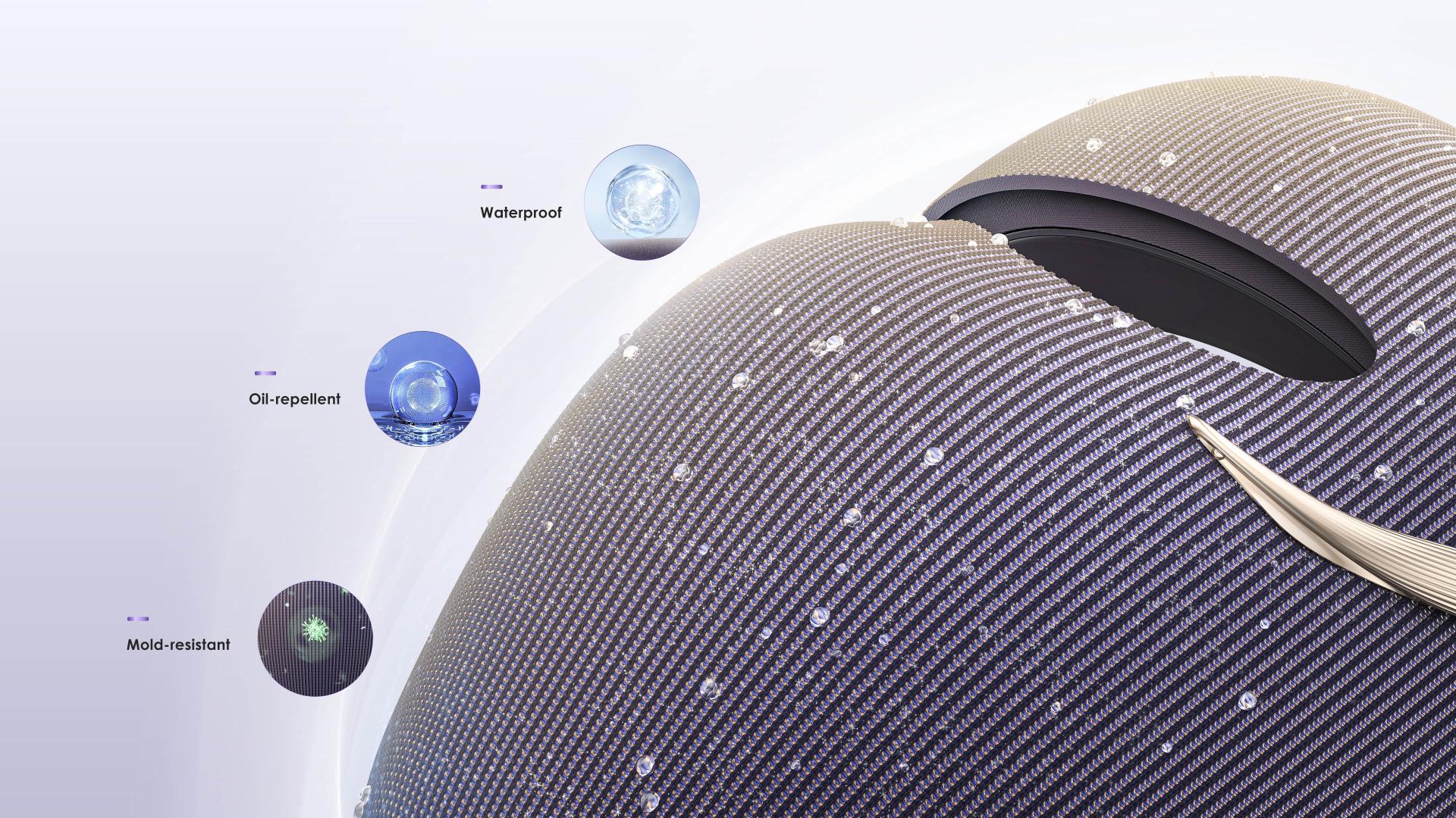 Another highlight of the newly one-piece and green material lies in its three-proof performance: waterproof, oil-repellent, and mold-resistant. This feature is attributed to the eco-friendly and renewable three-proof yarn we use. In humid areas or environments, the mask material will not mold, discolor, or develop bacteria, effectively resisting the intrusion of cosmetics and oil stains.