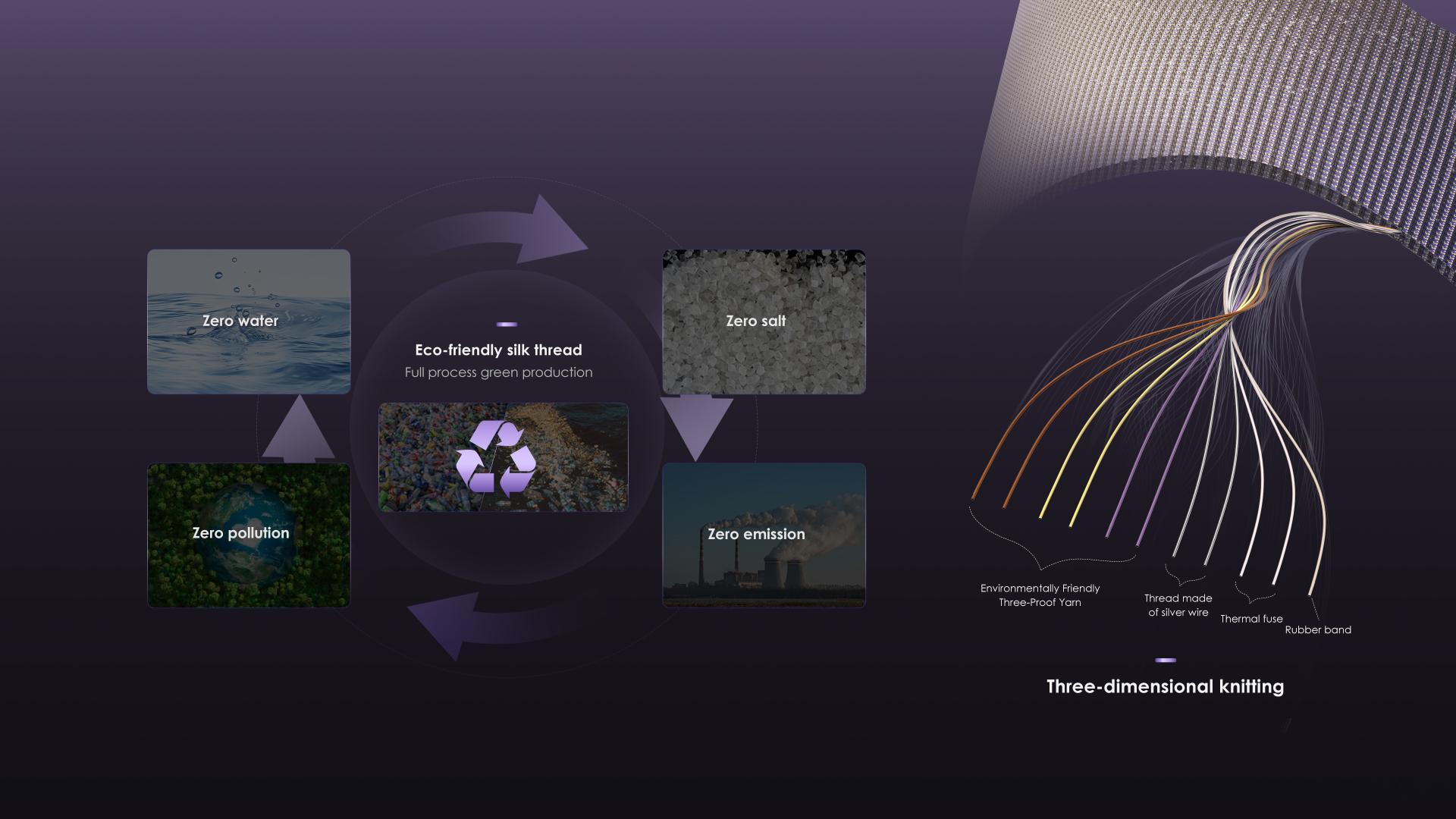 While pursuing technological innovation, we are fully aware of the importance of environmental protection. Therefore, several eco-friendly measures have been adopted in the production process of the newly one-piece and green material. The application of special shuttles and weaving devices reduces yarn consumption and energy usage, enhancing weaving efficiency. The introduction of an automatic control system has enabled fully automated operations, simplifying the weaving process and reducing manpower. Notably, we have adopted eco-friendly, renewable, and three-proof yarn, along with waterless dyeing technology, converting recycled plastic bottles and marine waste into non-polluting and biodegradable materials. The dyeing process uses zero water, zero salt, and produces zero emissions, truly achieving green production and reducing the burden on the Earth.