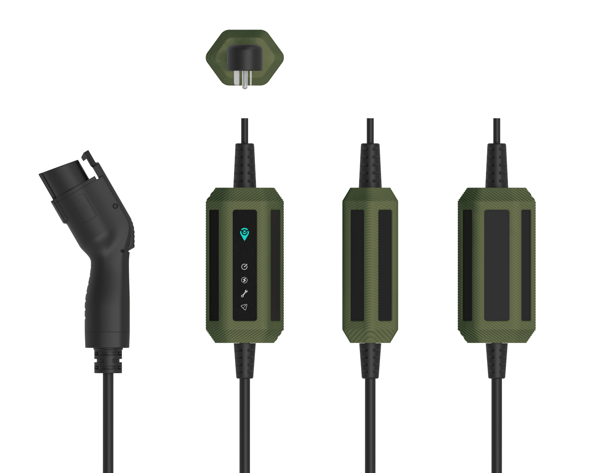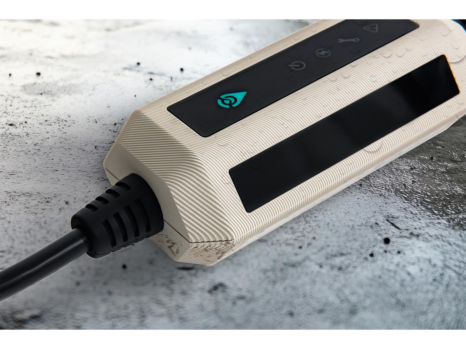 The product features a sleek, high-tech design that complements electric vehicles. Its hexagonal, industrial-style design is made of dual-component silicone and high-strength materials, finished in military green with a special twill pattern. This portable charging device offers attractiveness, efficiency, and resistance to weather, stains, drops, and crushes. It is injection-molded in one piece with an IP67 waterproof and dustproof certification, and a reinforced structure design that can pass a 1-ton rolling test.