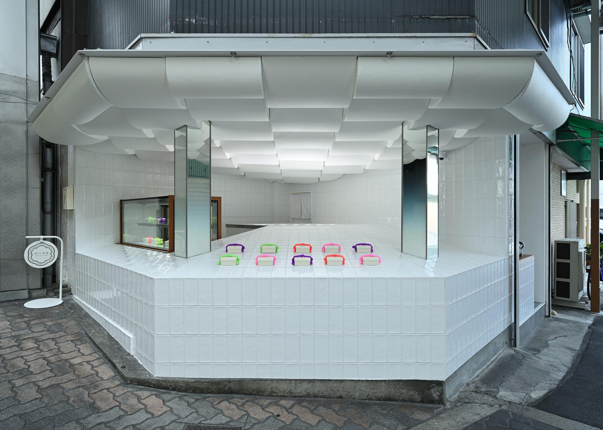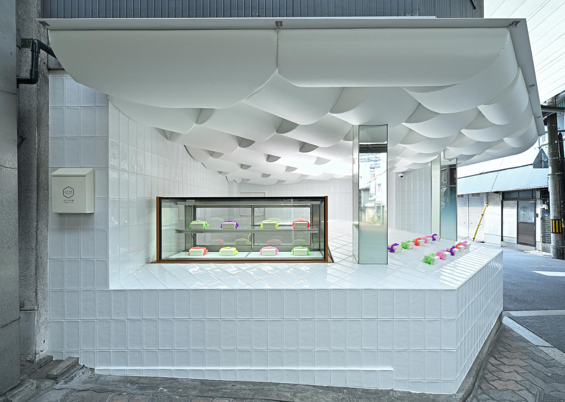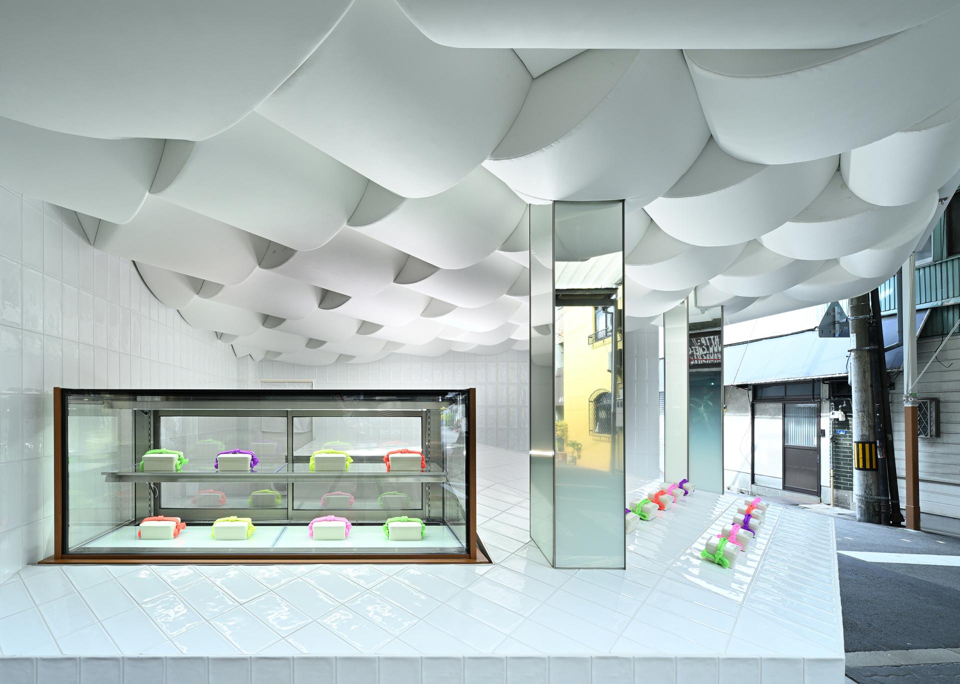 The most distinctive feature is the sales stands that occupy the entire sales floor. Aisles for sales staff are minimized inside the store, prompting the staff to serve customers outside. This sales style was inspired by the grenngrocer across the street and the fish shop three doors away. We noticed the local grocers and fish shop workers always stay in their storefronts to serve customers, adding a lively vibe to the entire shopping street. We thought that such assertive marketing—going out and talking to customers instead of waiting for them to come in—could be more appropriate for the neighborhood and, above all, more interesting. The ceiling height gradually decreases toward the back, creating a “mighty look” when viewed from the front to camouflage the compact size of the shop. The ceiling, upholstered with white tent fabric and resembles a cloud, also effectively enhances the look.