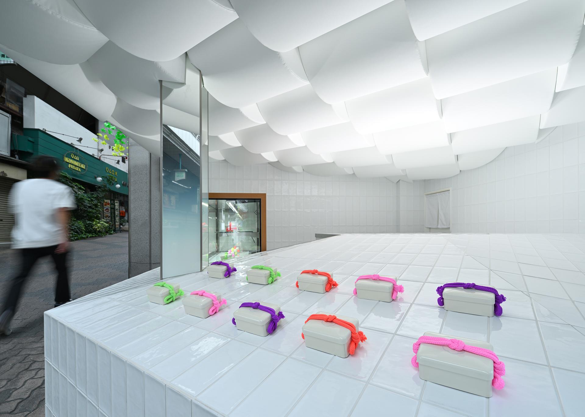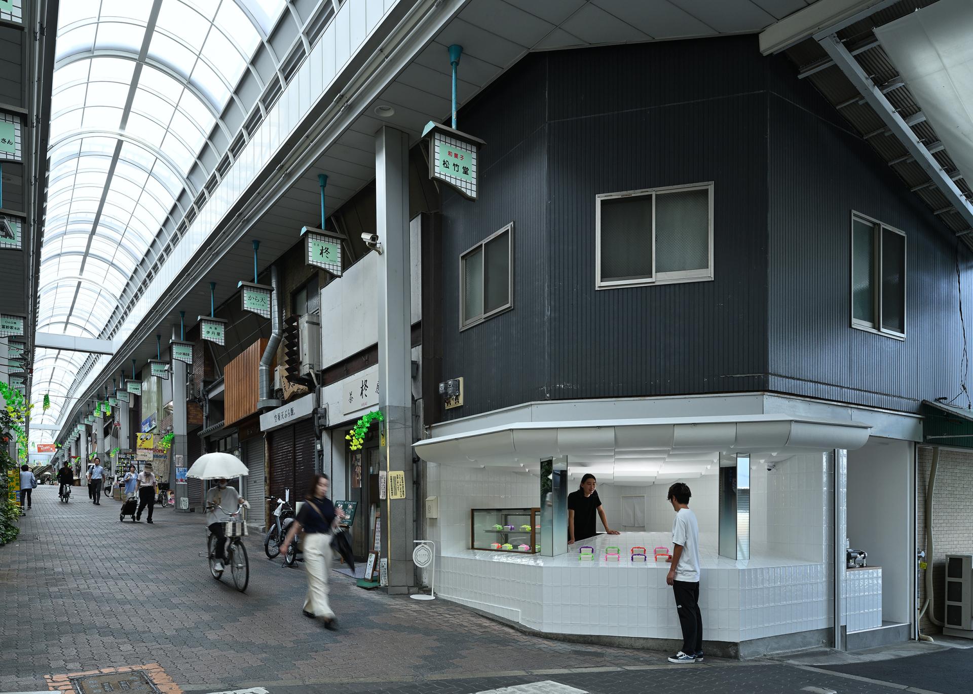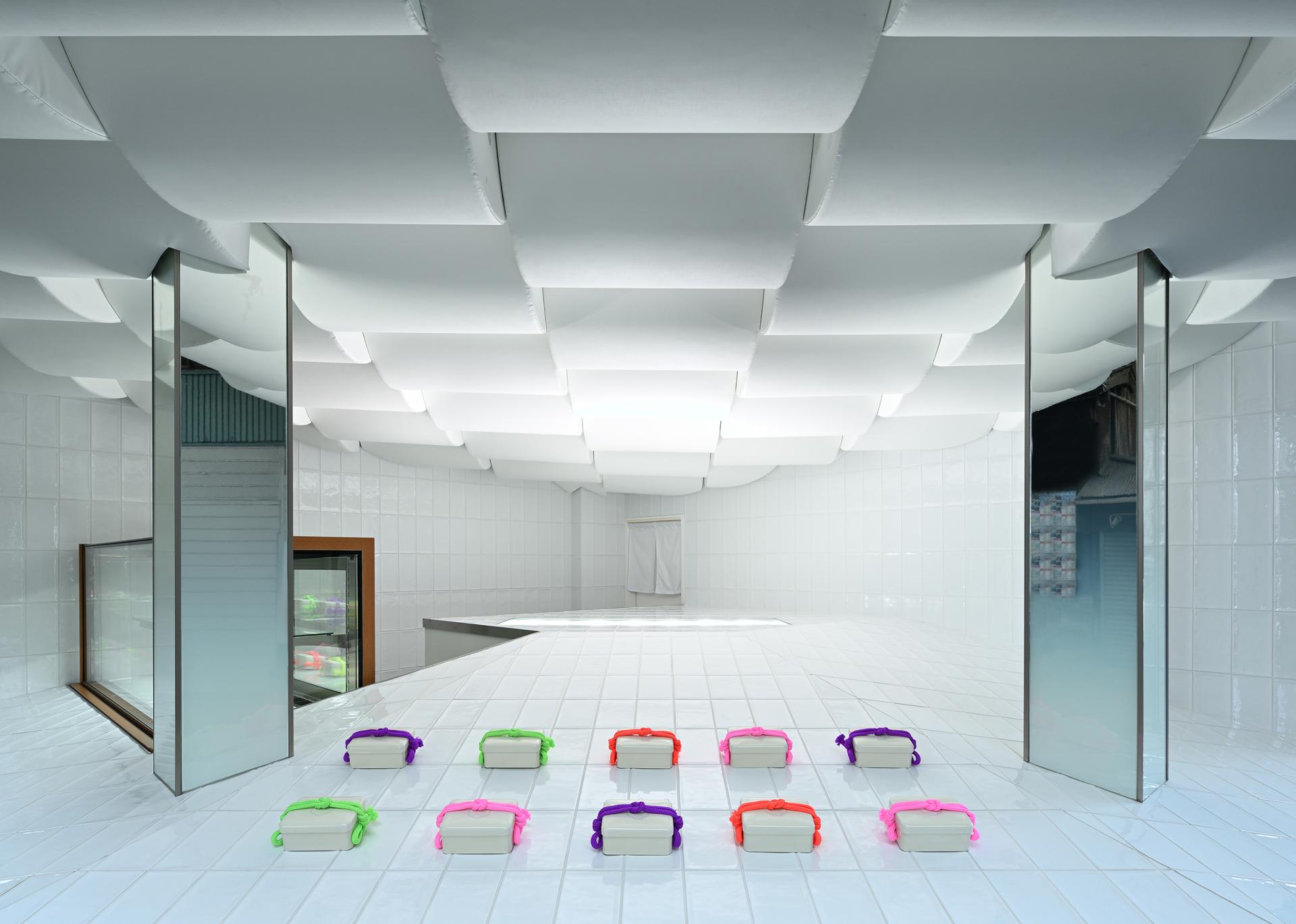 The most distinctive feature is the sales stands that occupy the entire sales floor. Aisles for sales staff are minimized inside the store, prompting the staff to serve customers outside. This sales style was inspired by the grenngrocer across the street and the fish shop three doors away. We noticed the local grocers and fish shop workers always stay in their storefronts to serve customers, adding a lively vibe to the entire shopping street. We thought that such assertive marketing—going out and talking to customers instead of waiting for them to come in—could be more appropriate for the neighborhood and, above all, more interesting. The ceiling height gradually decreases toward the back, creating a “mighty look” when viewed from the front to camouflage the compact size of the shop. The ceiling, upholstered with white tent fabric and resembles a cloud, also effectively enhances the look.