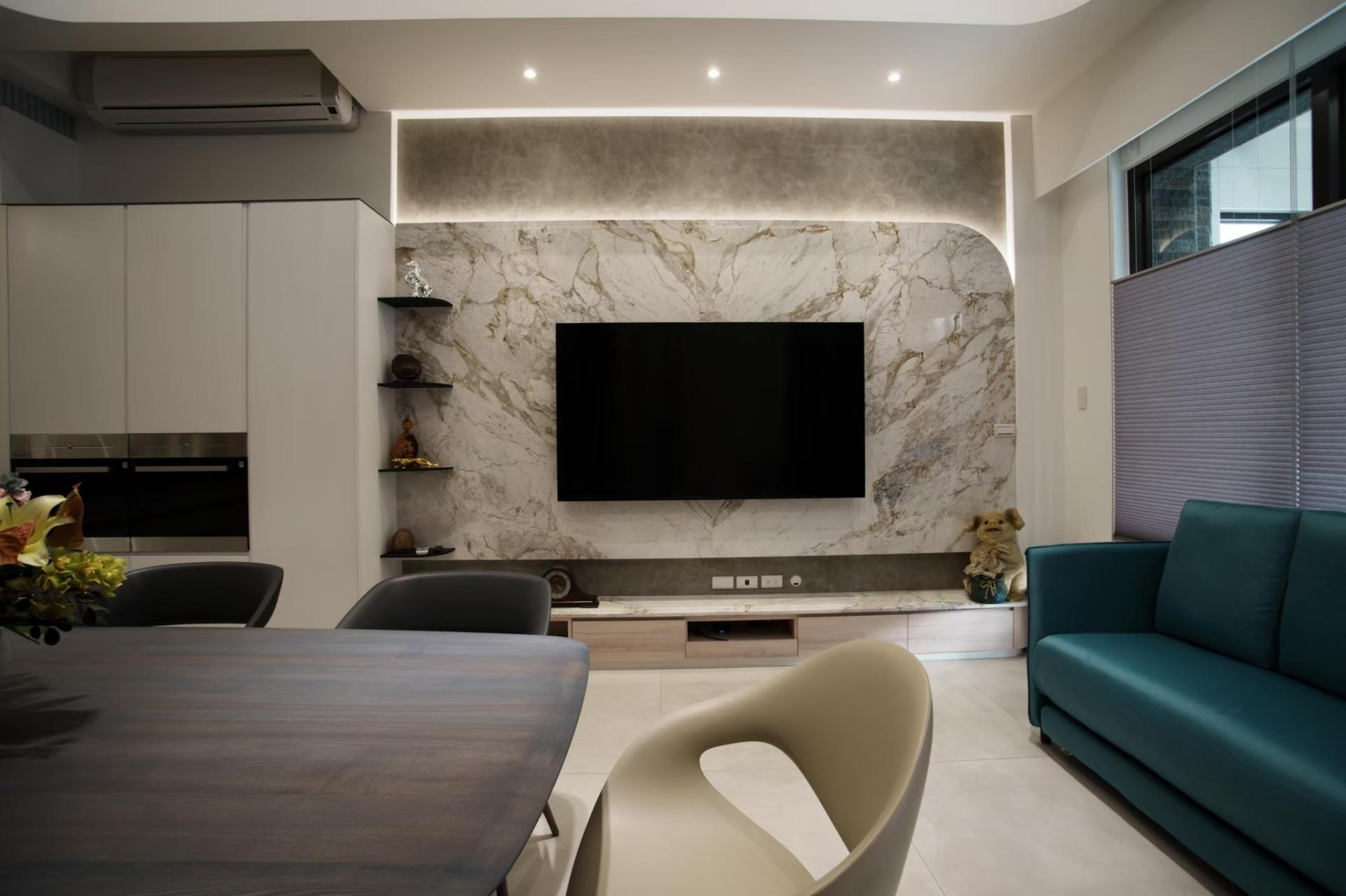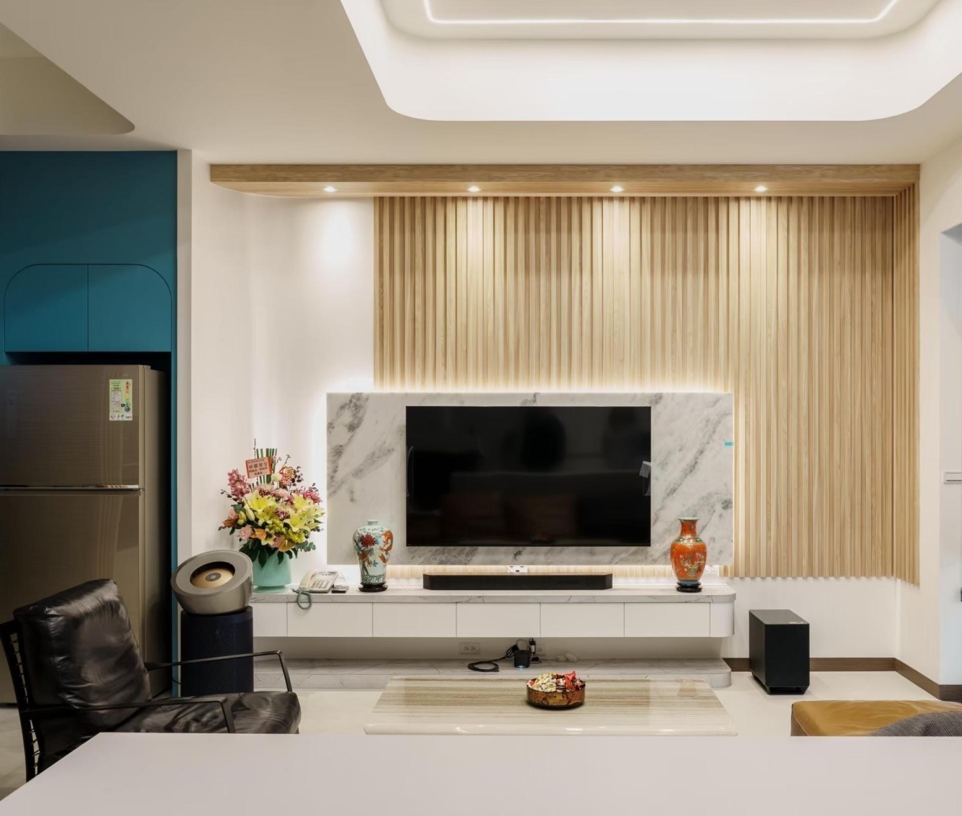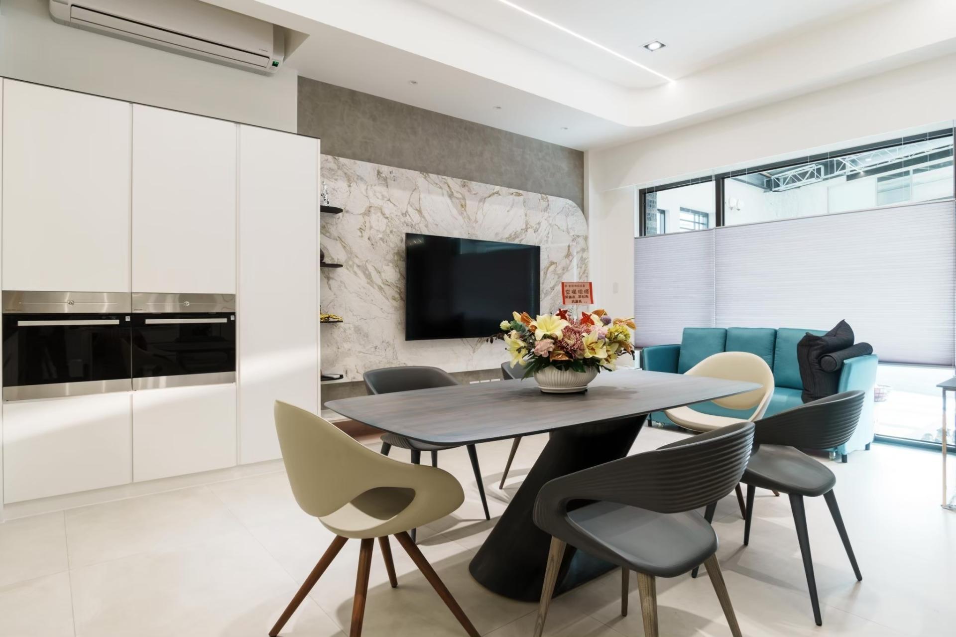 In the owner’s residential space, an independent entryway area is created, and a modeling screen is pulled out on the opposite side of the shoe cabinet. The screen uses partial hollowing design to let the light from public area enter the entryway and improve the visual brightness. The TV wall is a highlight of the overall design, whether the natural dolomite base of gold carving, supplemented by dark grey art paint background wall with white grain , or the white marble substrate , with wood grille forming layers, and geometric three-dimensional cut metal created TV wall, all successfully accentuates the main vision of the public area. Using the middle island decoration and the curved grille shape extending to the ceiling on the wall, the boundary of living area and dining area are cleverly drawn. The bottom of the suspended wave shape is integrated into the titanium-plated material, which pours a gorgeous sense into the field.