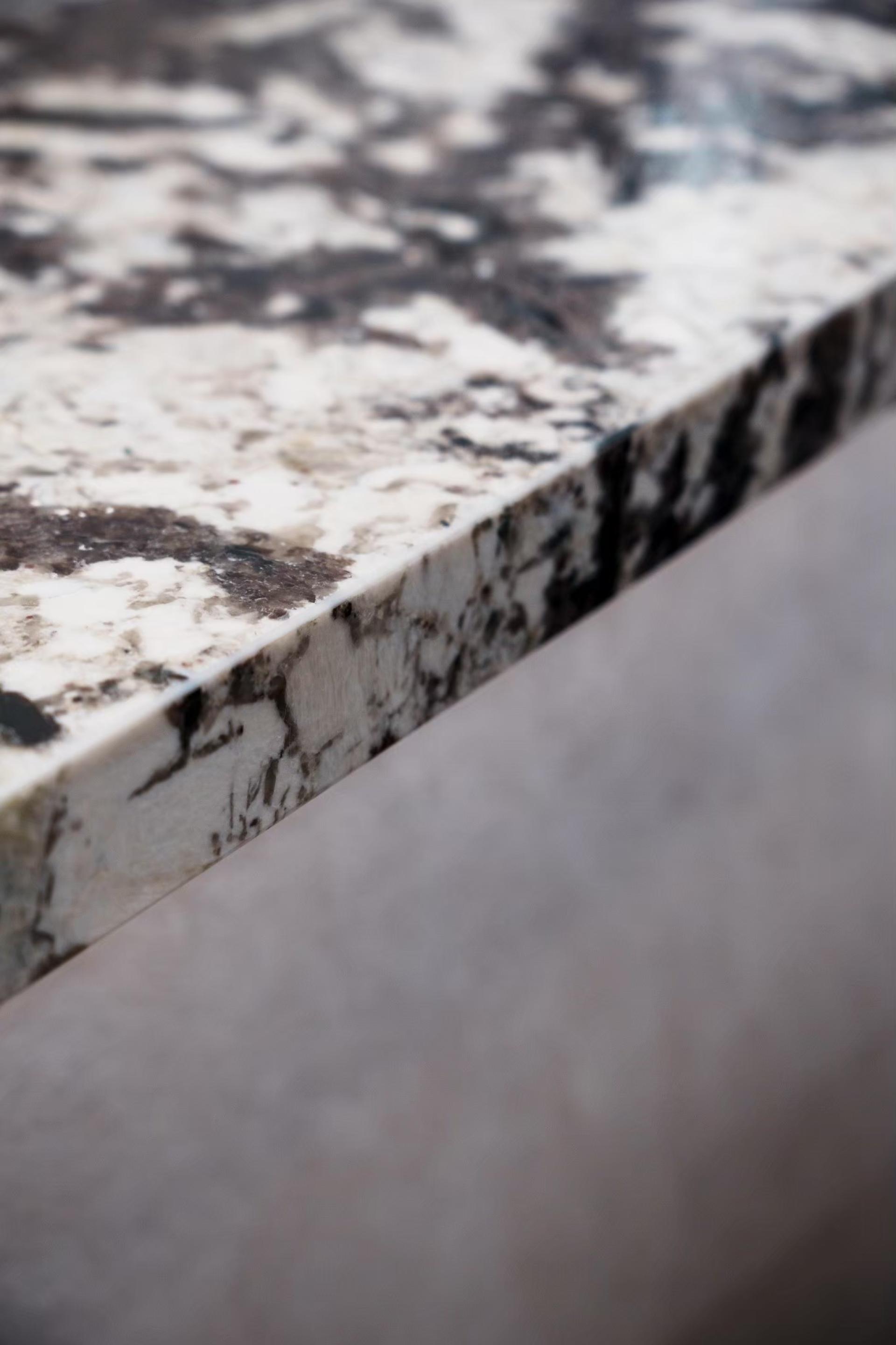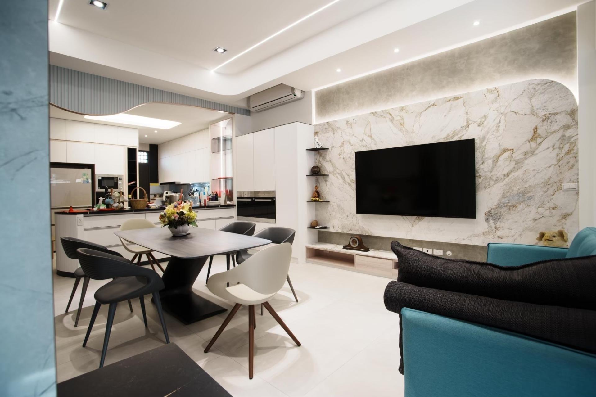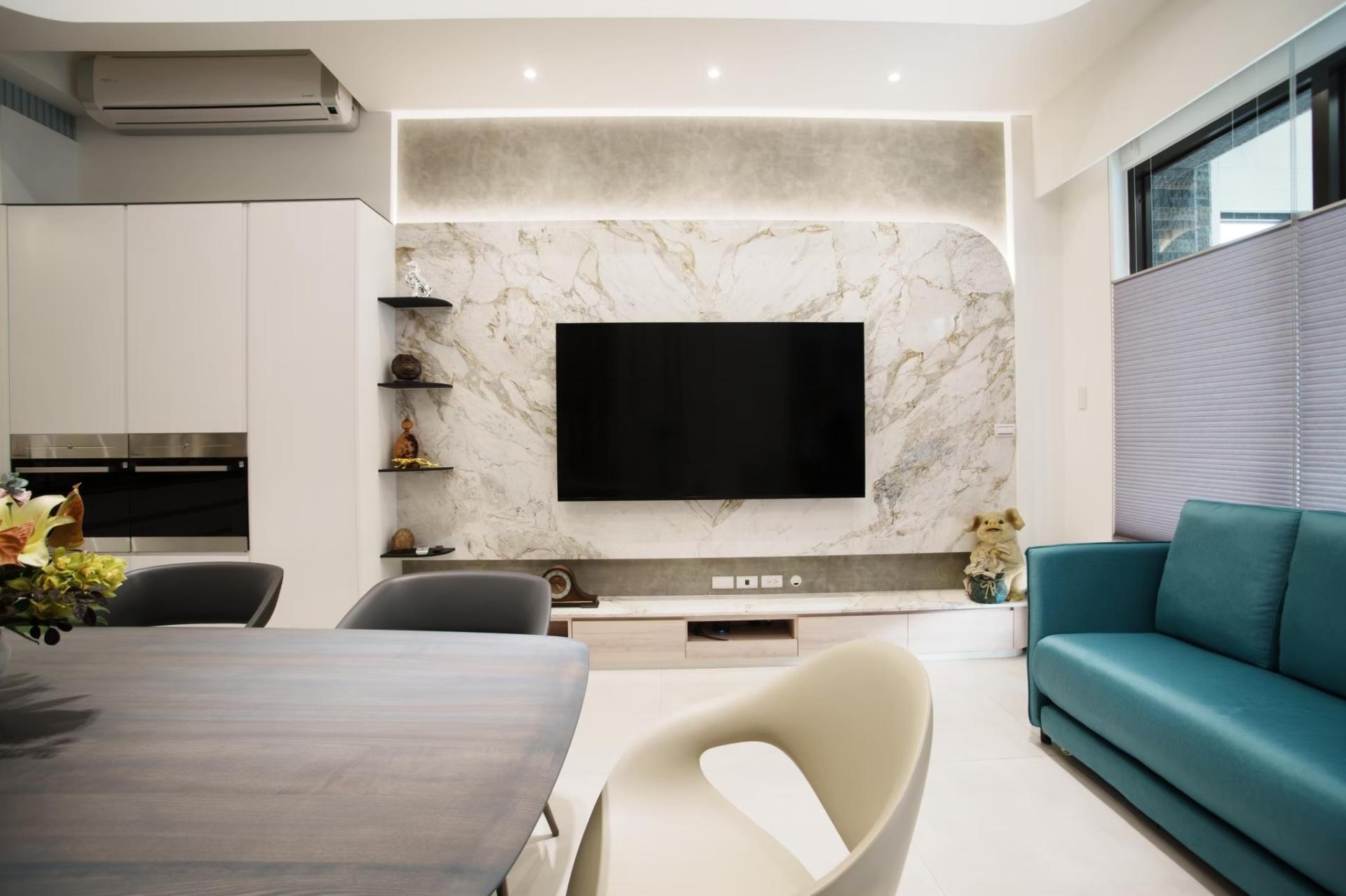 In the owner’s residential space, an independent entryway area is created, and a modeling screen is pulled out on the opposite side of the shoe cabinet. The screen uses partial hollowing design to let the light from public area enter the entryway and improve the visual brightness. The TV wall is a highlight of the overall design, whether the natural dolomite base of gold carving, supplemented by dark grey art paint background wall with white grain , or the white marble substrate , with wood grille forming layers, and geometric three-dimensional cut metal created TV wall, all successfully accentuates the main vision of the public area. Using the middle island decoration and the curved grille shape extending to the ceiling on the wall, the boundary of living area and dining area are cleverly drawn. The bottom of the suspended wave shape is integrated into the titanium-plated material, which pours a gorgeous sense into the field.