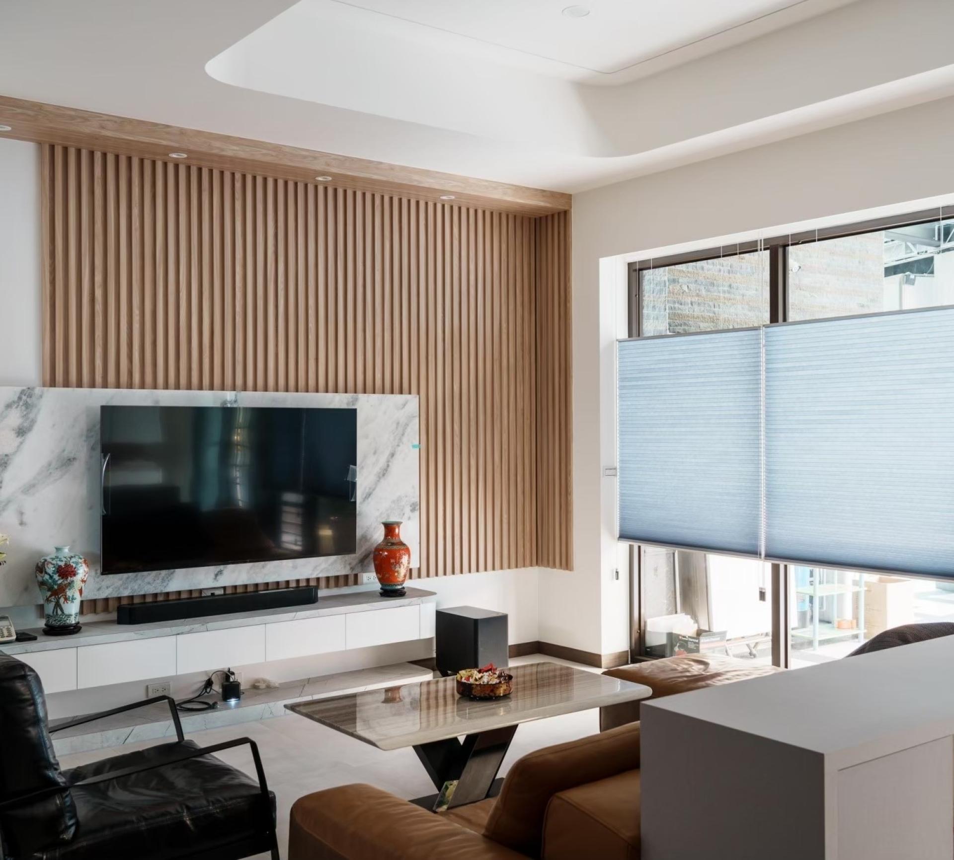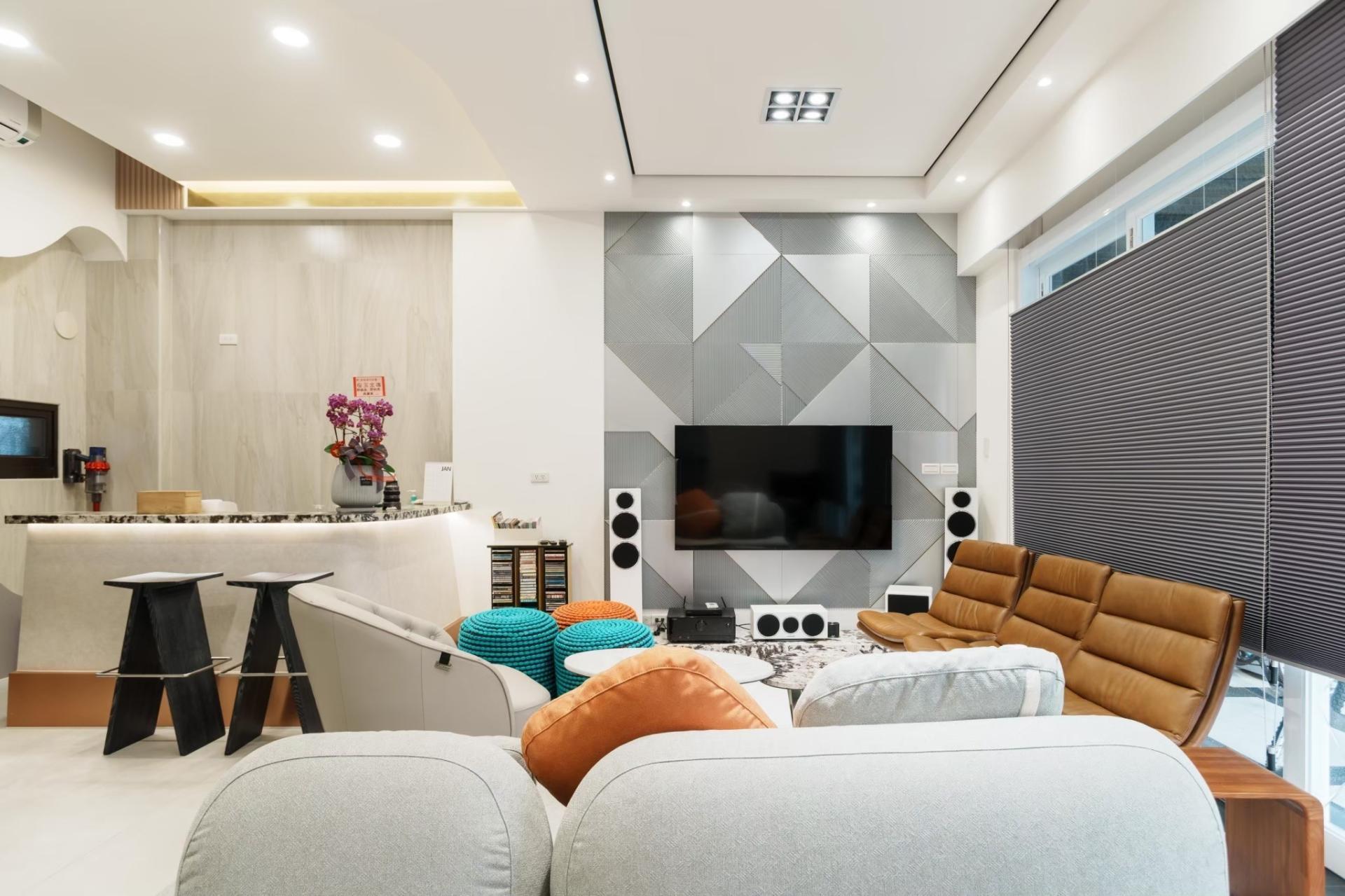 In the residential space for the owner, the grey and white TV wall and the blue grille facade create the characteristics of the textured field. In the space for family gathering, the warm wood grille and honeycomb curtain reflect the warm and gentle beauty. In the space for entertaining guests, the stylish geometric lines, pillows of high-saturation colors, and island bar of metal texture, interweave a rich and diverse social field.