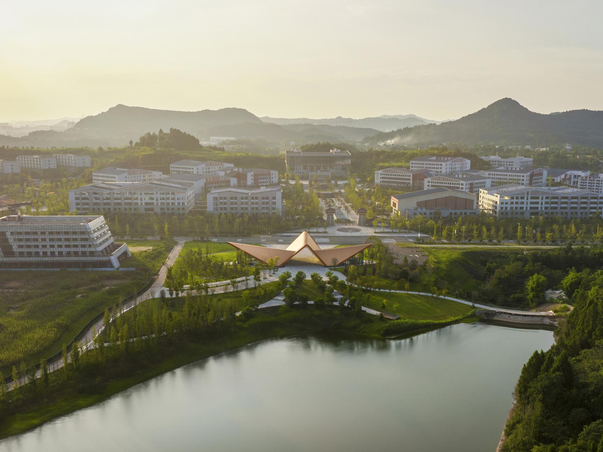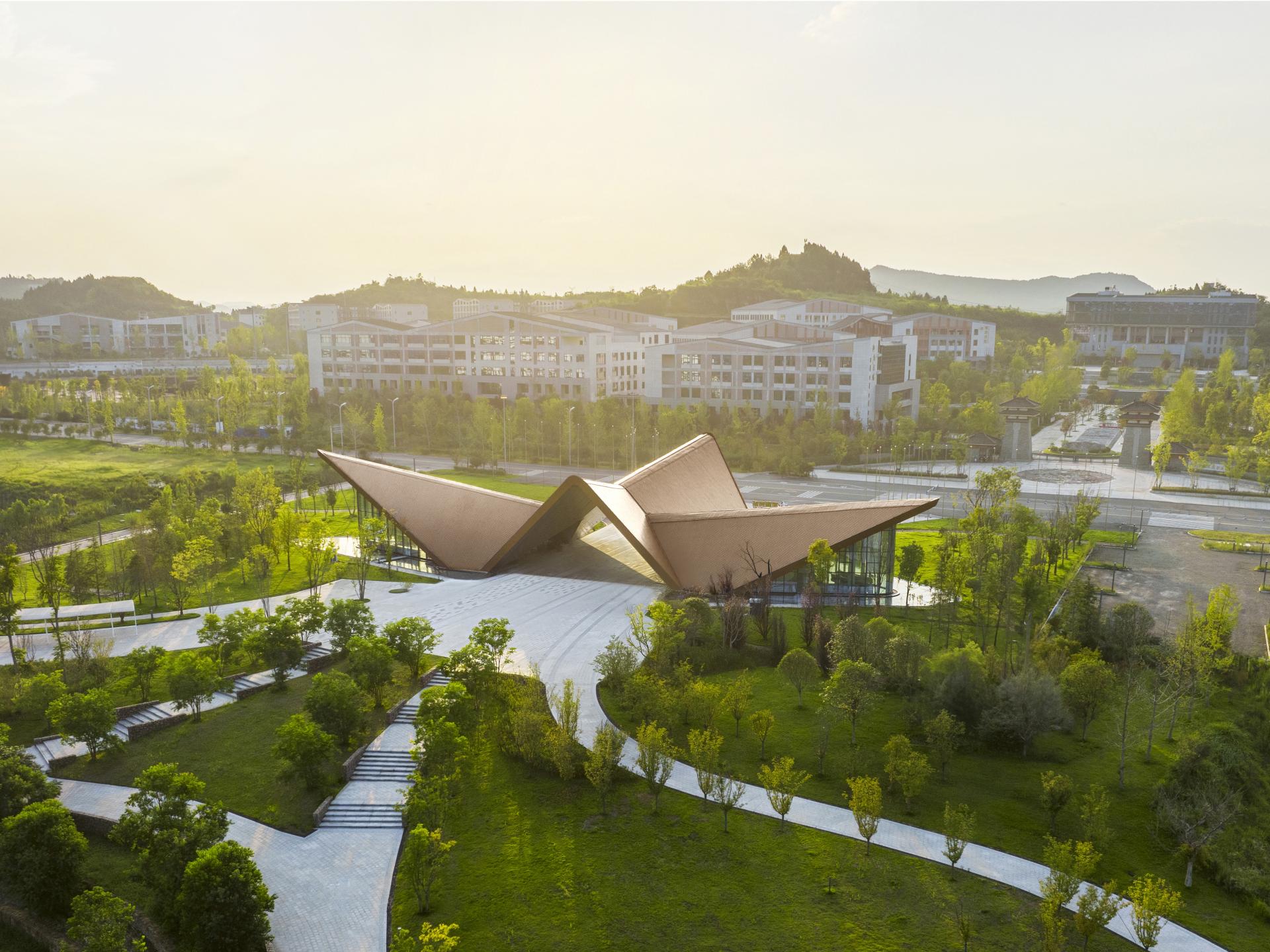 Considering Langzhong's frequent rainy weather, as a response to the local climatic conditions in the Sichuan Basin, the entrance corridor of the visitor center also serves as a place for visitors to gather and linger. It serves as a gateway, as well as a semi-outdoor buffer space connecting the wings. The indoor space under wings is completely enclosed by transparent curved floor glass, incorporating a beautiful natural landscape view around and collectively shaping a "plug-in" space that blends technology and natural beauty with the golden wings.