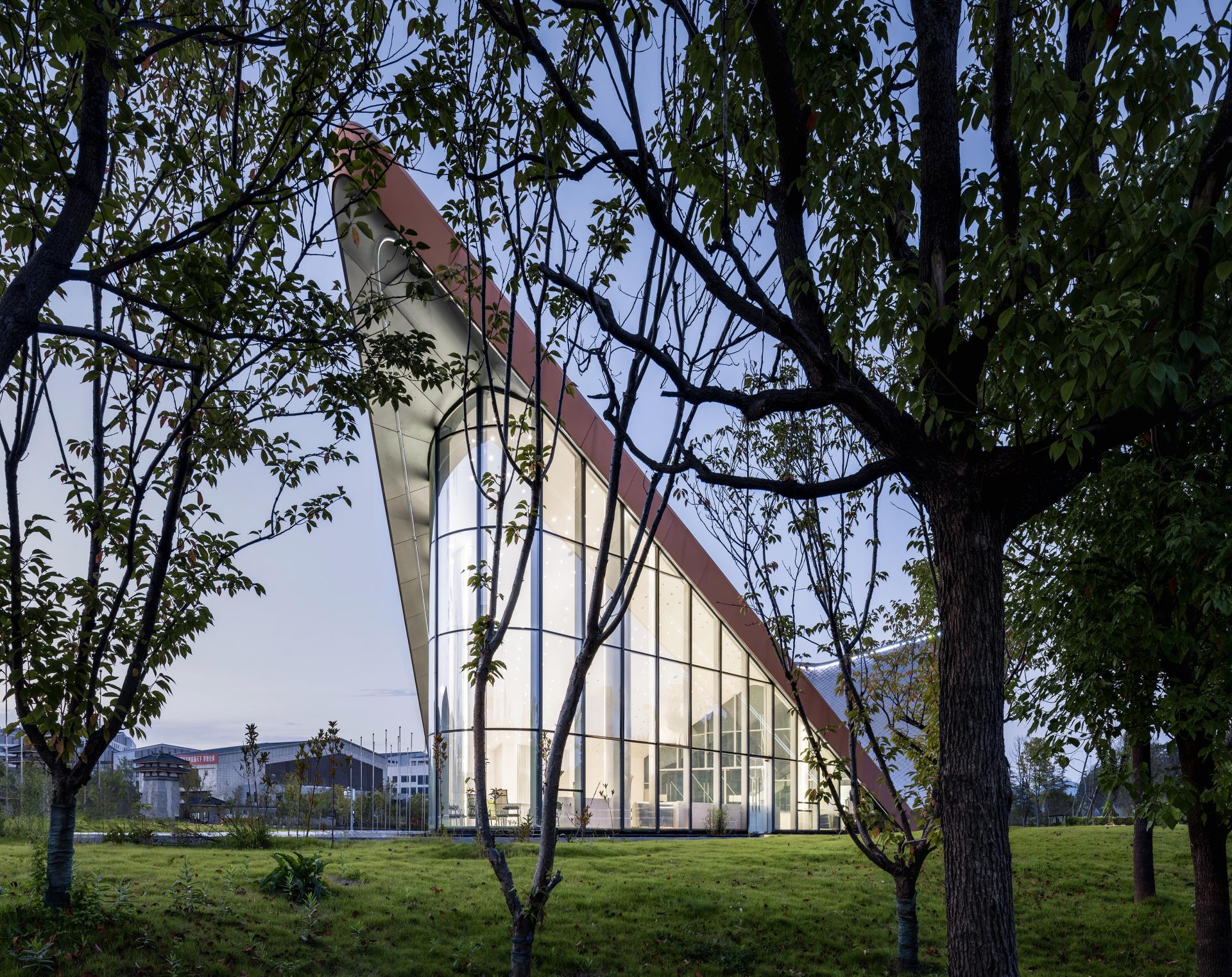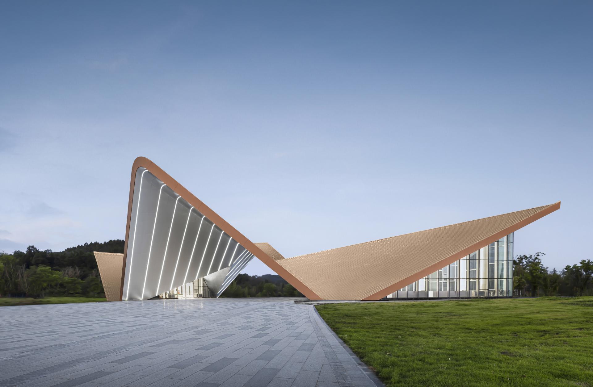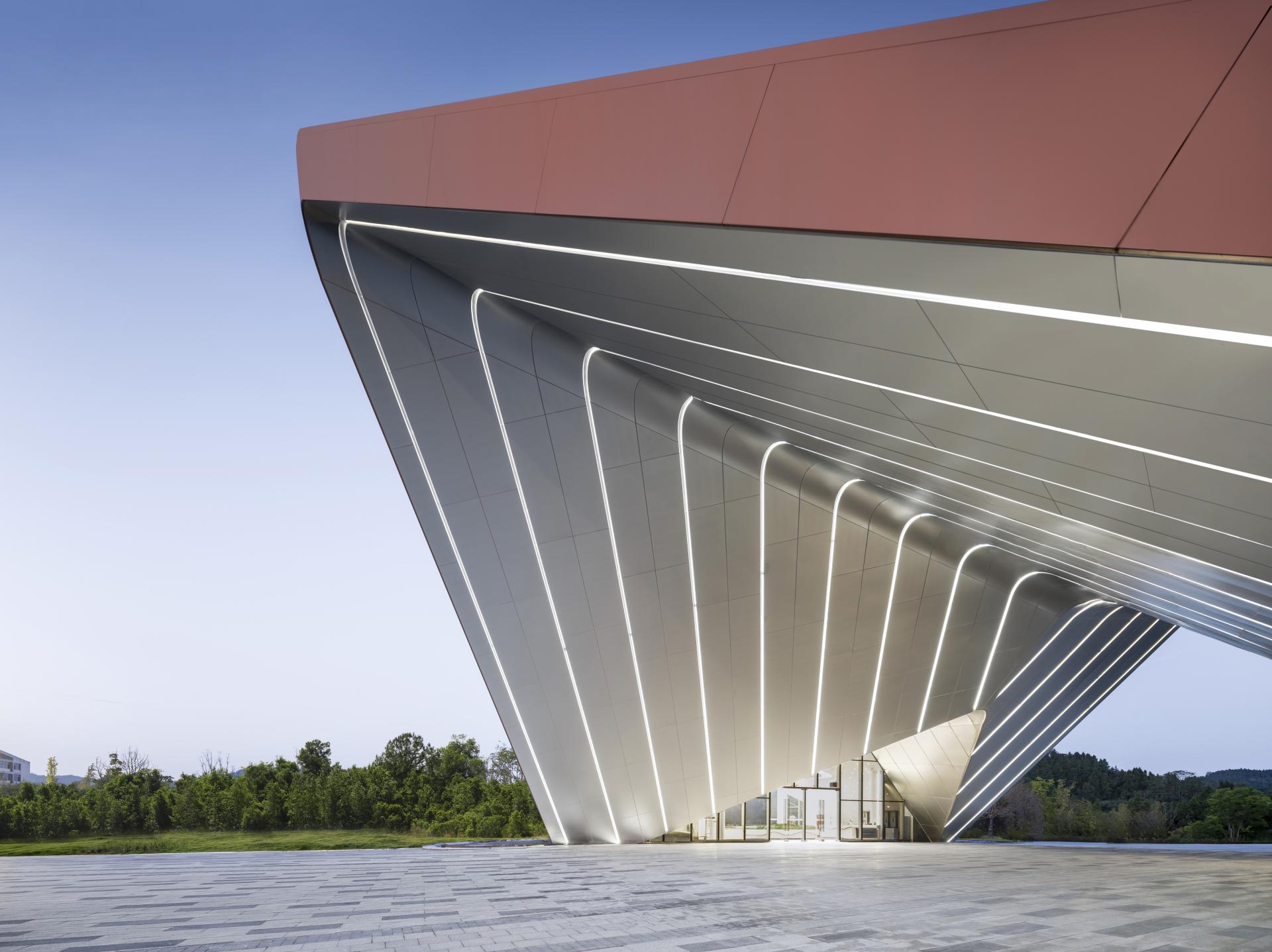 Based on the integrated concept of form and structure, we employ a steel structure-the large-span spatial form constitutes the supporting structure. After several rounds of adjustments, the sense of lightness is sculpted. The large overhanging eaves combined with the curved wings present an image of soaring architecture. Meanwhile, to reply to the clean and powerful form, and the themes of sports and esports, we primarily use modern lightweight materials such as strip aluminum panels, metal composite tiles, and glass curtain walls instead of common heavy rural materials, creating a contrast with the natural landscape to achieve a light integration into the surrounding.