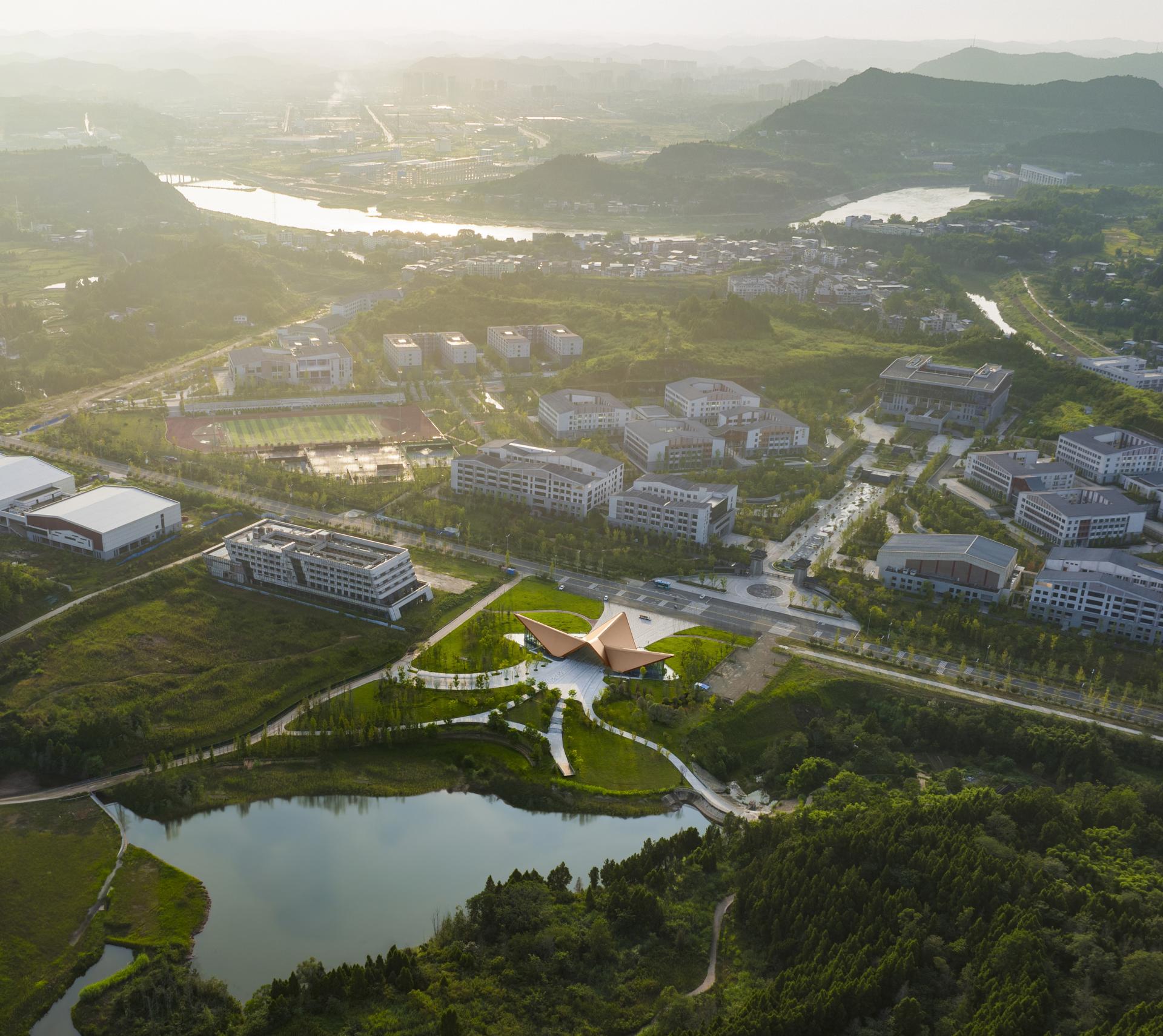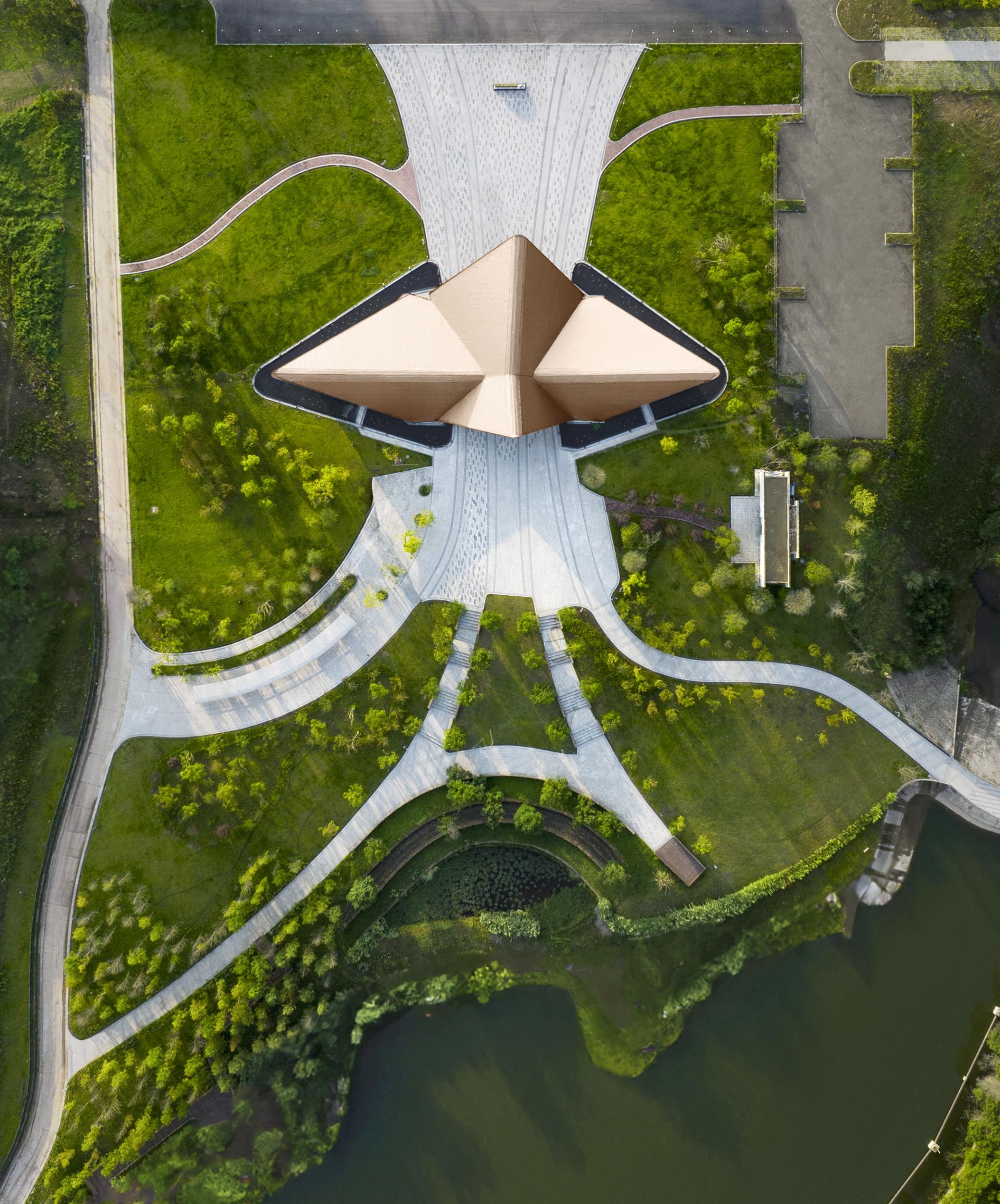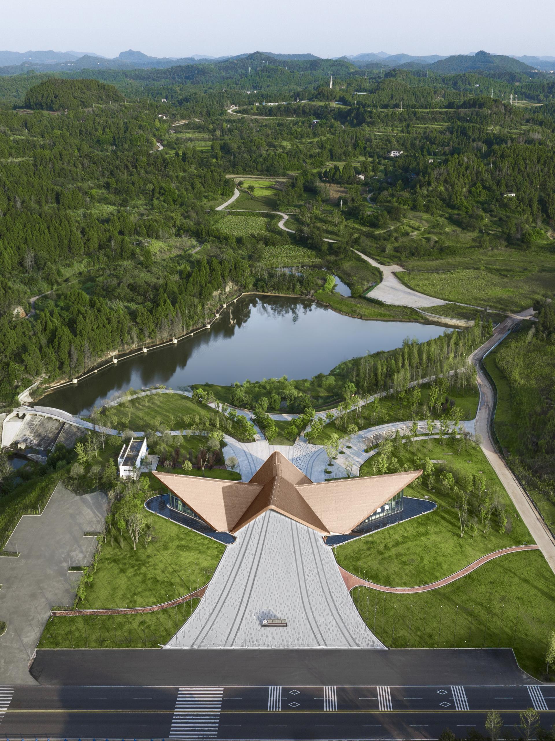 The project is located in Langzhong China, serving as the visitor center and the scenic entrance for the Starsallianz Sports Town. The site is located between the Jialing River and majestic mountains. So, the architectural posture in the landscape became our focus. The visitor center adopts a star-shaped form with four corners. Two front corners open towards the entrance plaza and the interior of the scenic area, connecting the inside and outside to define the "gateway" space. These corners also serve as frames to capture the continuous mountain and water to the visitors. The two lateral corners function as ticketing, exhibition and relaxation respectively.