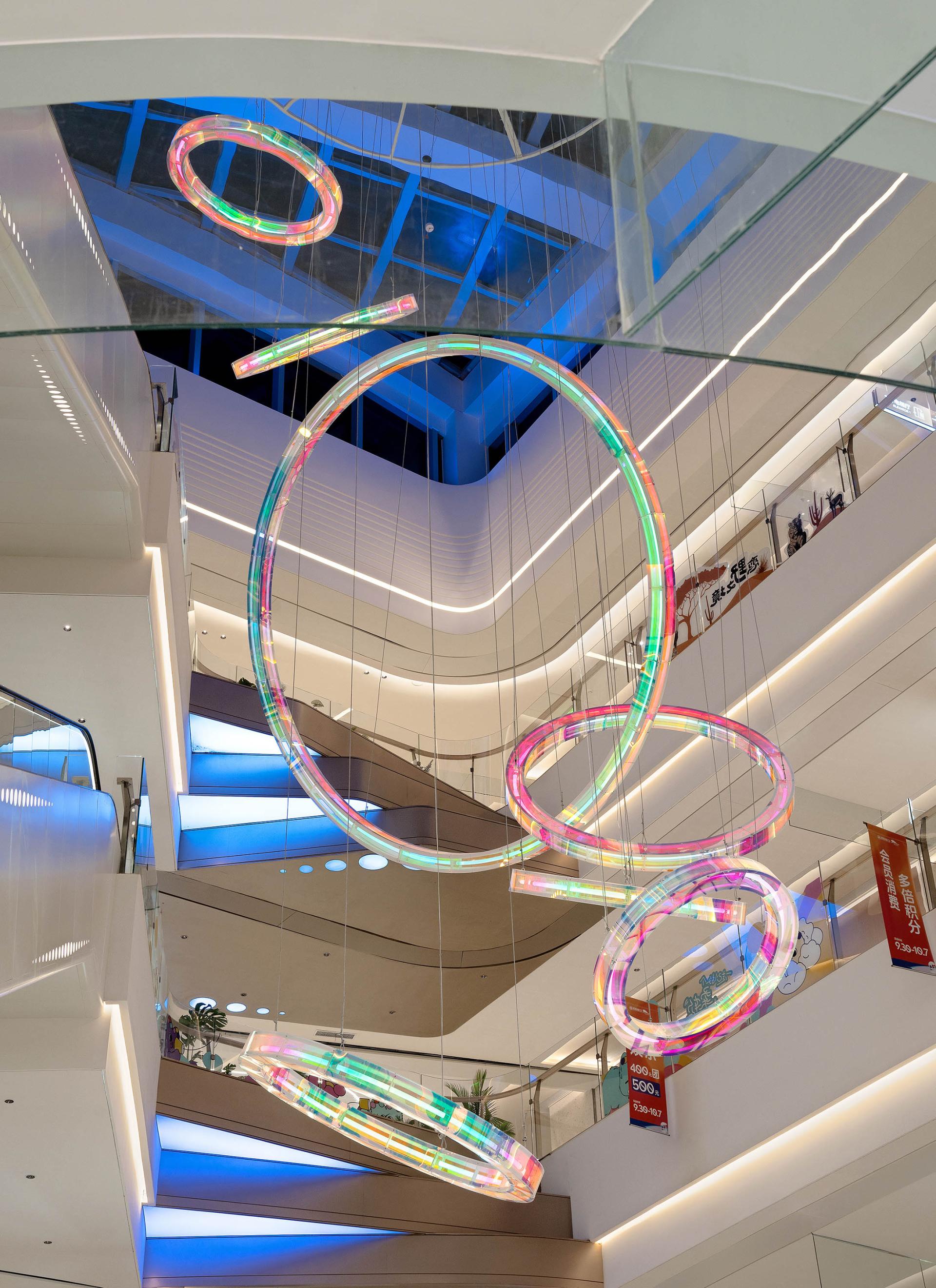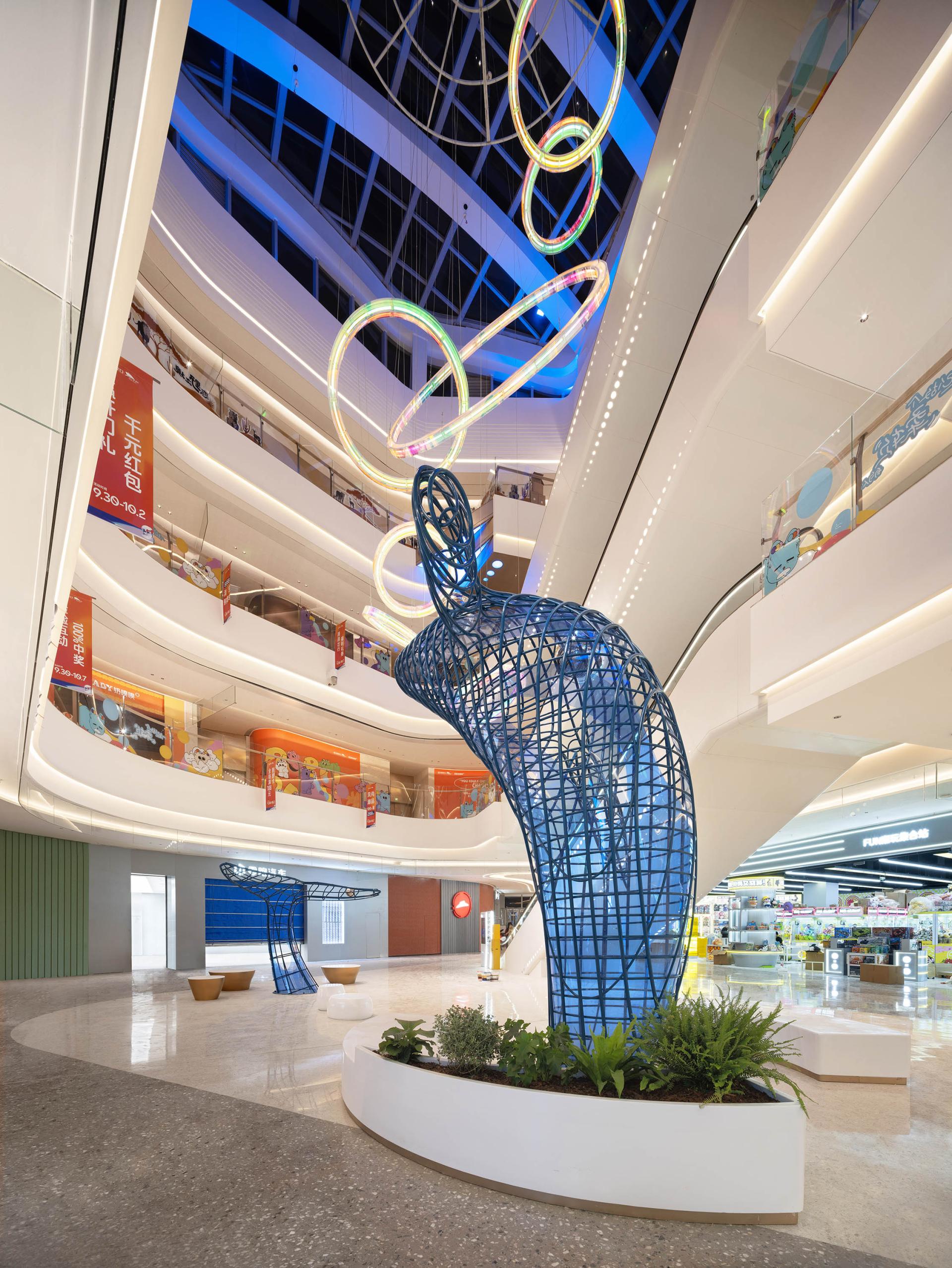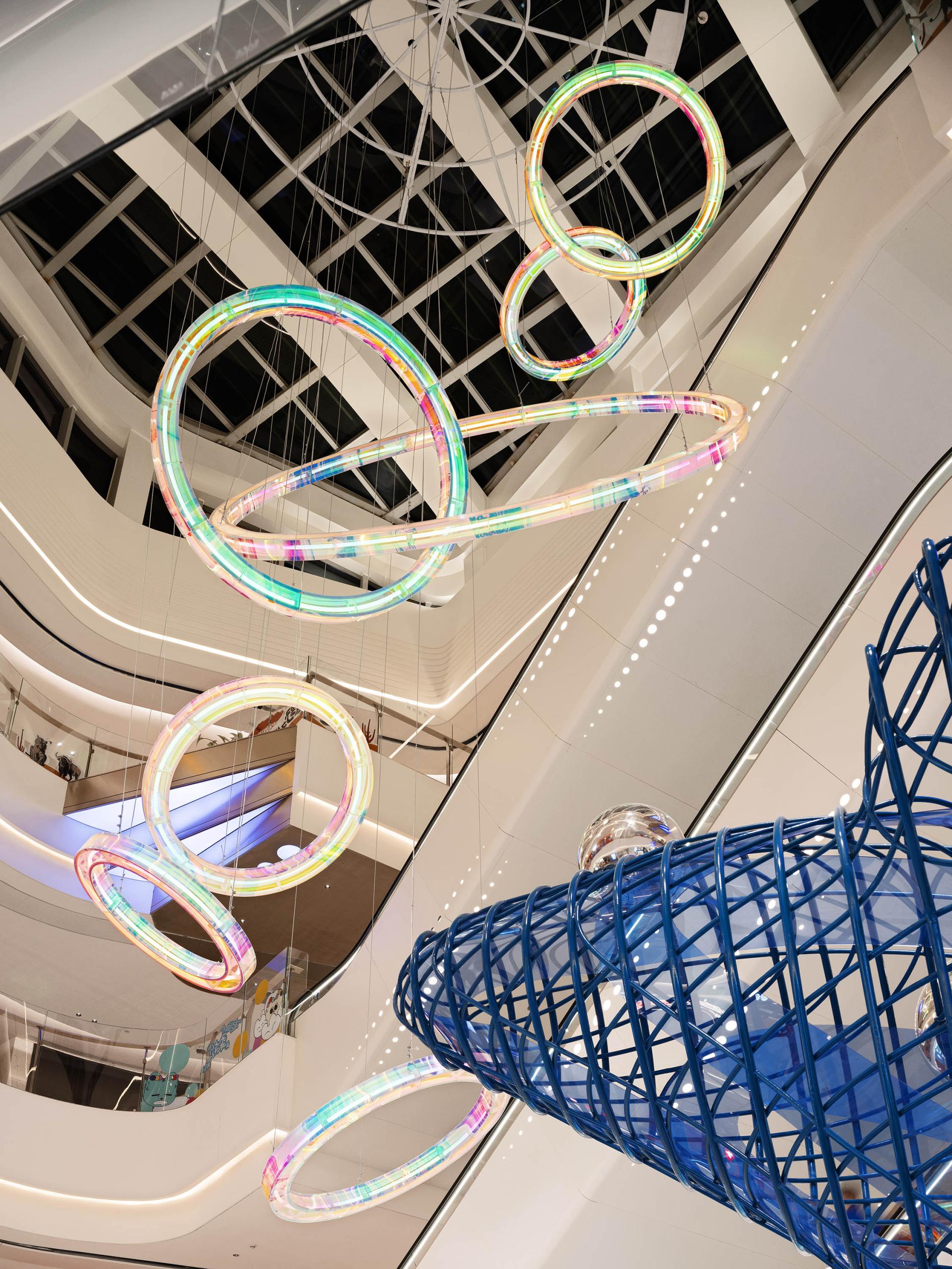 The Whale Gorge theme area in B4 atrium uses a hollow whale sculpture design combined with circular hanging elements to express the whale jumping into the sea and splashing colorful water droplets through colorful film and lighting, vividly presenting the visual effect of the whale jumping into the sea.