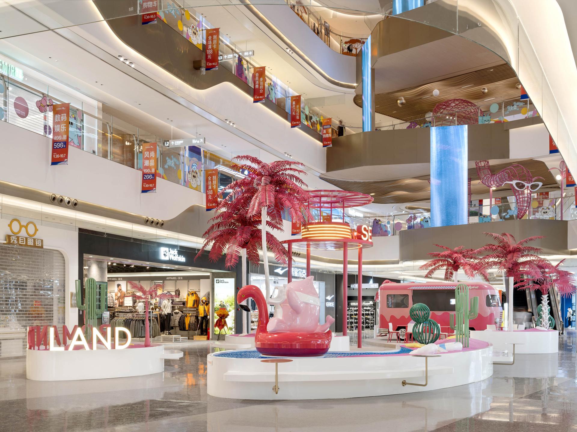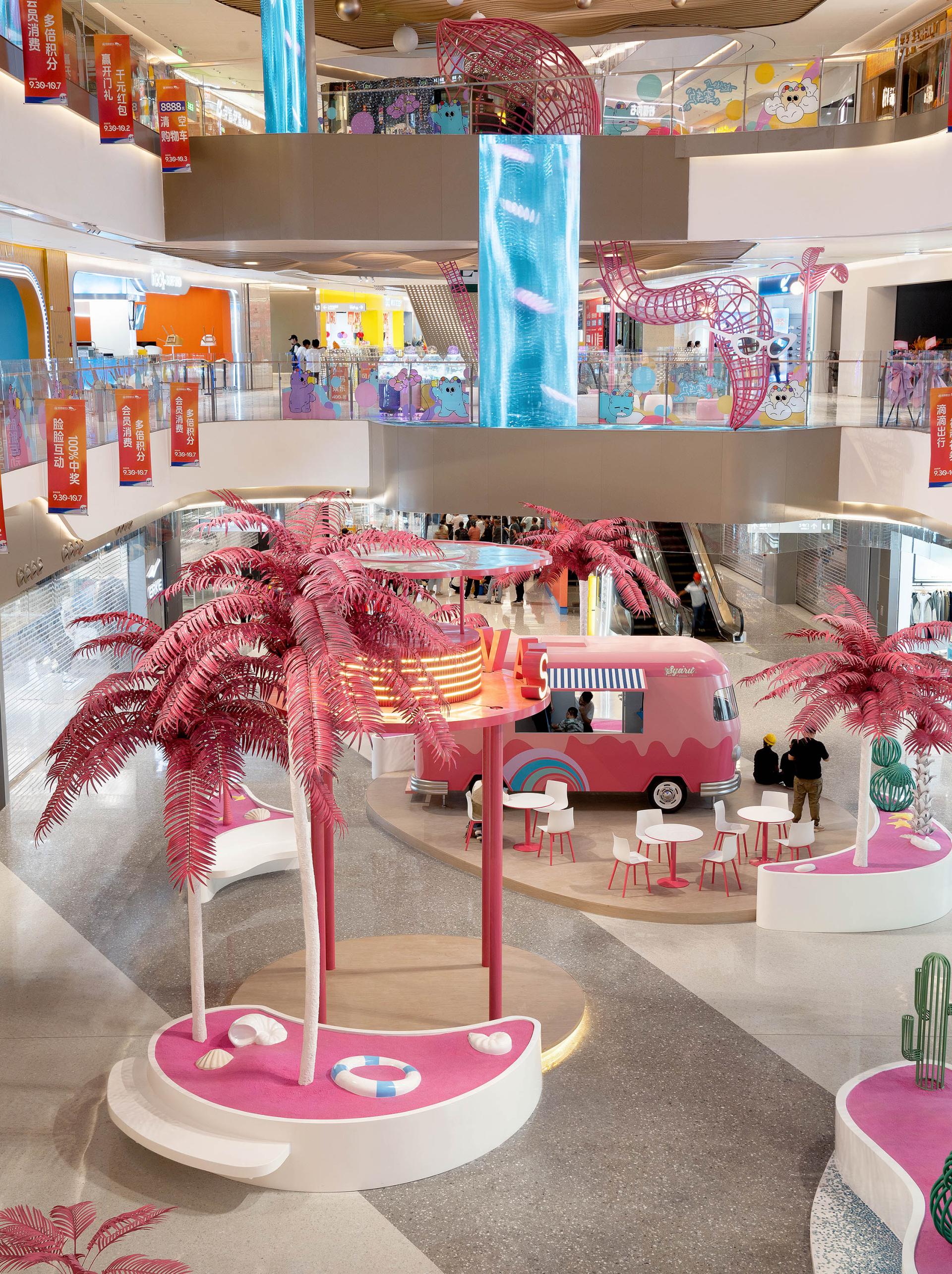 The Romantic Pink theme area in B3 atrium features a pink crescent-shaped beach, swaying palm trees, jellyfish-colored ocean, and vacation-themed cars. The cross-layer installation us