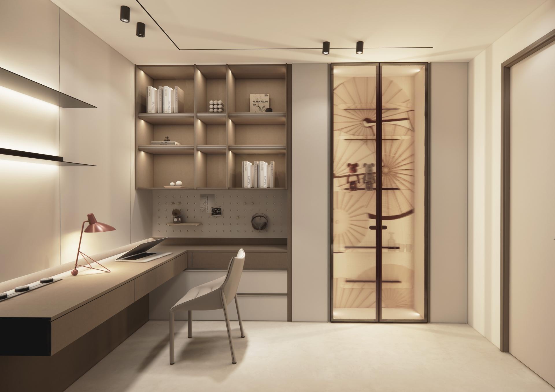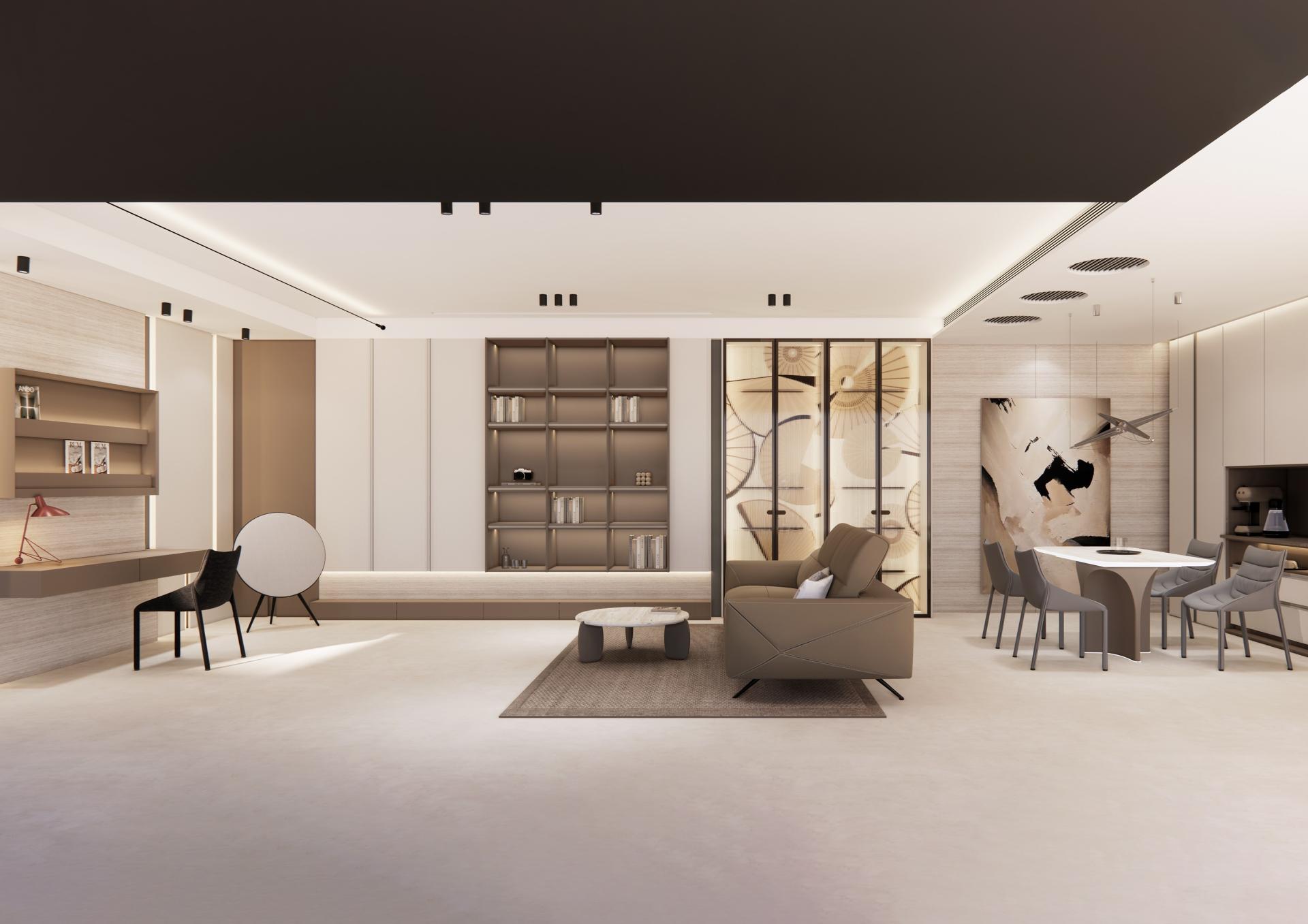 The design team focuses on the idea of 'home', prioritizing user needs. By moving beyond traditional space layouts and incorporating powder-coated open shelving and suspended glass laminates, the team creates a family library. This innovative approach enhances the multifunctionality of public spaces, transforming the living room into a personalized and practical area that encourages both social interaction and reading. It not only ensures a smoother flow throughout the space but also fosters an open and free atmosphere suited for contemporary families.