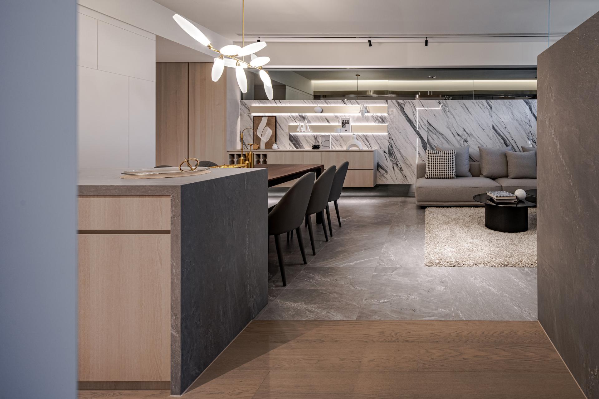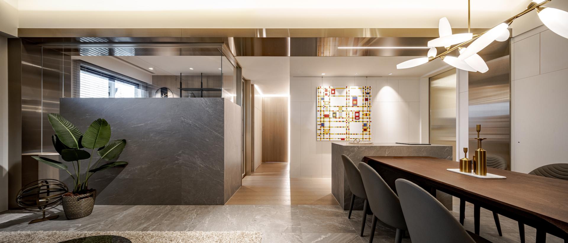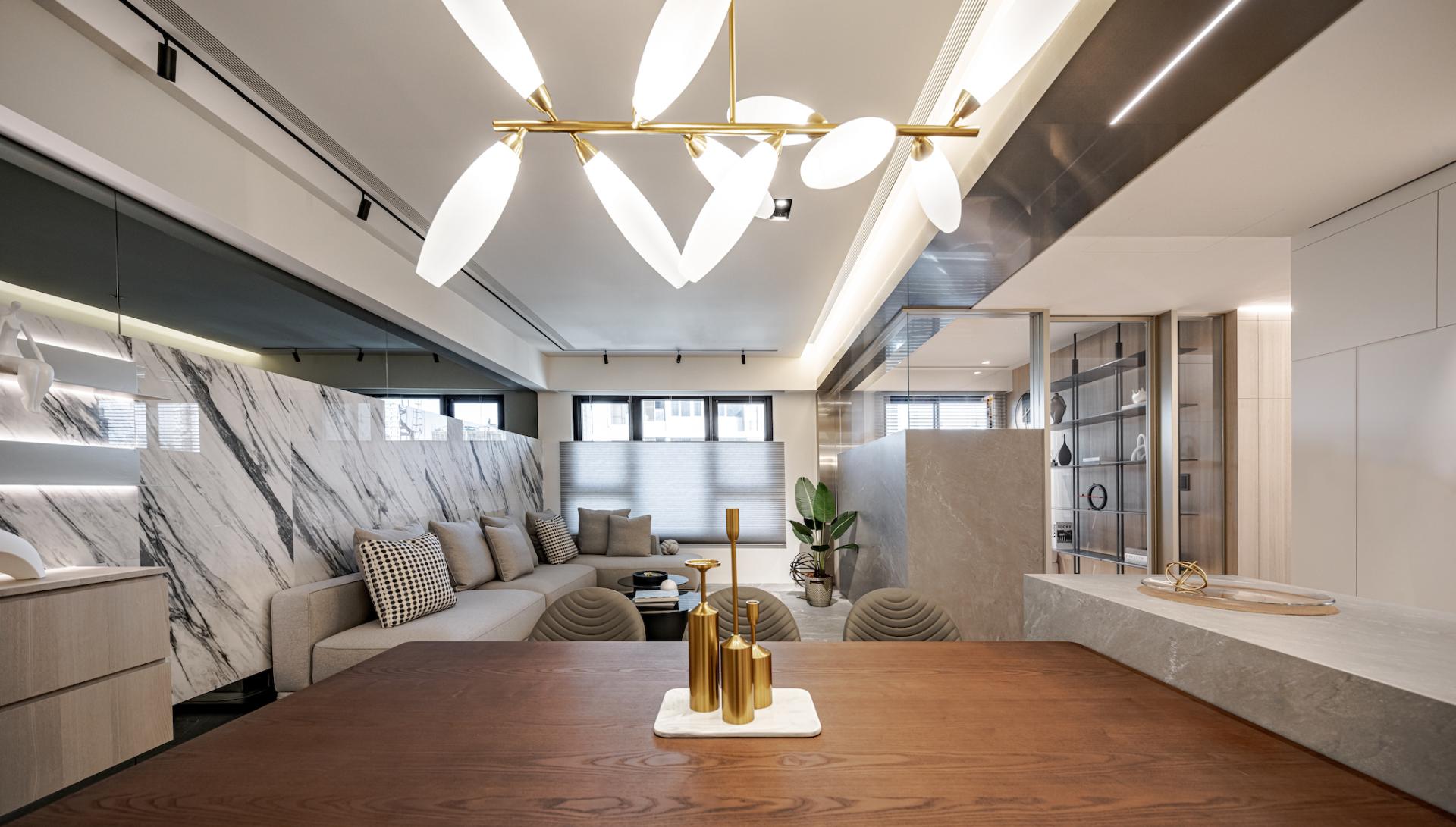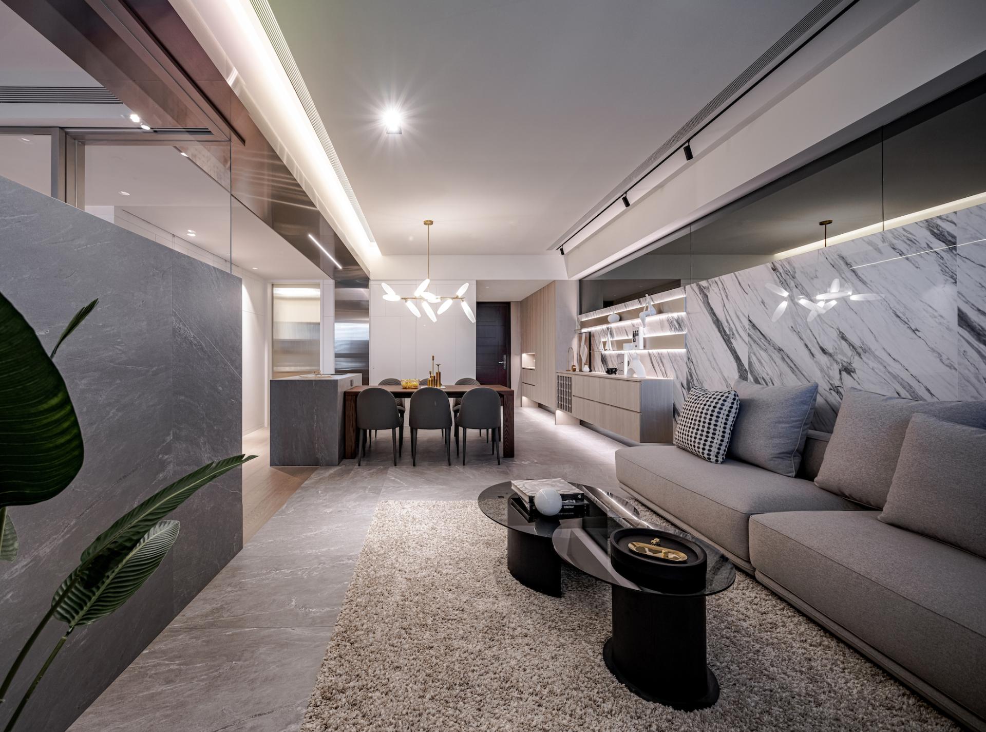 -Rebalancing the Living Room Proportion: The living room’s width is significantly narrower than the dining area, giving it a visually smaller look. Instead of the traditional approach of concealing large beams, the designers boldly emphasized the beam spanning between the living and dining areas with a silver titanium-plated panel. This solution not only cleverly mitigates the visual limitations of the narrower living room but also aligns the titanium panel’s lines with the flooring transitions, clearly defining the different areas and enhancing the space’s uniqueness while adding depth of field.
