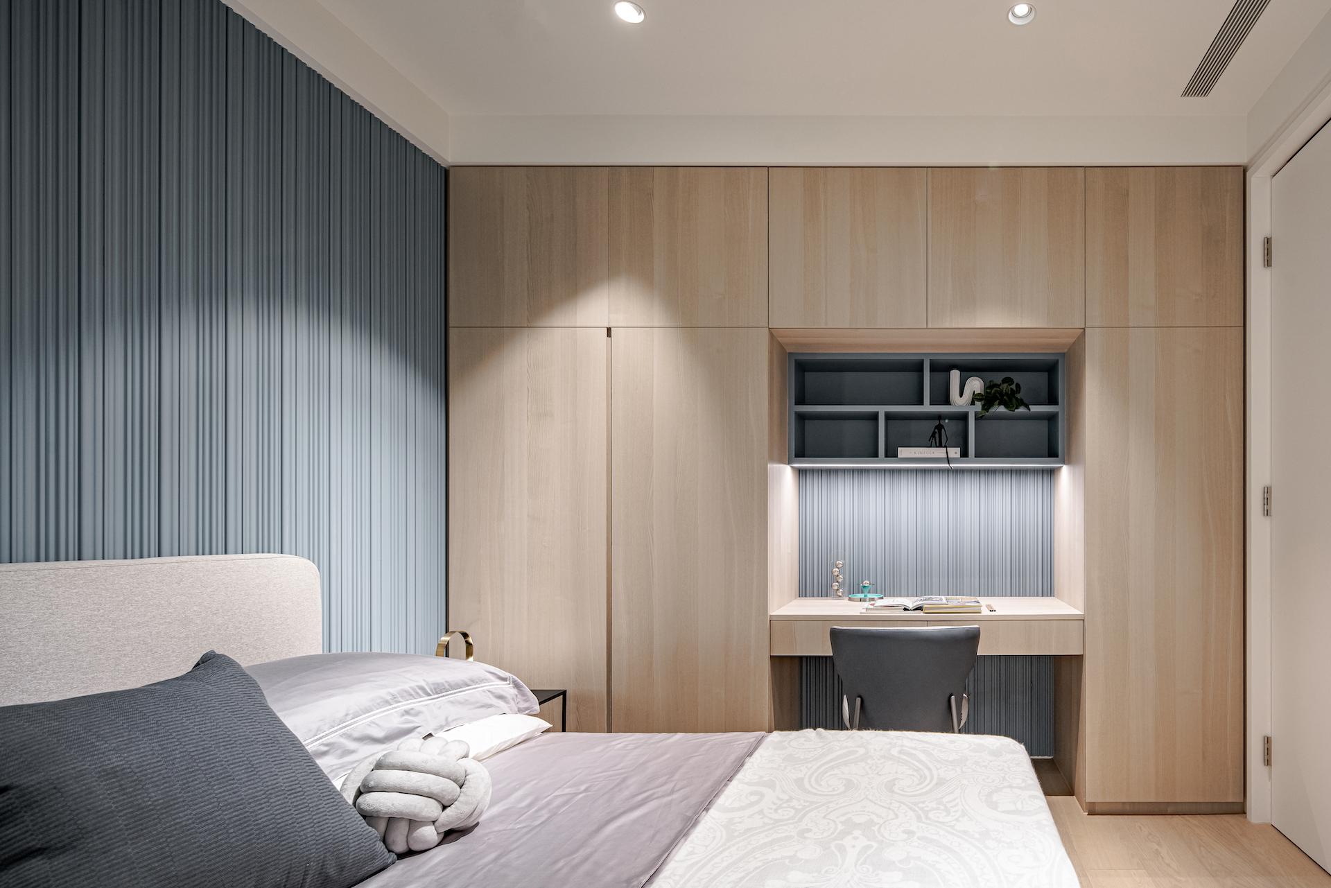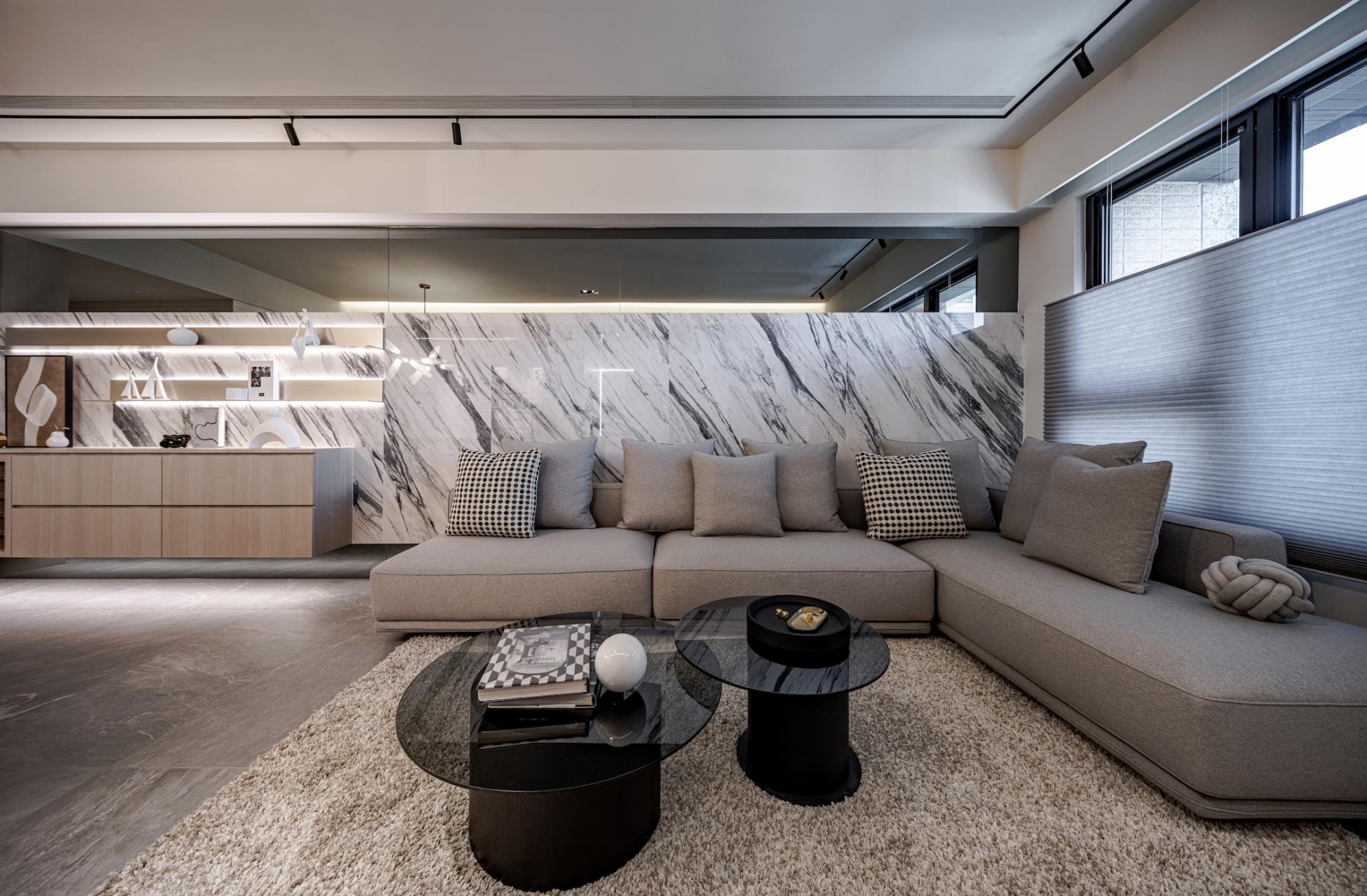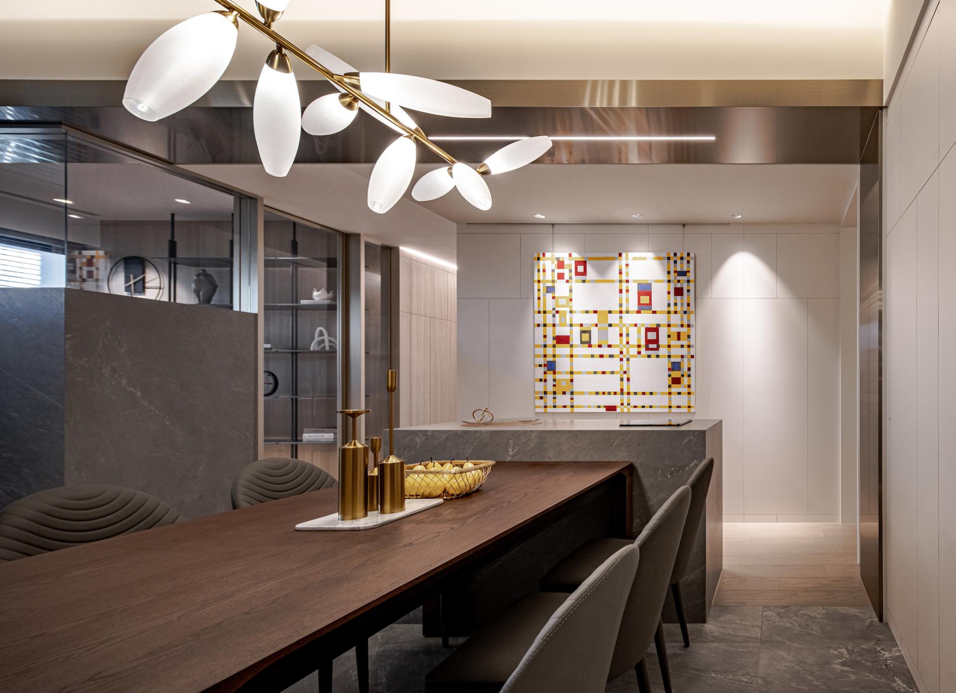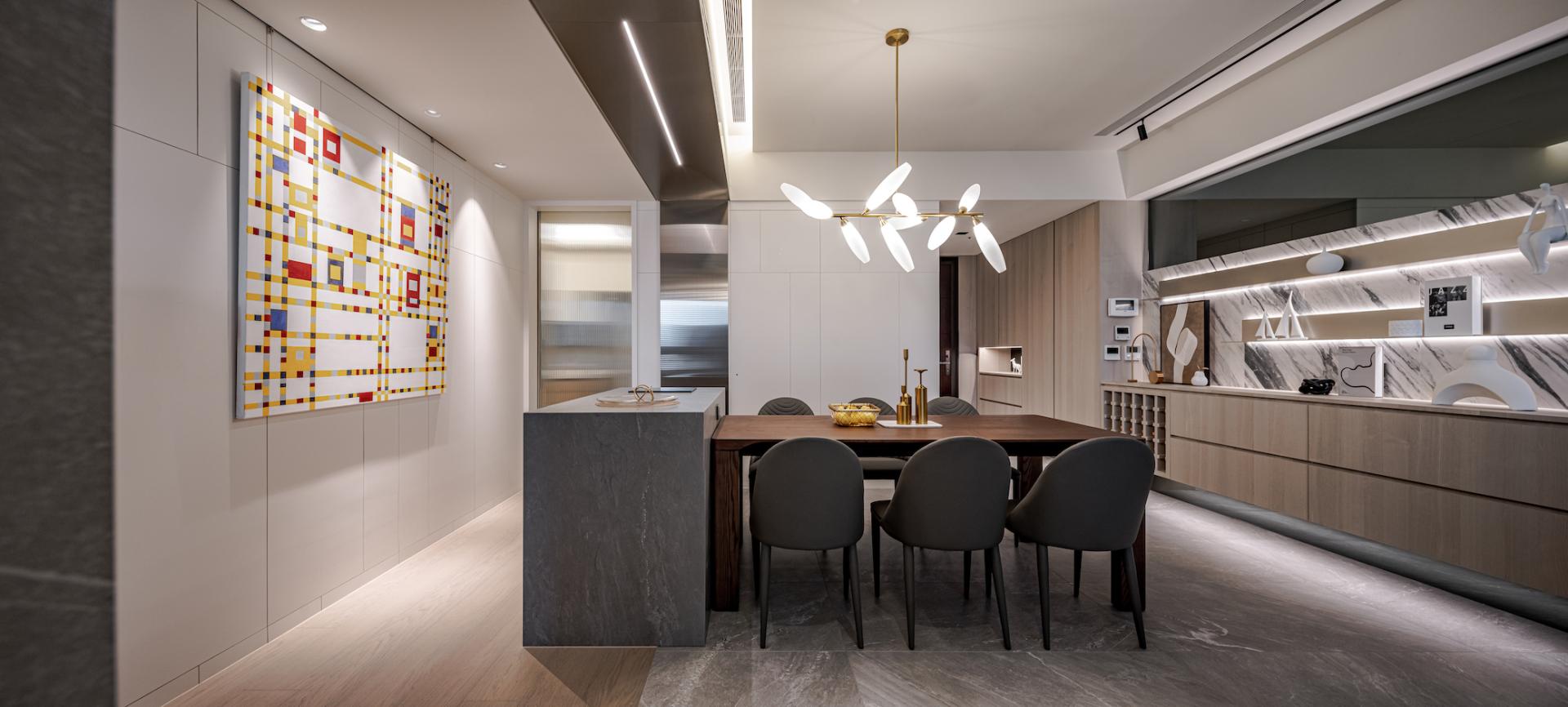 -Rebalancing the Living Room Proportion: The living room’s width is significantly narrower than the dining area, giving it a visually smaller look. Instead of the traditional approach of concealing large beams, the designers boldly emphasized the beam spanning between the living and dining areas with a silver titanium-plated panel. This solution not only cleverly mitigates the visual limitations of the narrower living room but also aligns the titanium panel’s lines with the flooring transitions, clearly defining the different areas and enhancing the space’s uniqueness while adding depth of field.