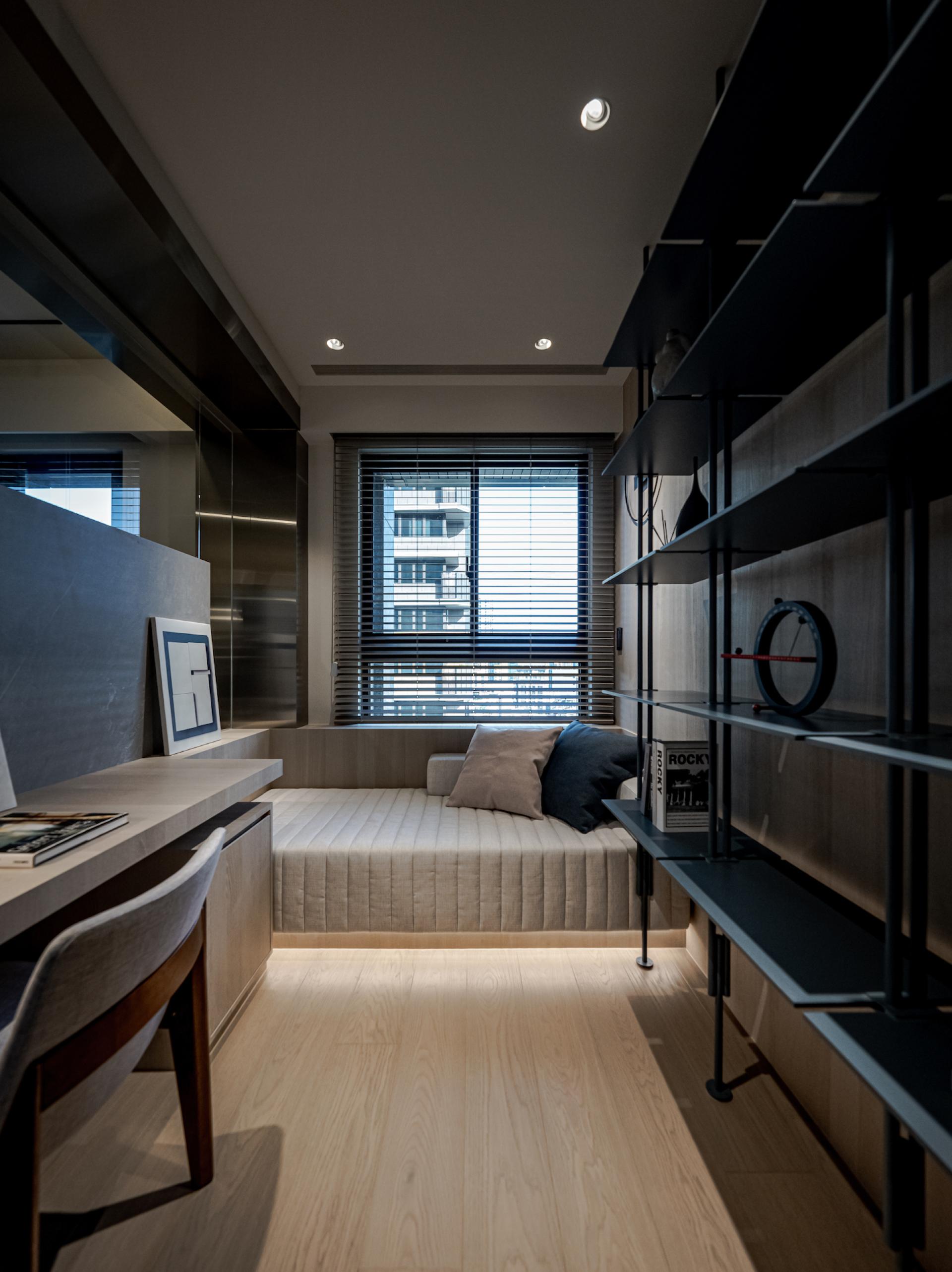 -Enhancing Visual Transparency: Behind the TV wall, the designers created a multifunctional room with a daybed, which serves multiple purposes such as sleeping, working, and relaxing. The ceiling above this area is left open and complemented with glass to create an extended visual effect, solving the initial imbalance in the social area’s proportions. Additionally, the bookshelf in the multifunctional room is crafted from iron, which, when viewed through the living room, complements the glass and iron’s lightness, adding a sense of openness and cohesion to the space.