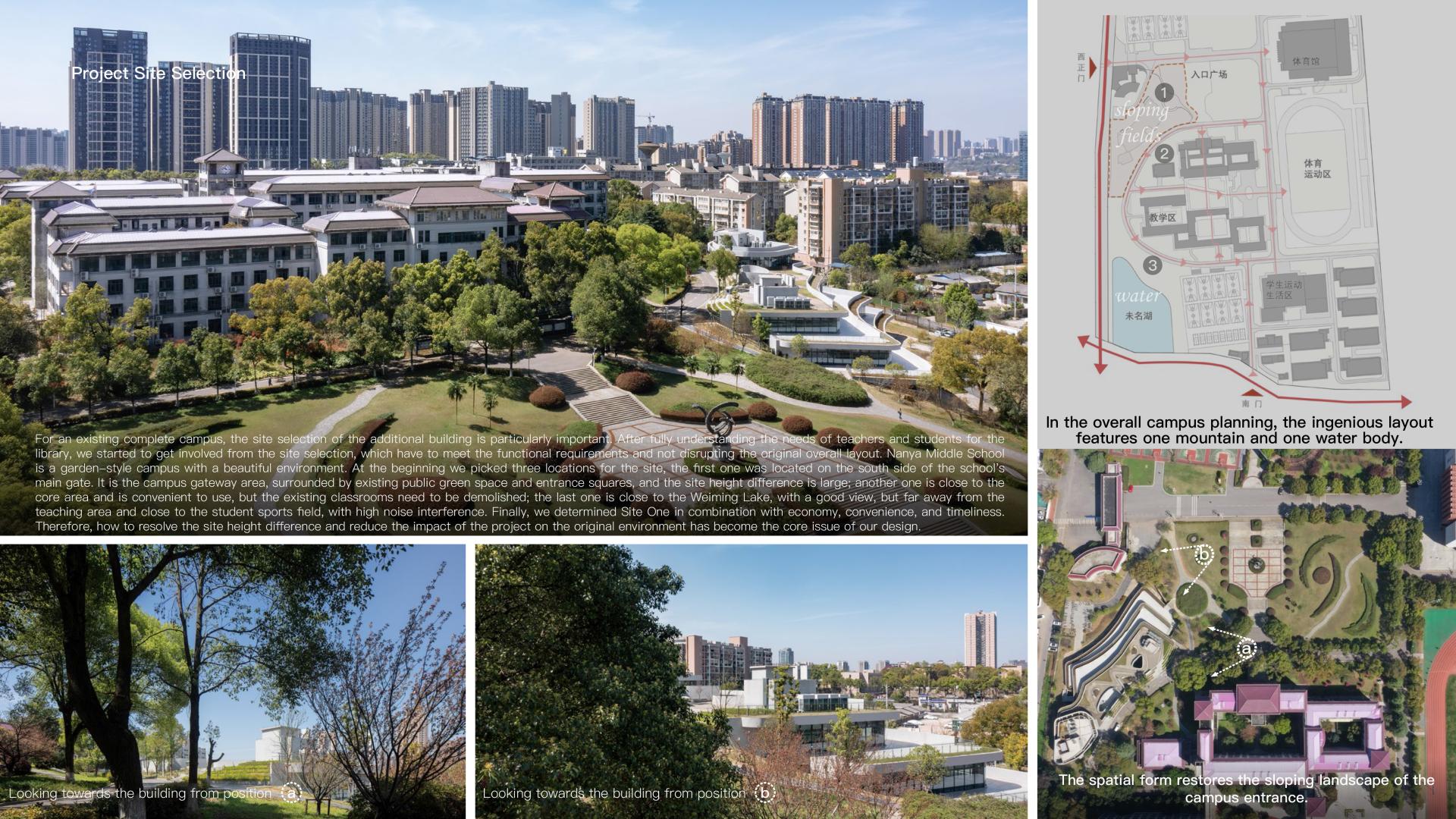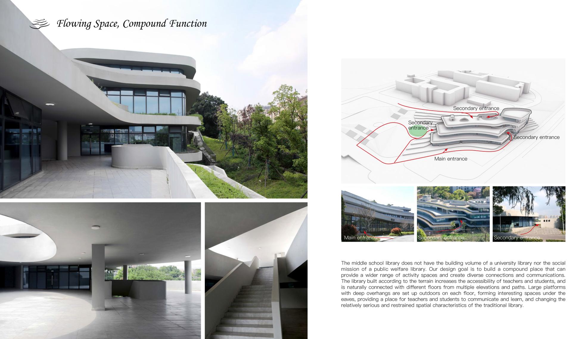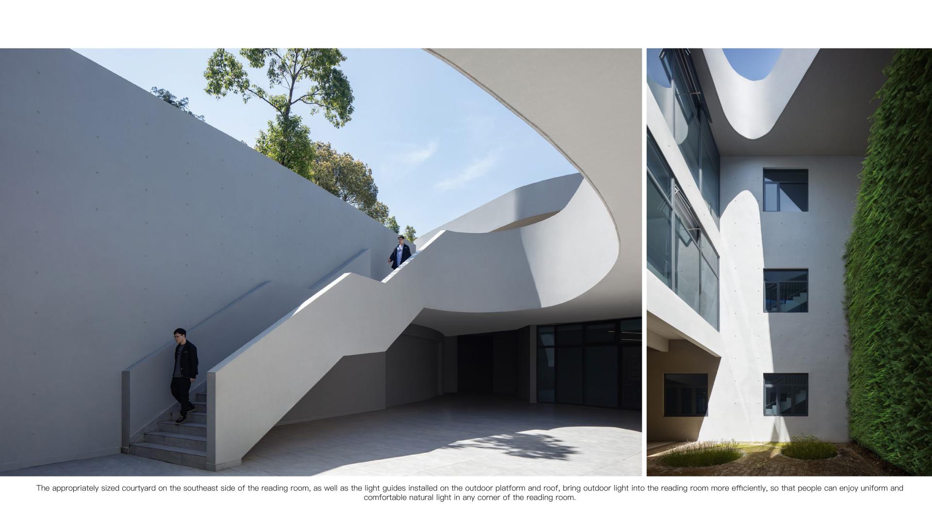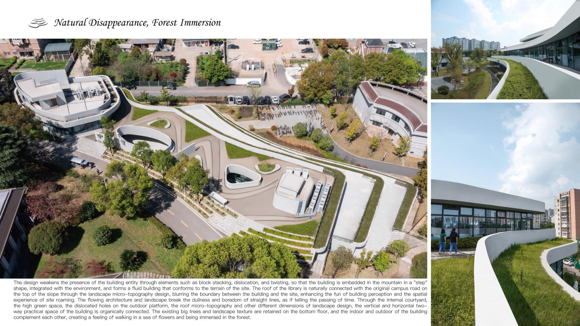 This project is to build a new library for Nanya Middle School, located in the entrance area of the campus, cleverly utilizing the sloping terrain to create a unique image of "elegant charm of the book mountain". The library adopts a three-level terrace design, with a curved outer corridor seamlessly integrated with the surrounding environment, creating an open and hidden space on the slope. The internal space of the library is fluid and functionally complex, providing diverse activity spaces and promoting communication between teachers and students. At the same time, the design focuses on natural disappearance, using techniques such as stacking and shifting blocks to integrate the building with the environment, creating a roaming experience of "forest in its surroundings". In terms of green and low-carbon, a passive priority and active optimization strategy is adopted to set up ventilation ducts, eaves, inner courtyards, light pipes, etc., improve the ventilation status, and achieve efficient lighting; The support is detached from the outer wall of the building, and the bottom layer of the building is partially elevated, which is conducive to slope drainage and can prevent water seepage and moisture in the building, demonstrating the design concept of sustainable development.