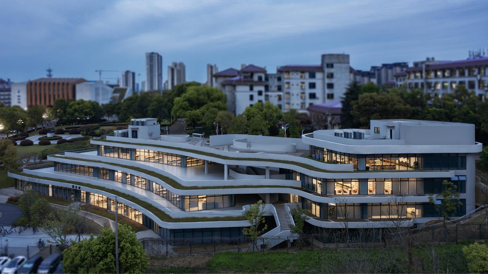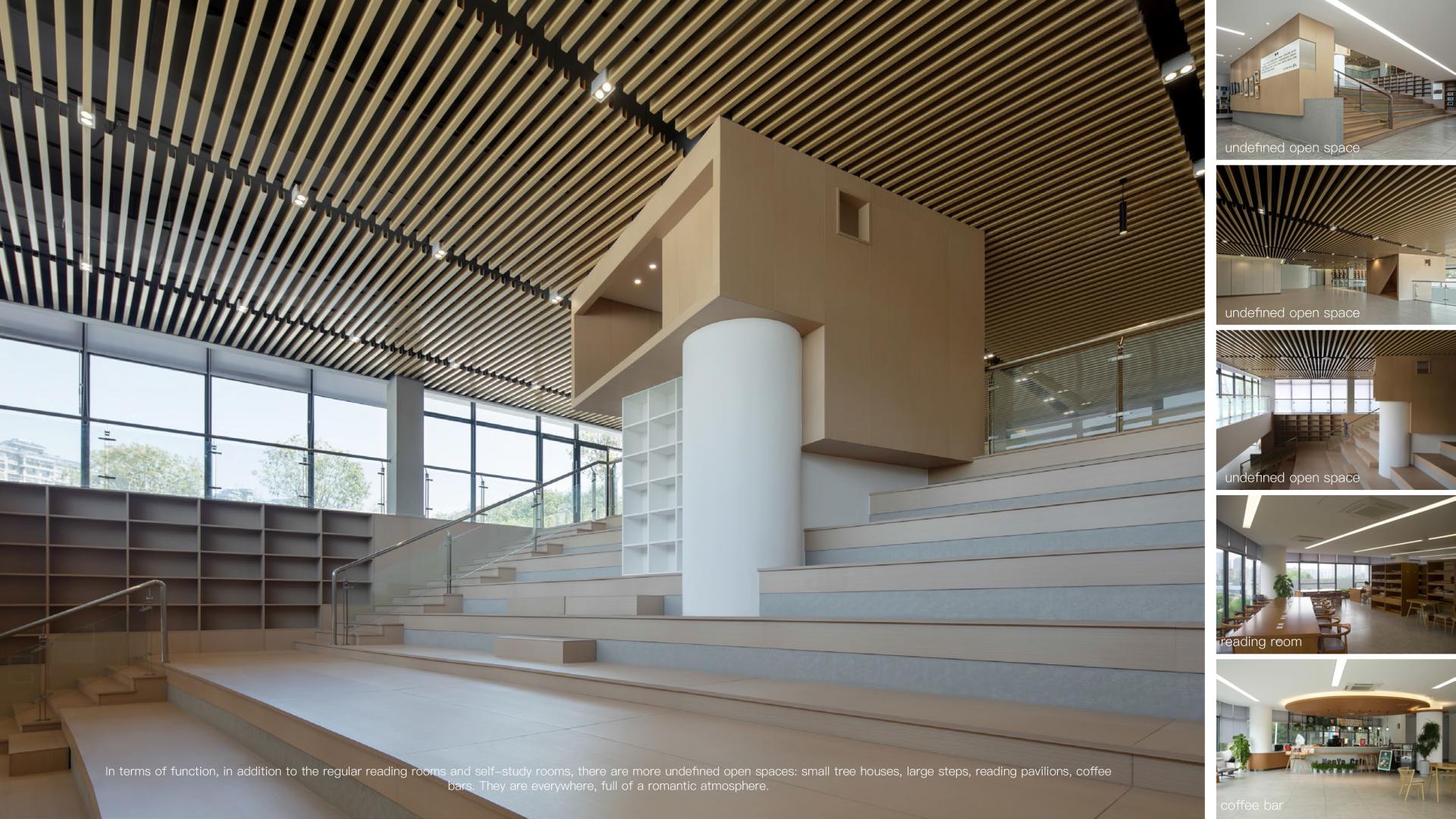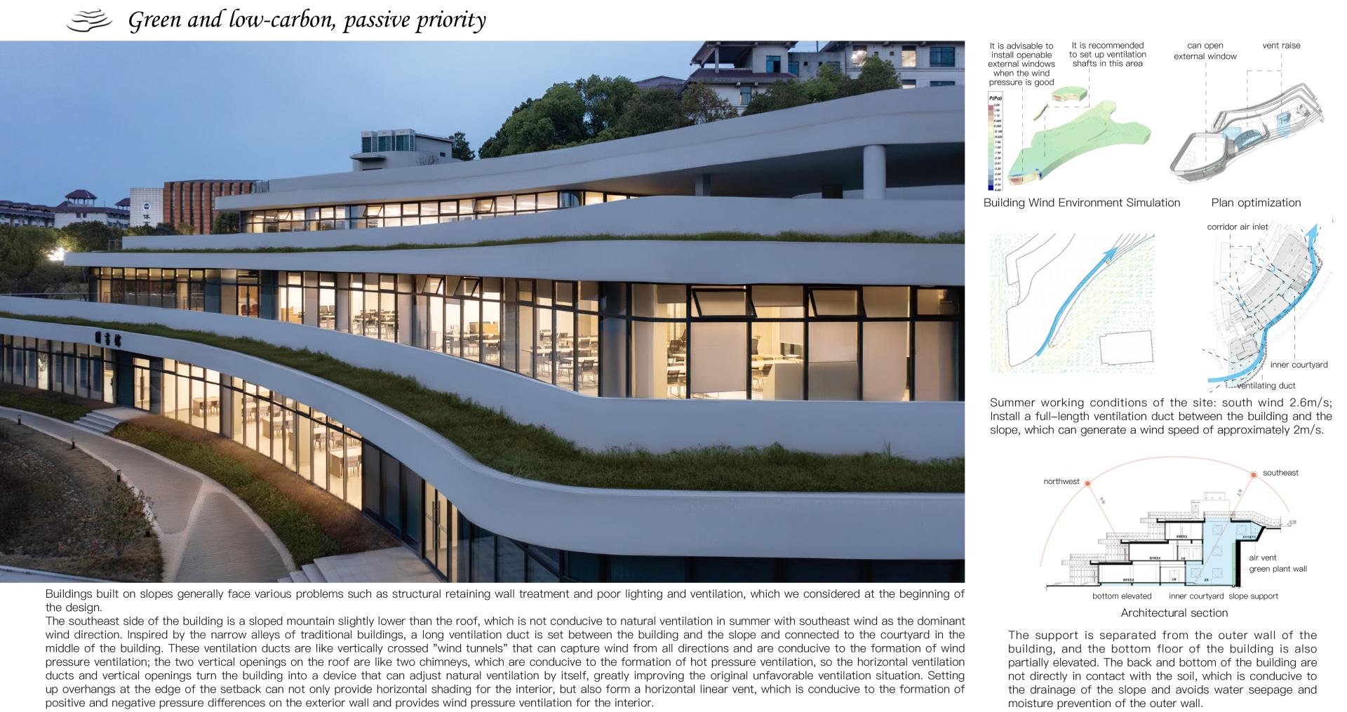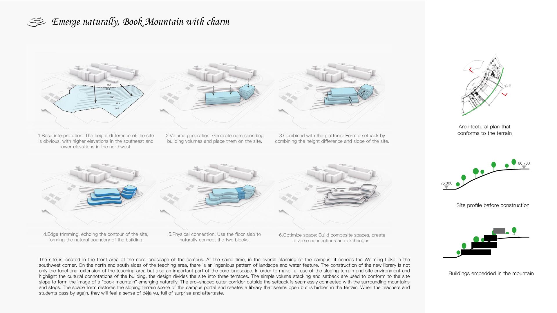 This project is to build a new library for Nanya Middle School, located in the entrance area of the campus, cleverly utilizing the sloping terrain to create a unique image of "elegant charm of the book mountain". The library adopts a three-level terrace design, with a curved outer corridor seamlessly integrated with the surrounding environment, creating an open and hidden space on the slope. The internal space of the library is fluid and functionally complex, providing diverse activity spaces and promoting communication between teachers and students. At the same time, the design focuses on natural disappearance, using techniques such as stacking and shifting blocks to integrate the building with the environment, creating a roaming experience of "forest in its surroundings". In terms of green and low-carbon, a passive priority and active optimization strategy is adopted to set up ventilation ducts, eaves, inner courtyards, light pipes, etc., improve the ventilation status, and achieve efficient lighting; The support is detached from the outer wall of the building, and the bottom layer of the building is partially elevated, which is conducive to slope drainage and can prevent water seepage and moisture in the building, demonstrating the design concept of sustainable development.