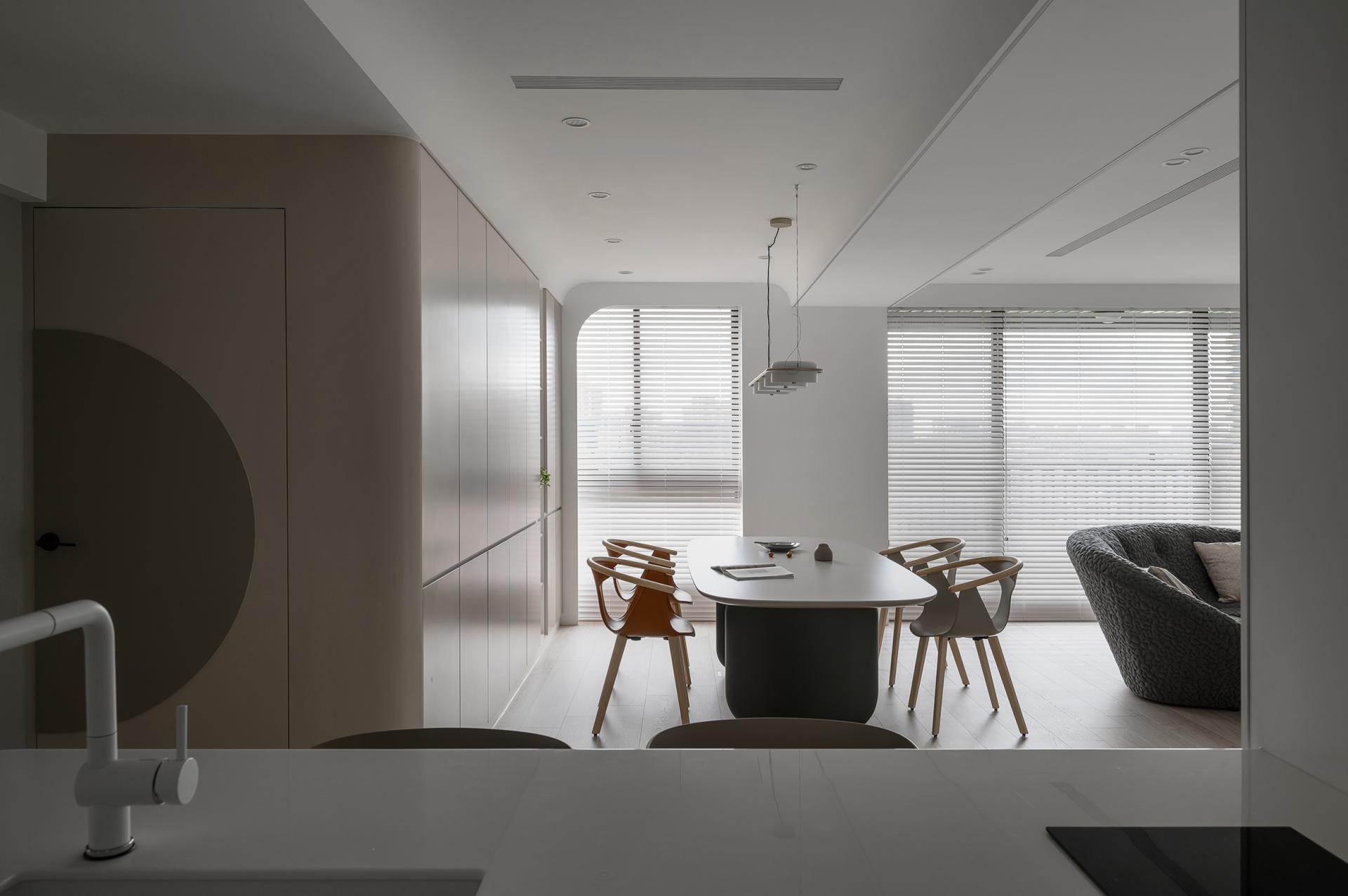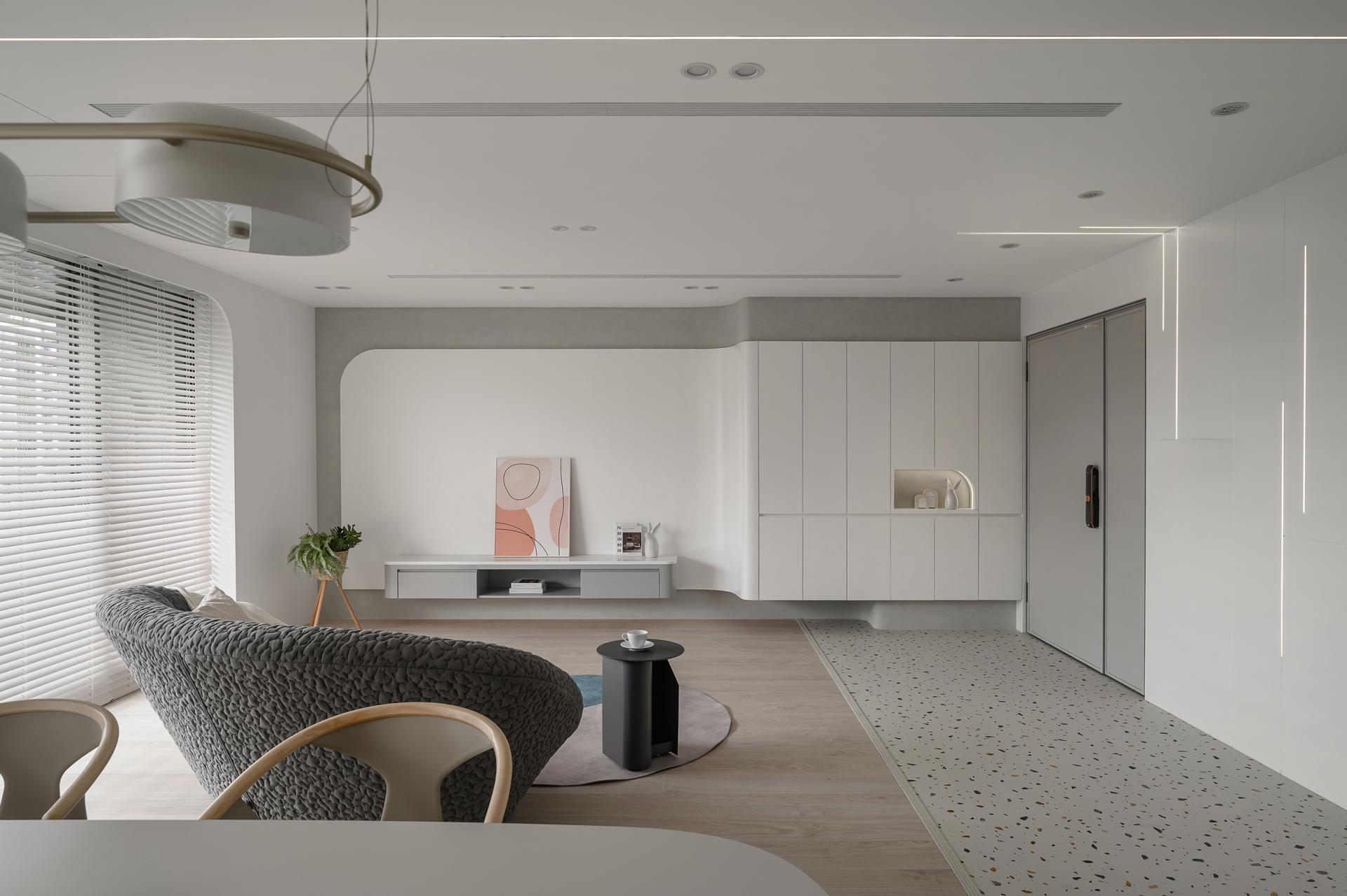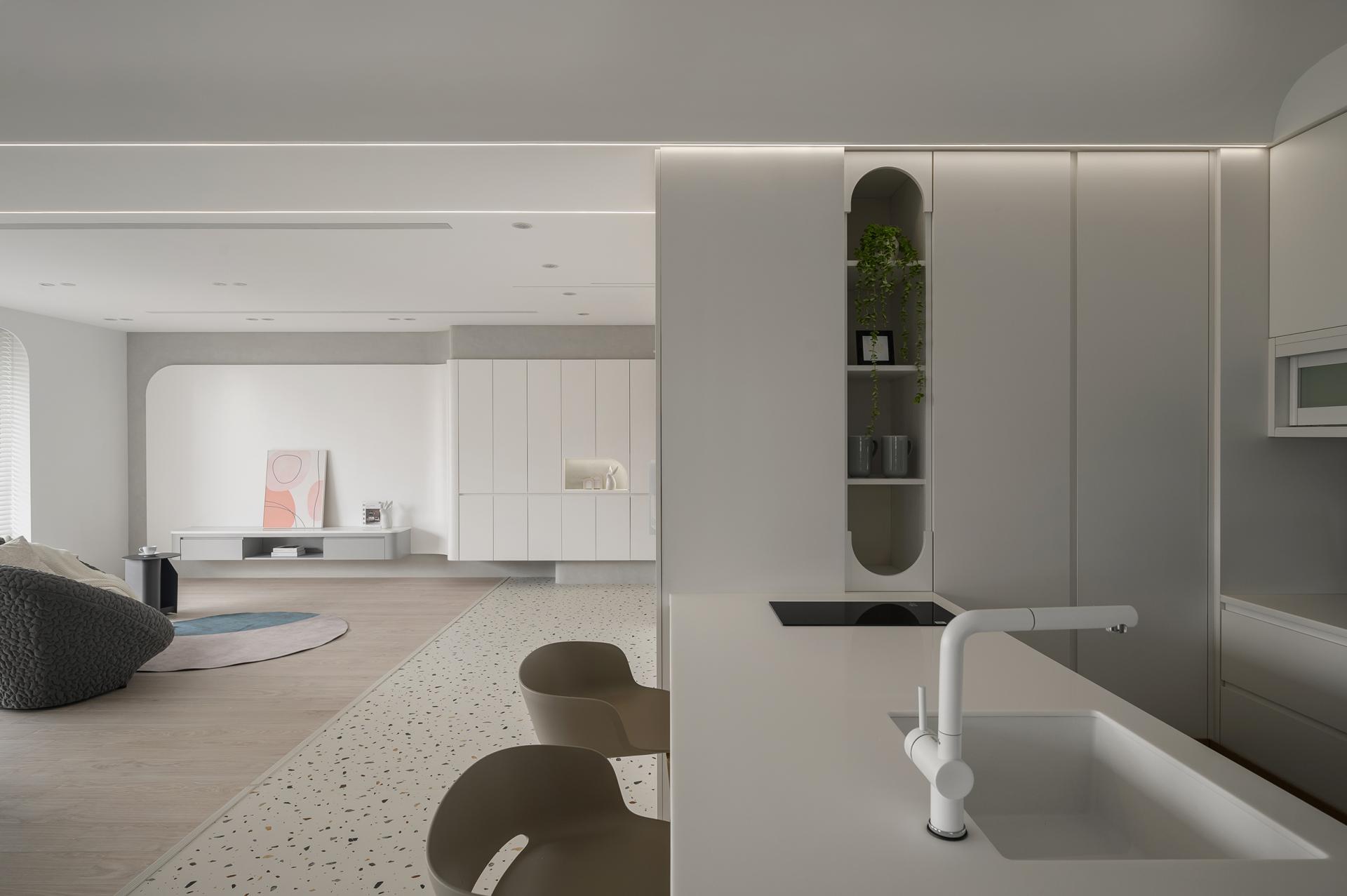 The curved designs and open-plan layout foster a profound dialogue between light, space, and materials. Every morning and evening, as sunlight filters through the blinds and subtly shifts angles, the softened light, free from heaviness and heat, creates the illusion of walking among the clouds. The residents stroll through this gentle light, embracing a life that is delicate, elegant, and serene.