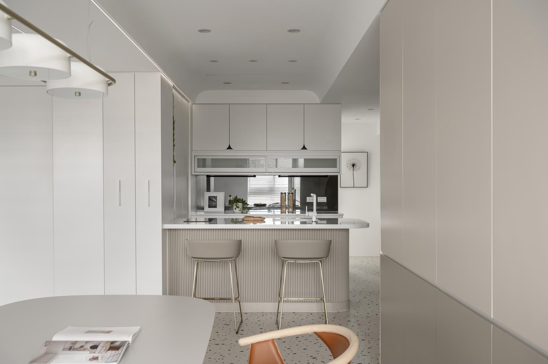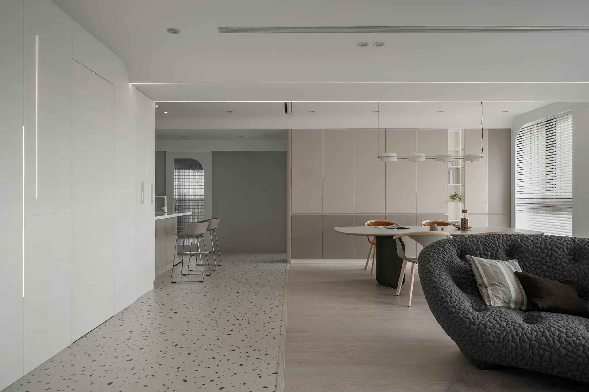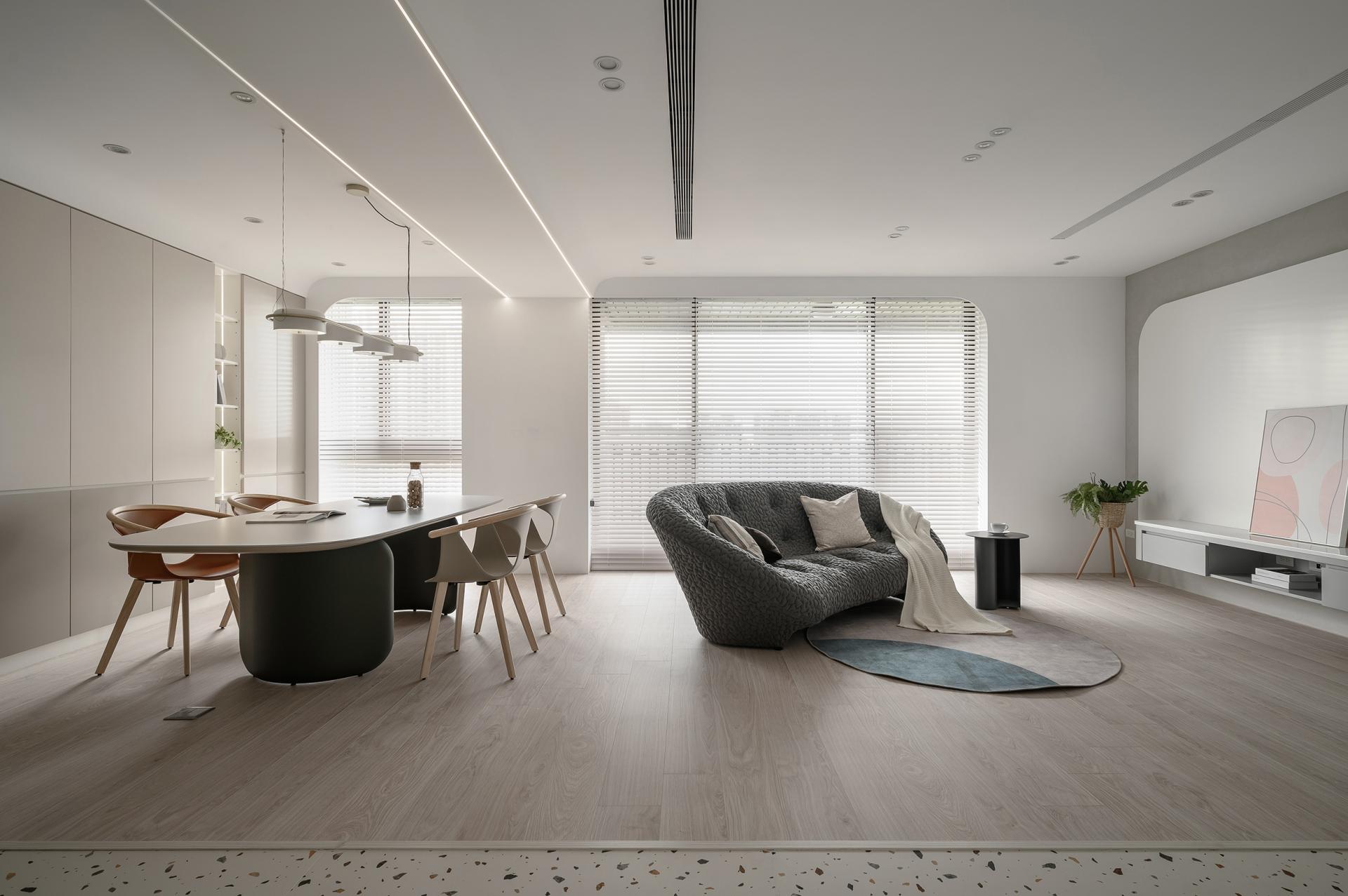 The curved designs and open-plan layout foster a profound dialogue between light, space, and materials. Every morning and evening, as sunlight filters through the blinds and subtly shifts angles, the softened light, free from heaviness and heat, creates the illusion of walking among the clouds. The residents stroll through this gentle light, embracing a life that is delicate, elegant, and serene.