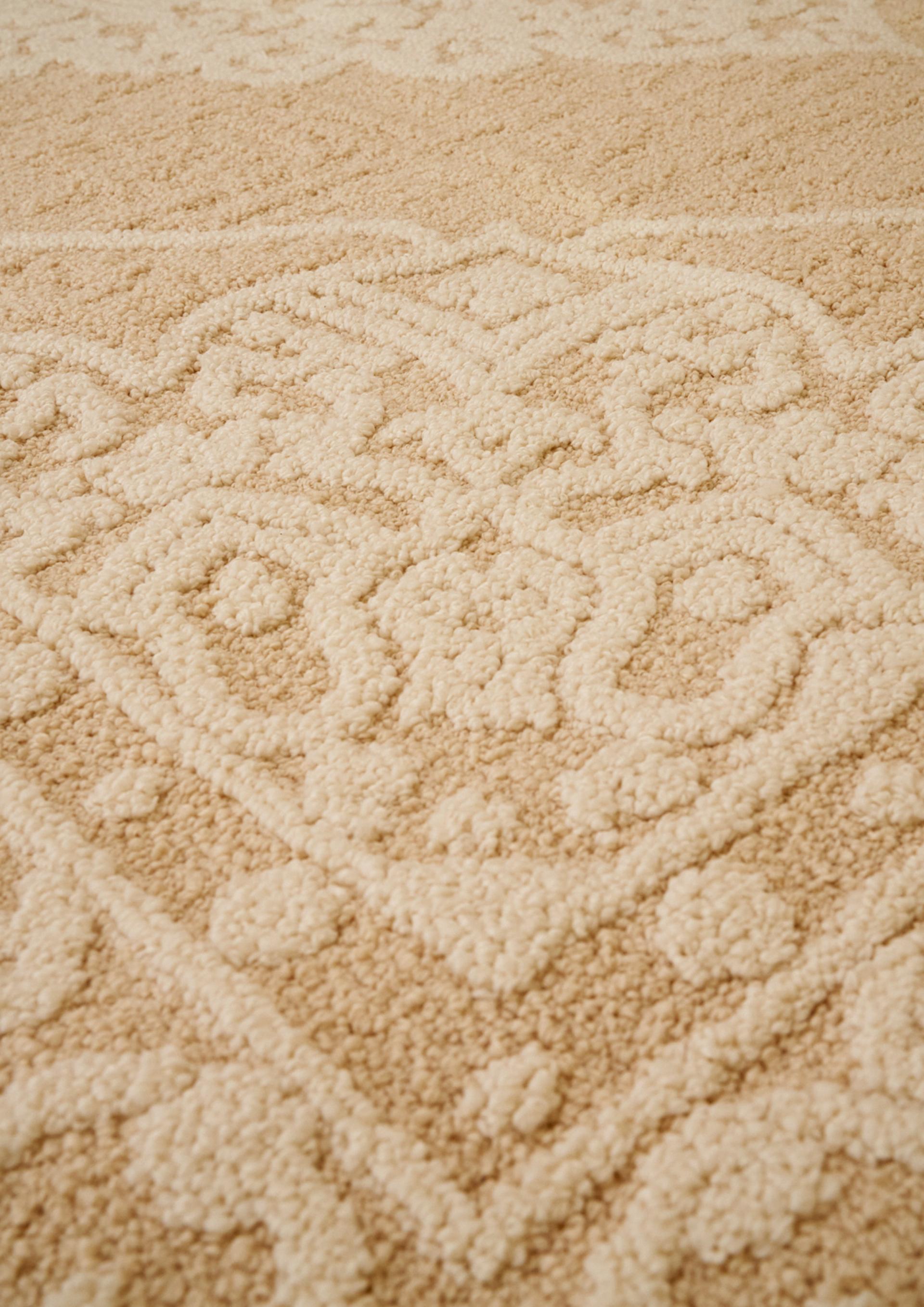 The design of this exquisite carpet draws rich inspiration from the intricate relief patterns found adorning the walls of Moroccan mosques. Each carefully crafted detail showcases the designer's profound appreciation and respect for the lineage of traditional Moroccan artistry, resulting in a creation that offers a unique exotic allure combined with artistic elegance.