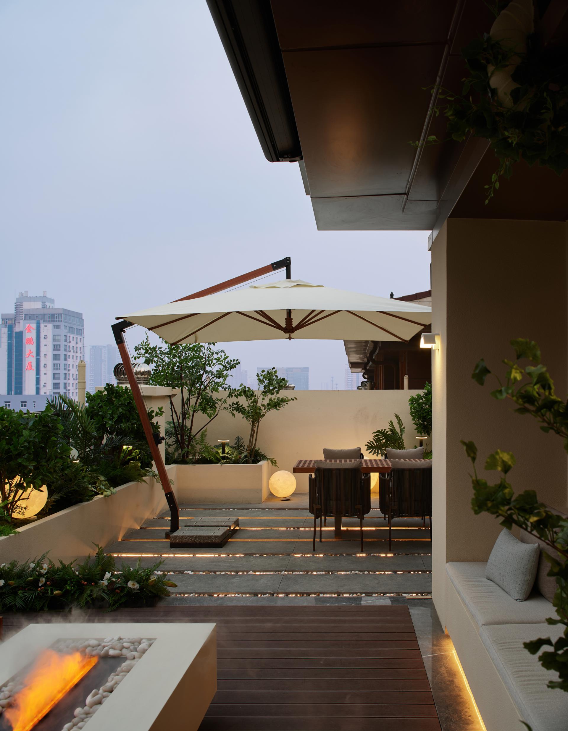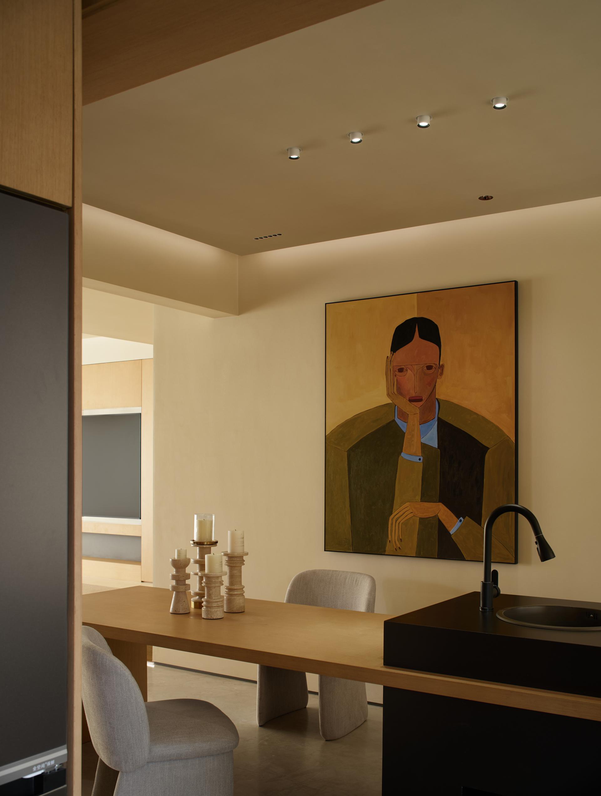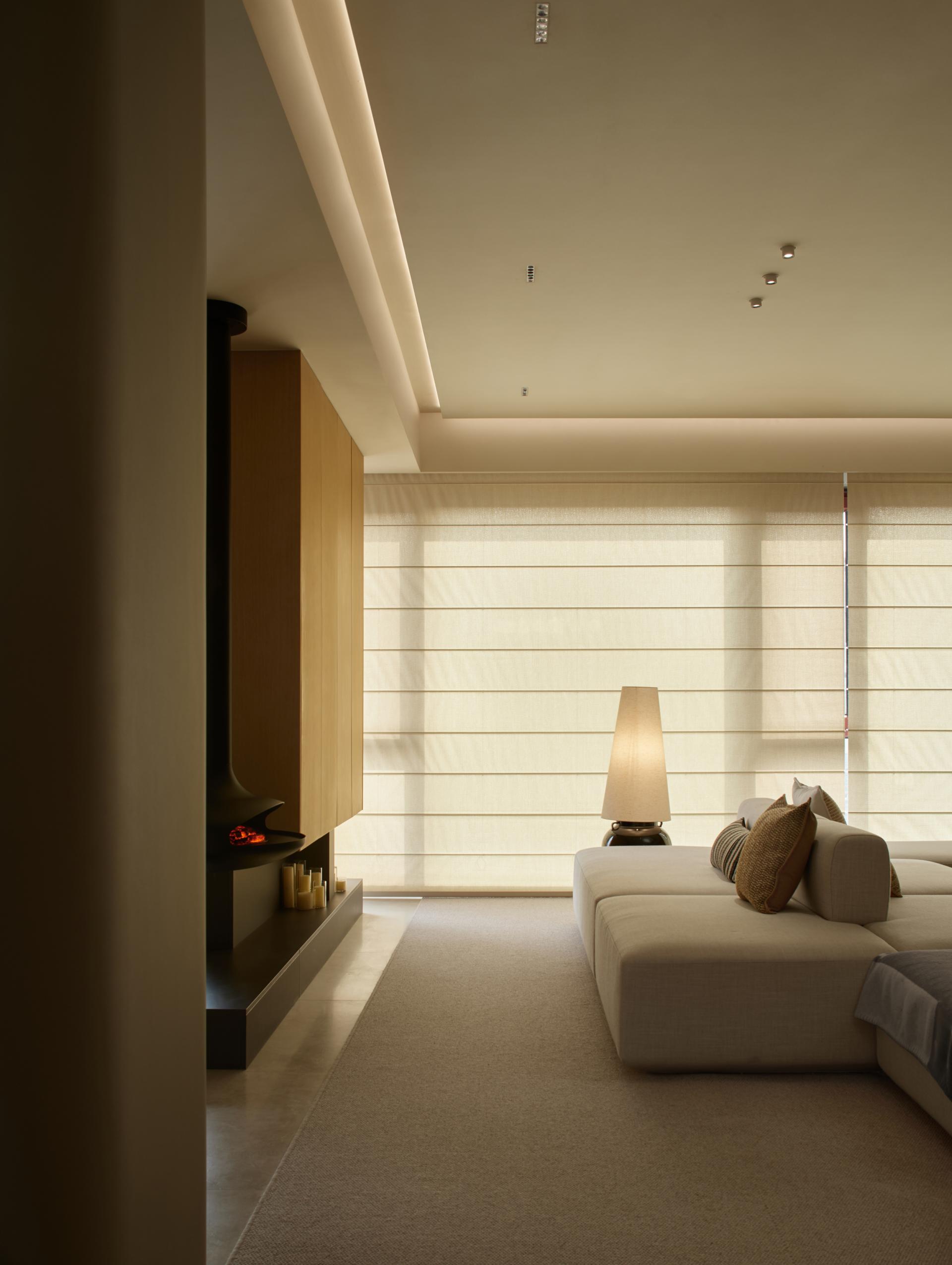 Bringing a strong sense of temperature to the living space, artistic light installations cast an ever-shifting interplay of shadows and light, enhancing the room's aesthetic depth, individuality, and cultural resonance. From the open balcony, the scene at dusk—quiet and peaceful, with the first lights illuminating the evening—completes the setting with a view that captures the gentle rhythm of daily life. Here, the model room not only meets the practical needs of contemporary living but also inspires an enduring connection to nature, comfort, and home.