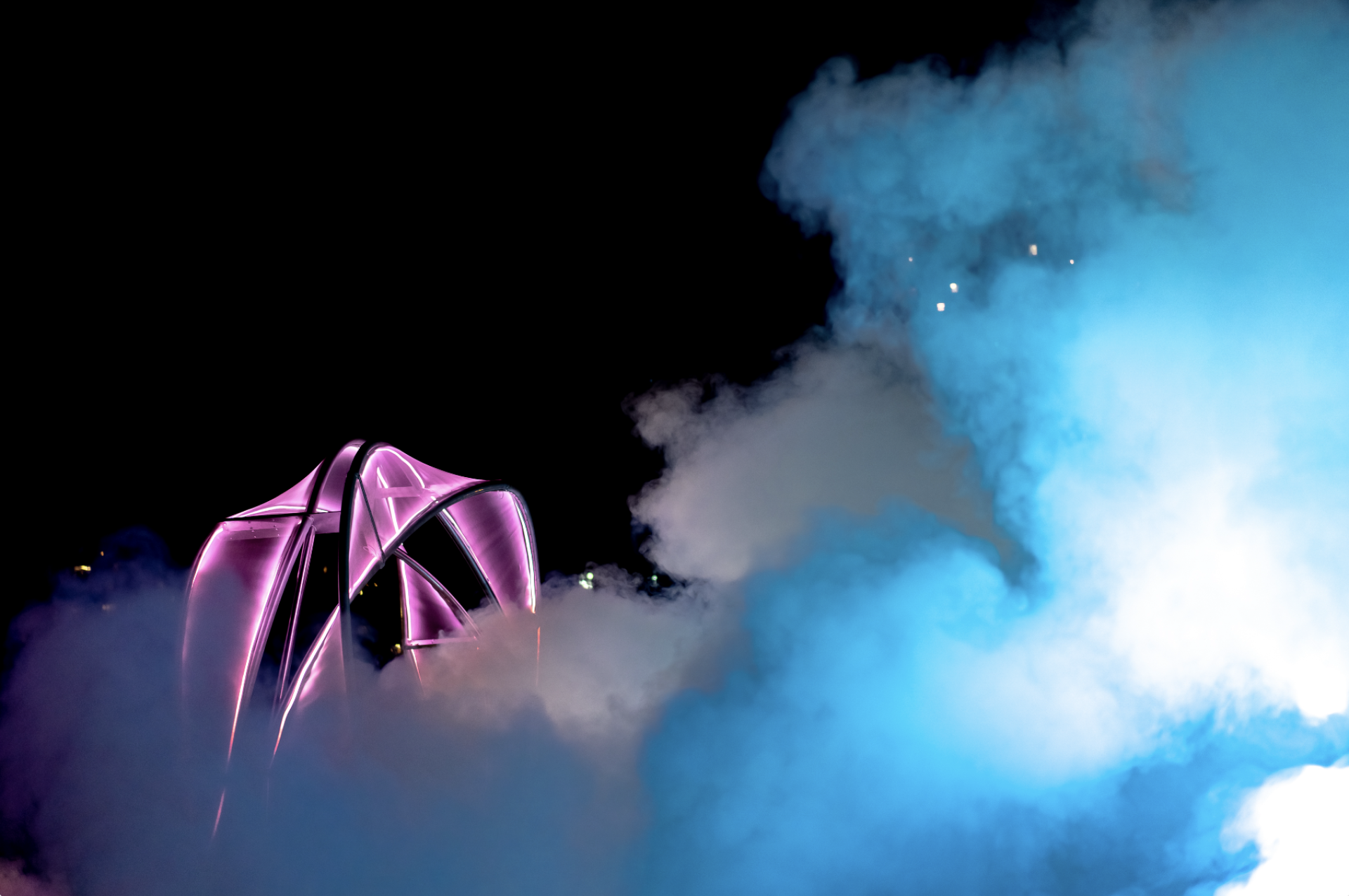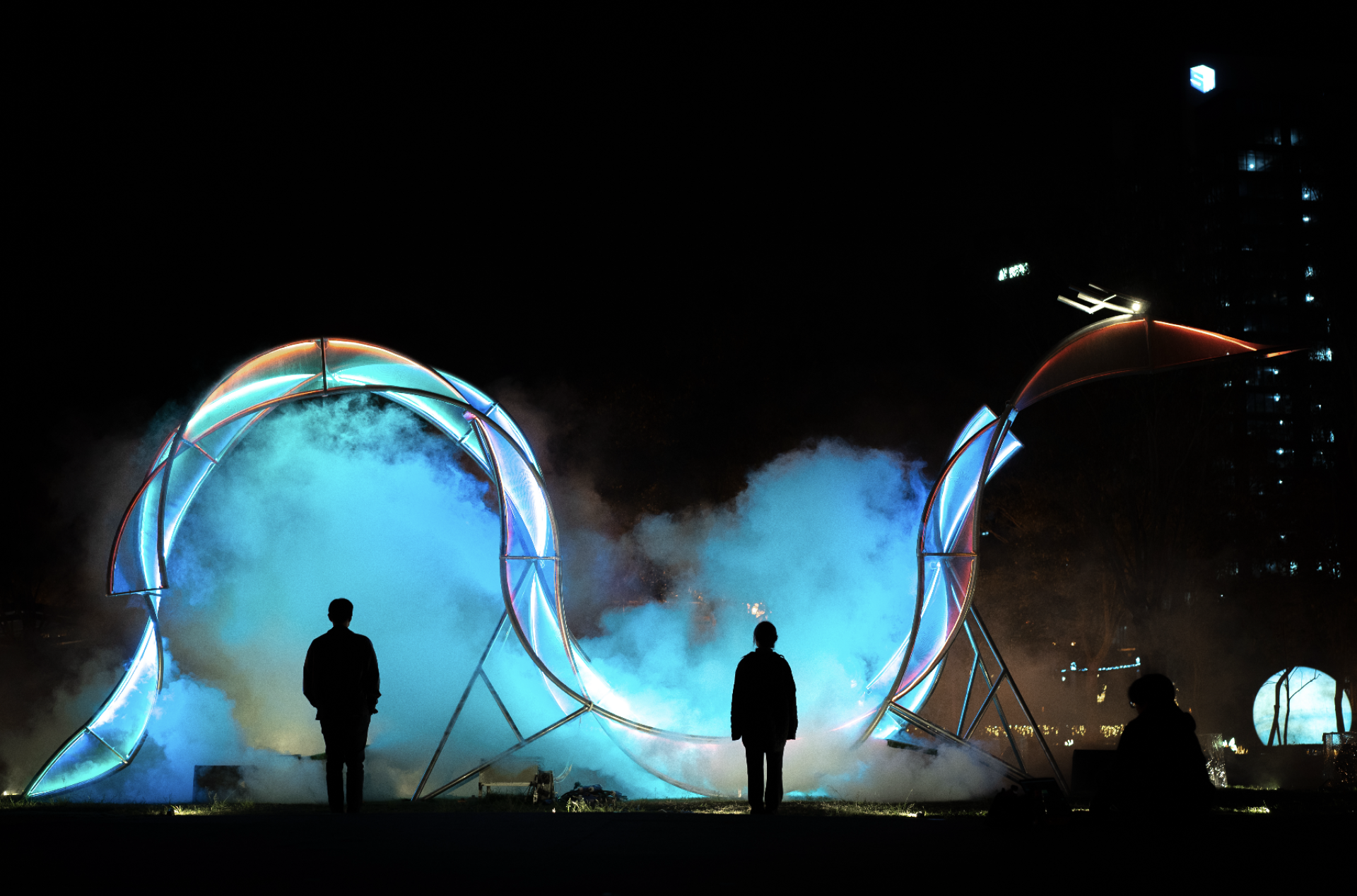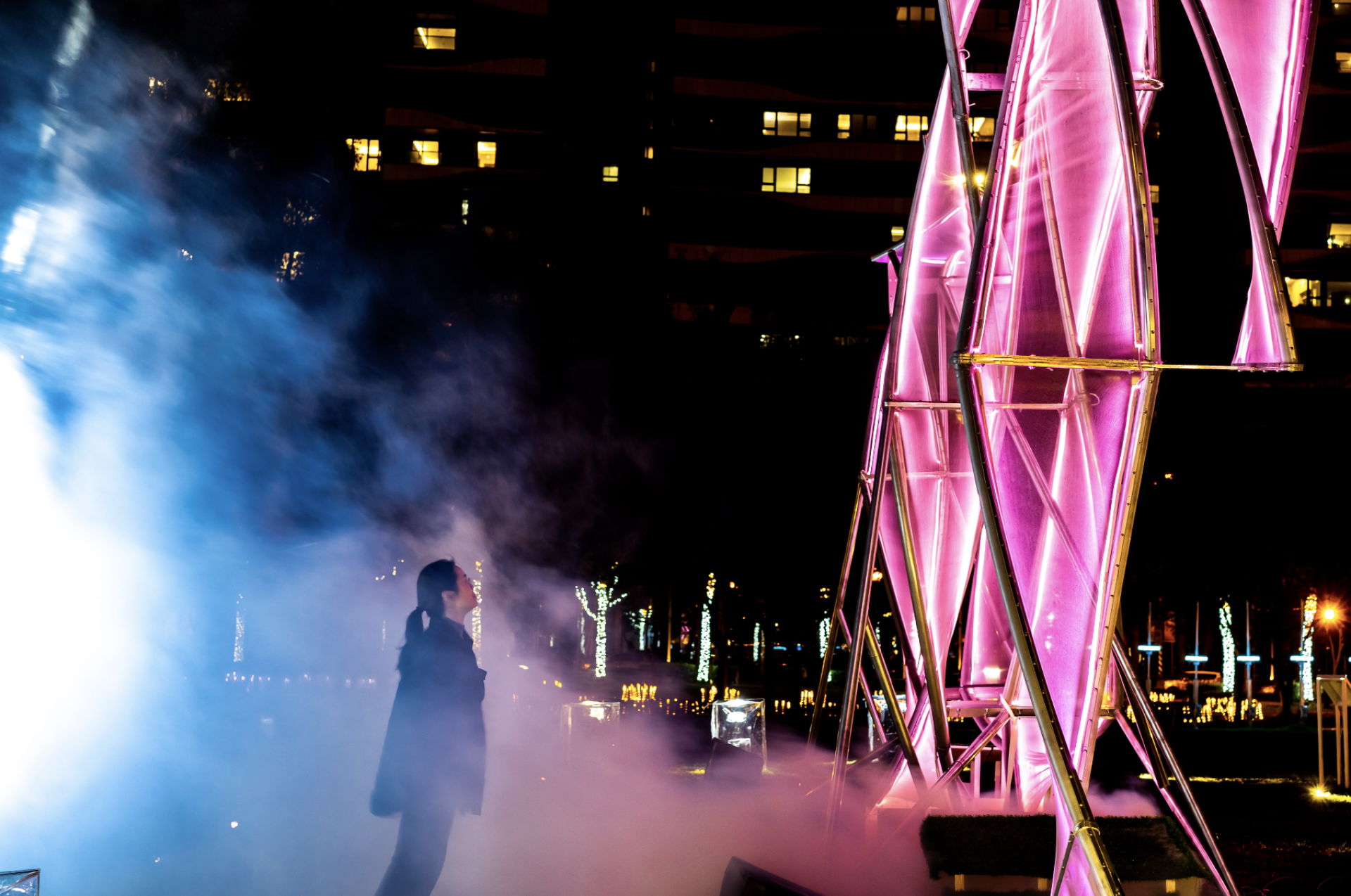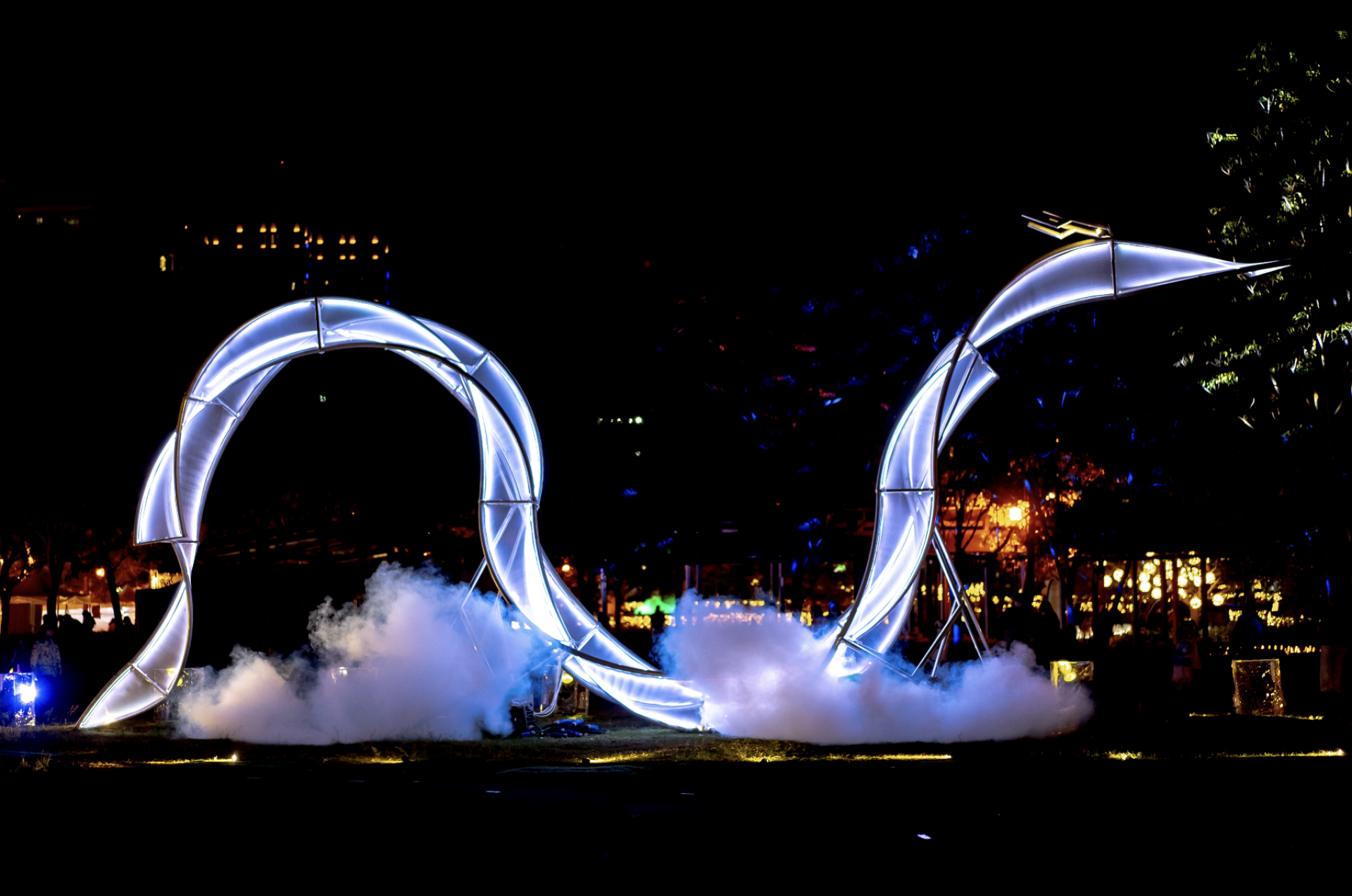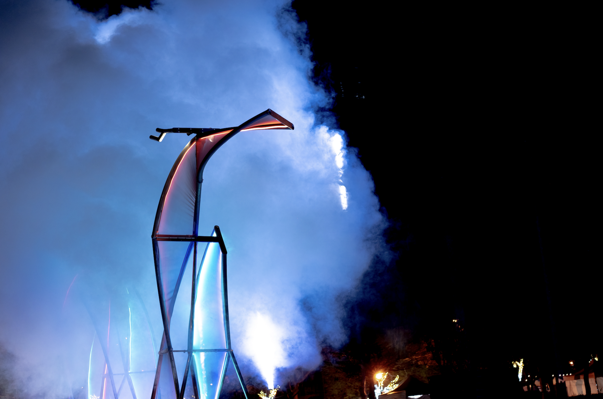 Interactive performances simulate electronic signals that activate the color of essence of life, while mist released from below creates an illusion of flight. From a distance, it leaps like a dragon, symbolizing new freedom.