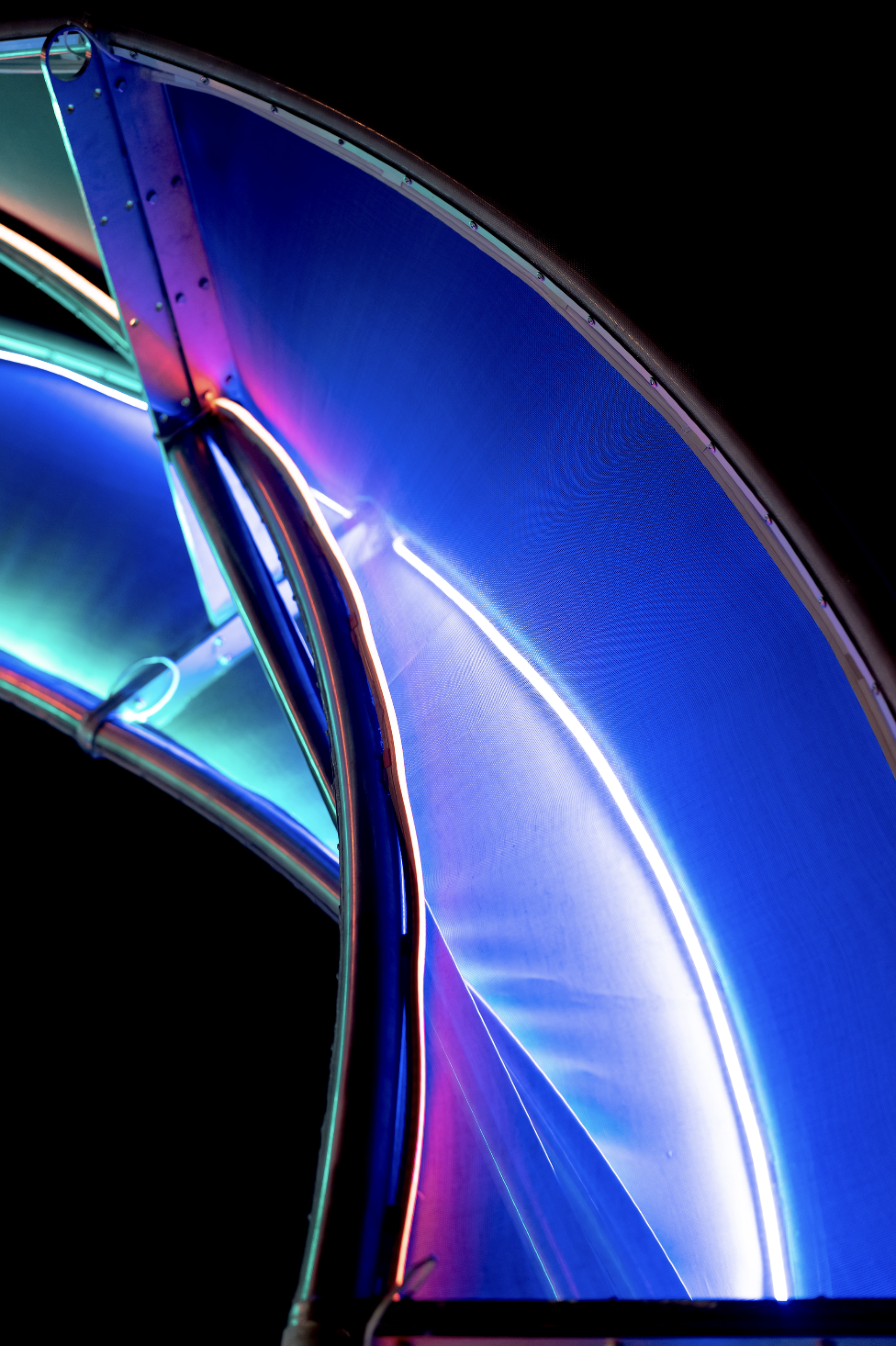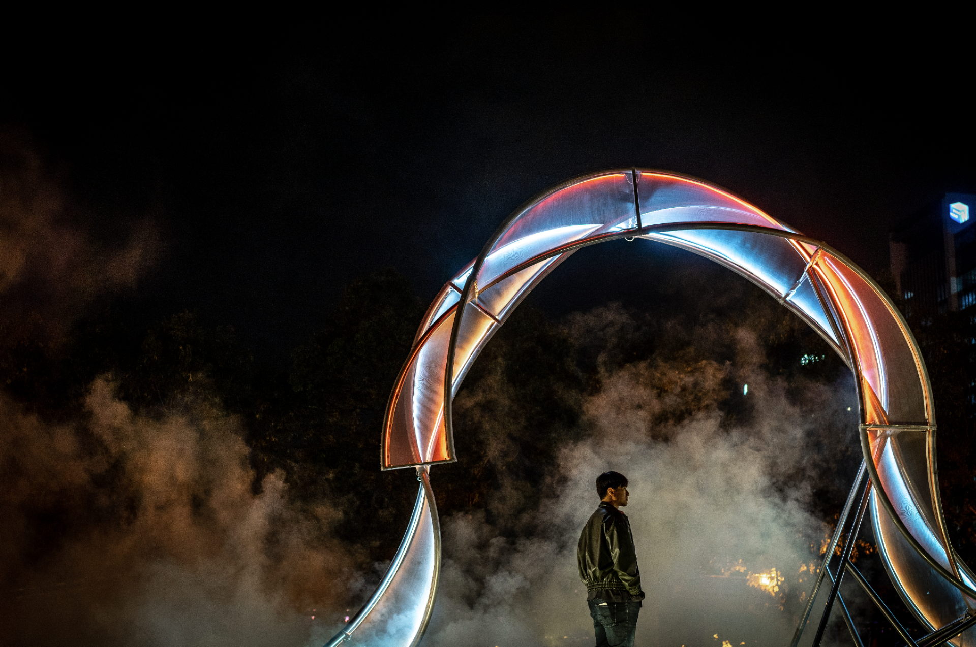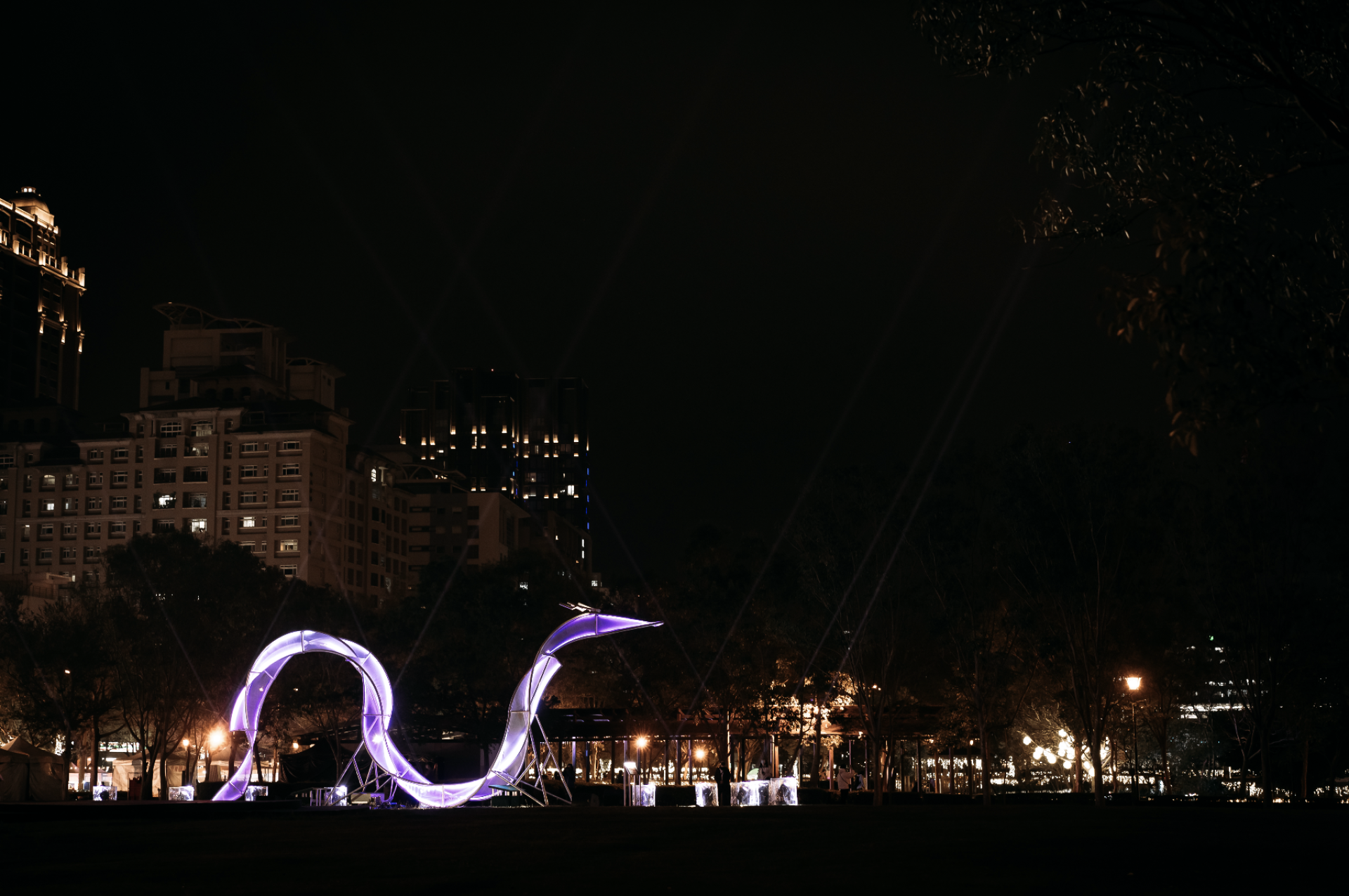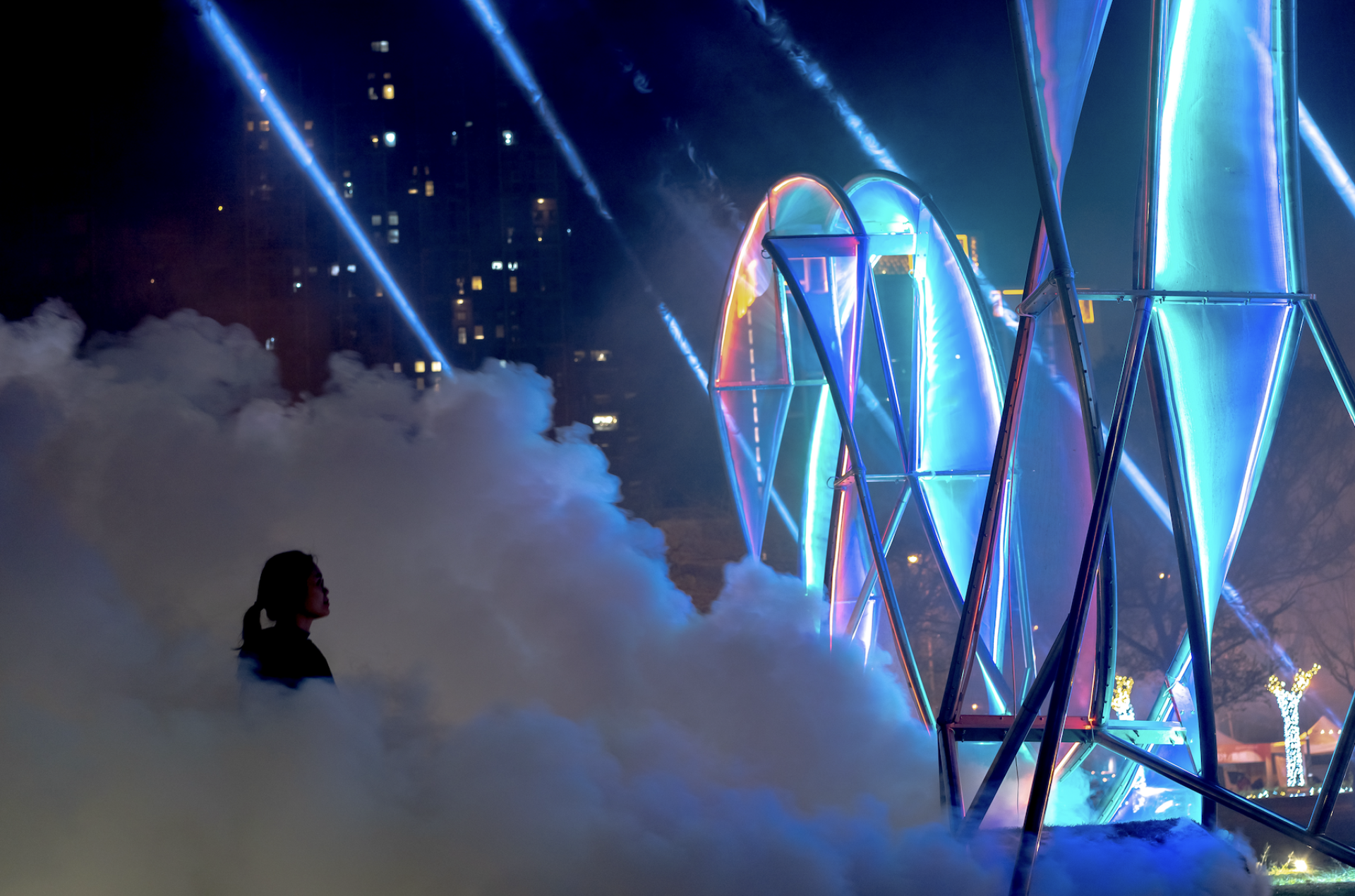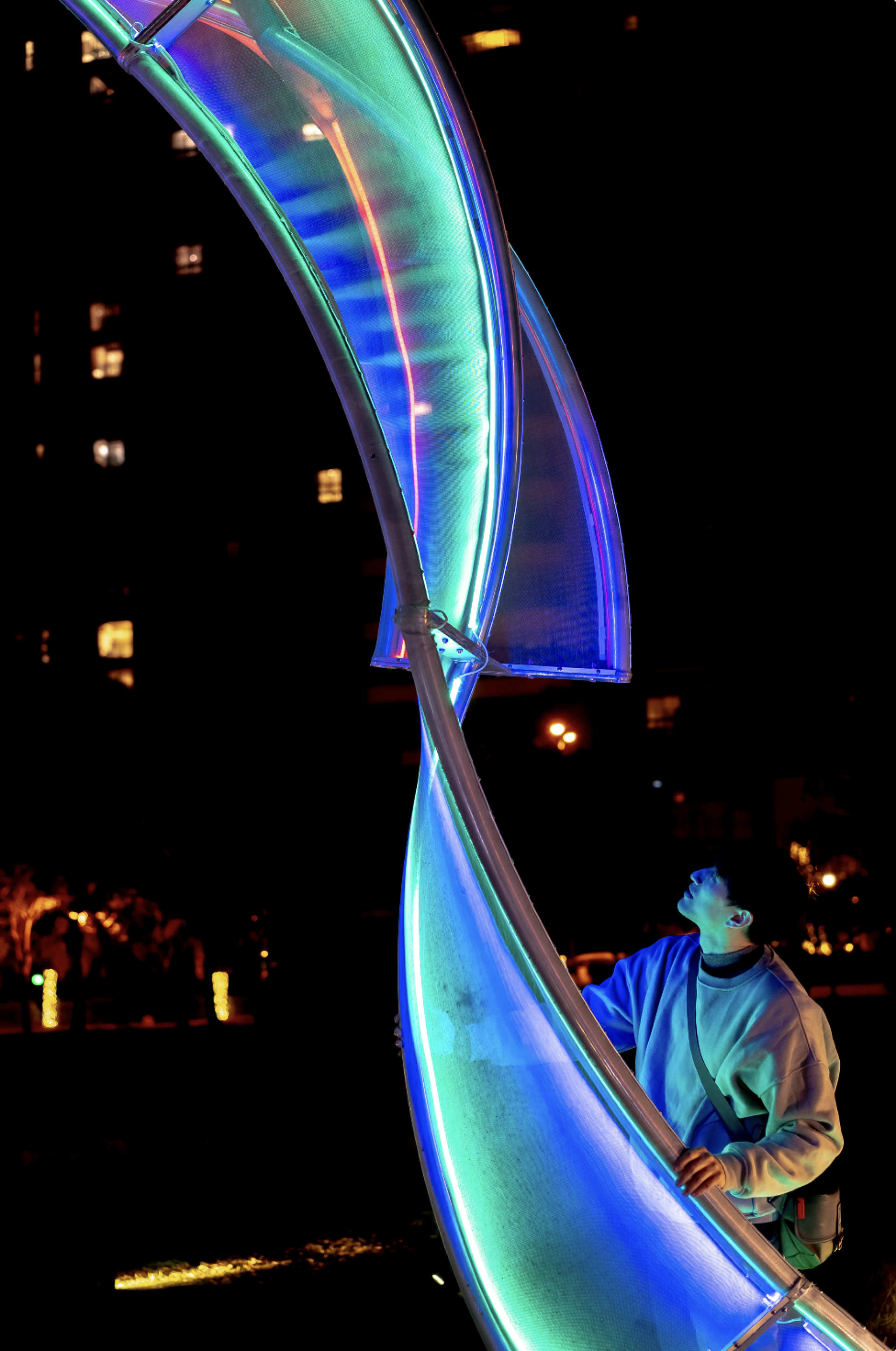 " Dance of the celestial lights " is an interactive installation integrating traditional cultural elements with modern technology. Standing at 5.5 meters tall, 14 meters long, and 1.2 meters wide, it consists of 21 identical aluminum tube modules linked together like a DNA helix. The ground structure uses 500 kg iron plates and spiral piles gently integrated into the earth of the park, aiming for sustainability, reuse, and a low carbon footprint in materials and construction methods.