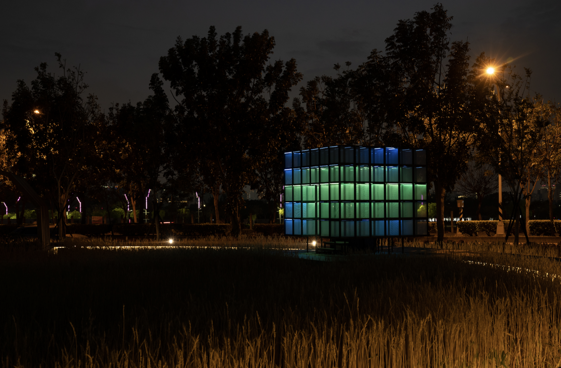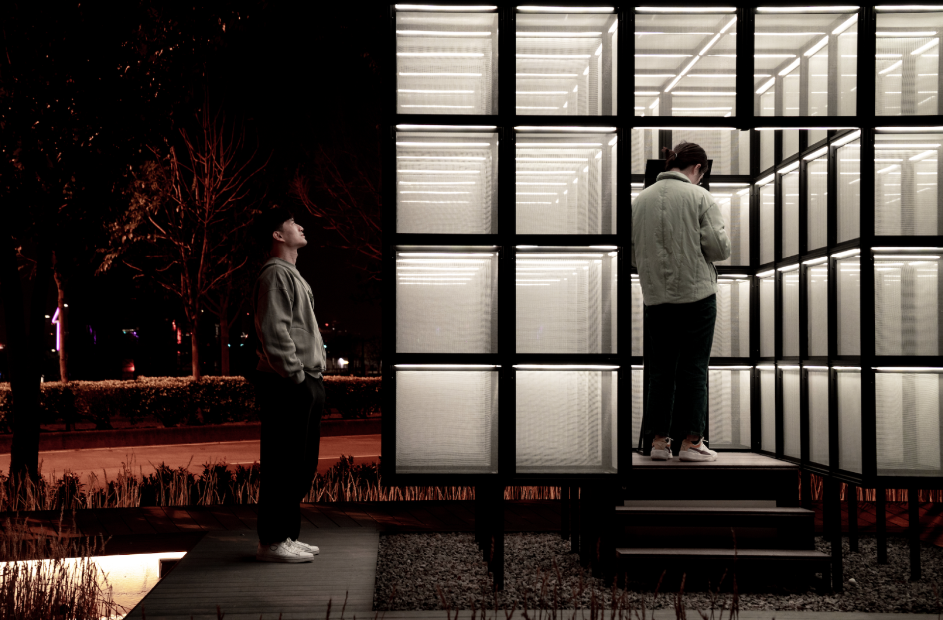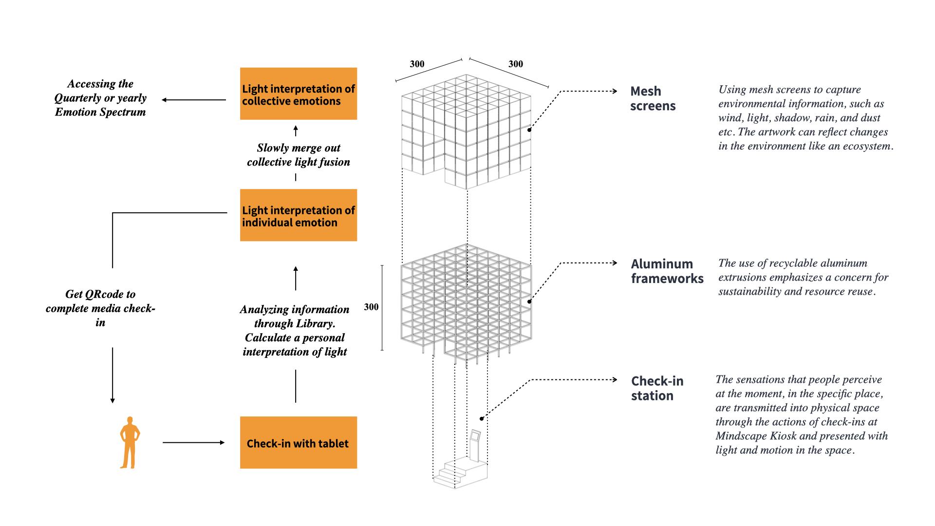 Mindscape Kiosk features a lattice structure made of aluminum pipes embedded with leds and mesh screens. The mesh screens capture environmental information, visualizing light, shadow, wind, rain and dust, enhancing the sensory experience of the local environment. During the daytime, it acts as a check-in collection box, and environmental information is instantly presented as subtle movements on the metal mesh screen. At night, the framework disappears, and the collective emotional state gradually overlays the mesh screens. It becomes a dynamic lightbox that continuously changes based on the information.