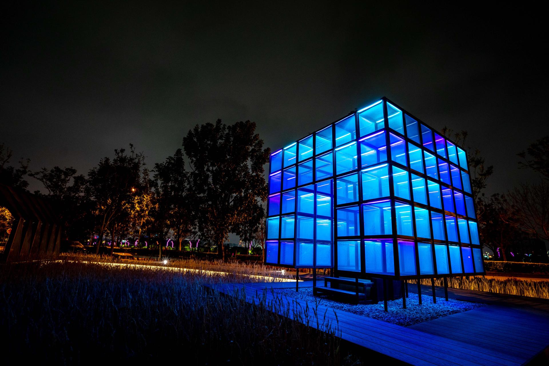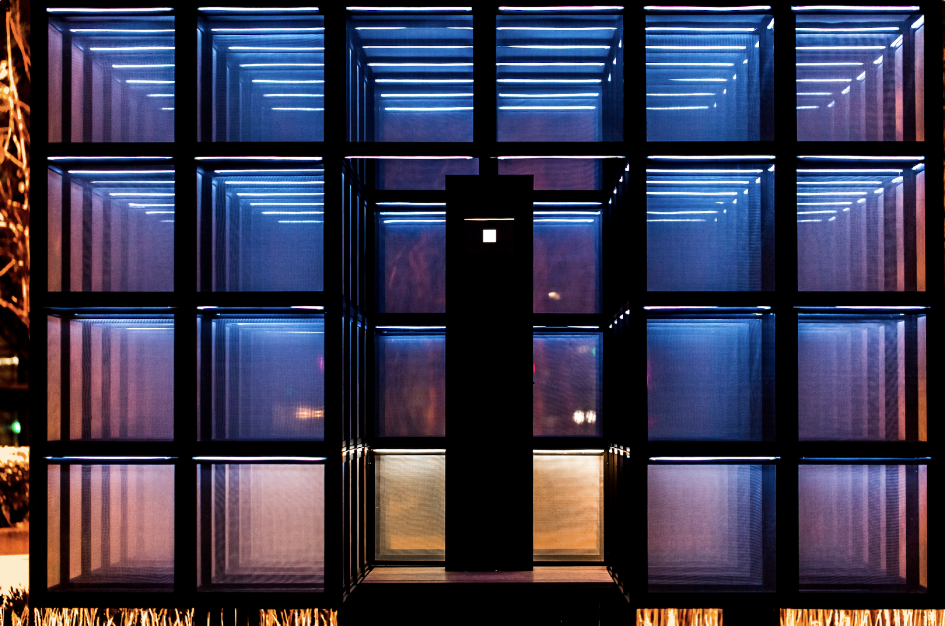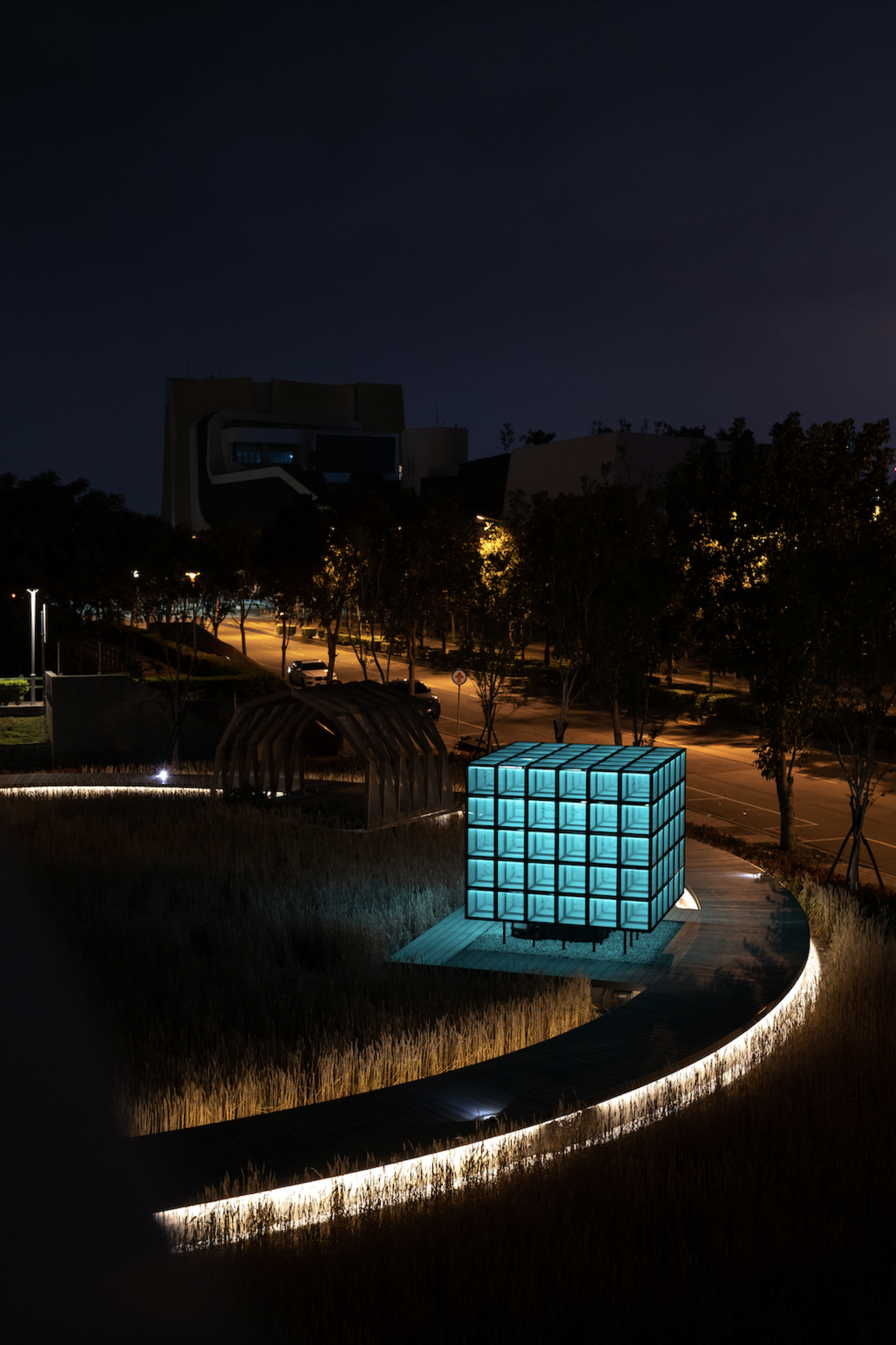 Mindscape Kiosk features a lattice structure made of aluminum pipes embedded with leds and mesh screens. The mesh screens capture environmental information, visualizing light, shadow, wind, rain and dust, enhancing the sensory experience of the local environment. During the daytime, it acts as a check-in collection box, and environmental information is instantly presented as subtle movements on the metal mesh screen. At night, the framework disappears, and the collective emotional state gradually overlays the mesh screens. It becomes a dynamic lightbox that continuously changes based on the information.