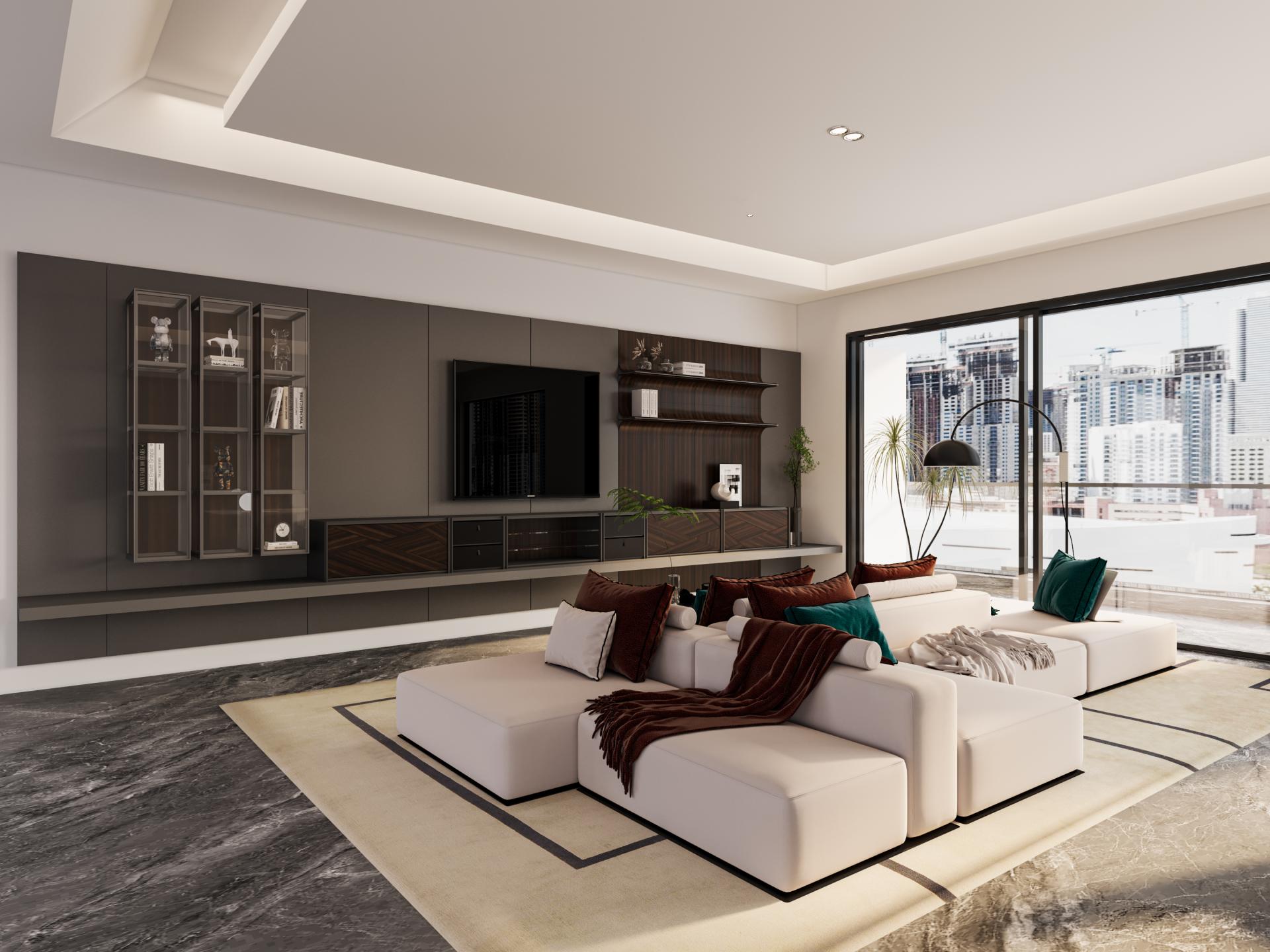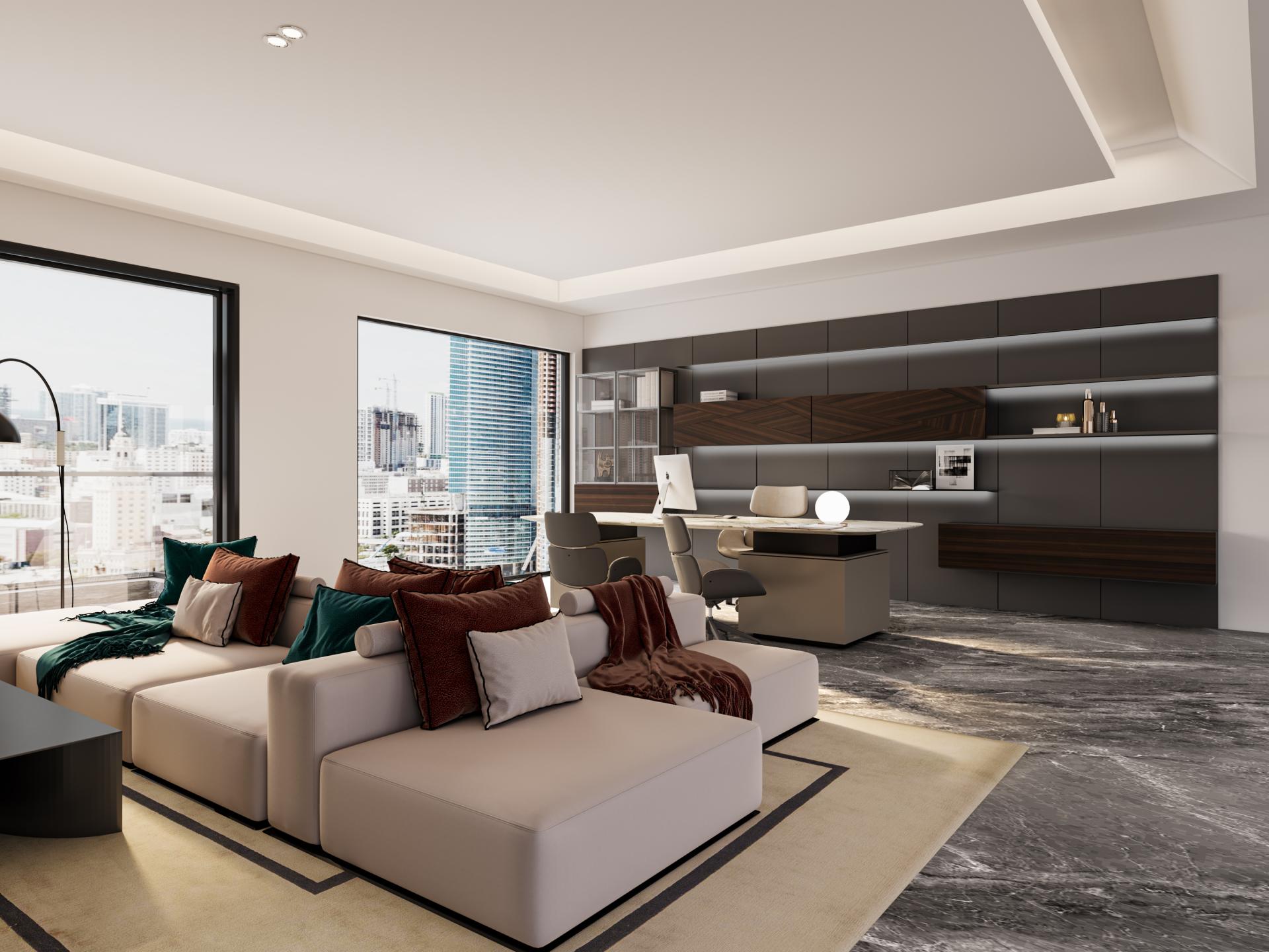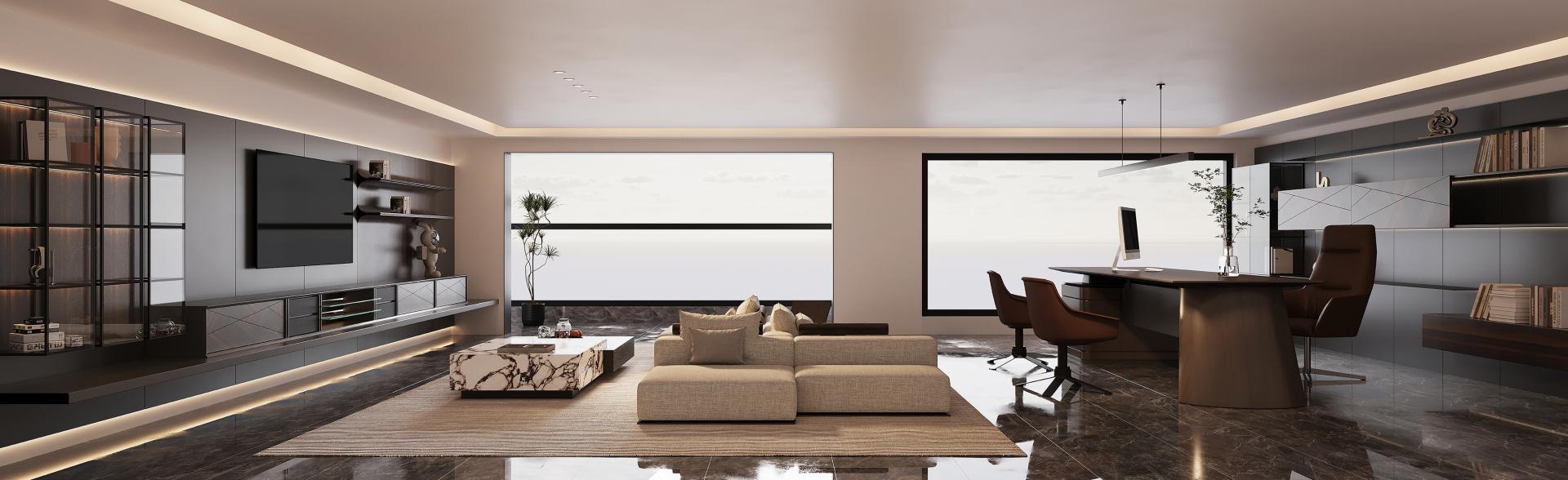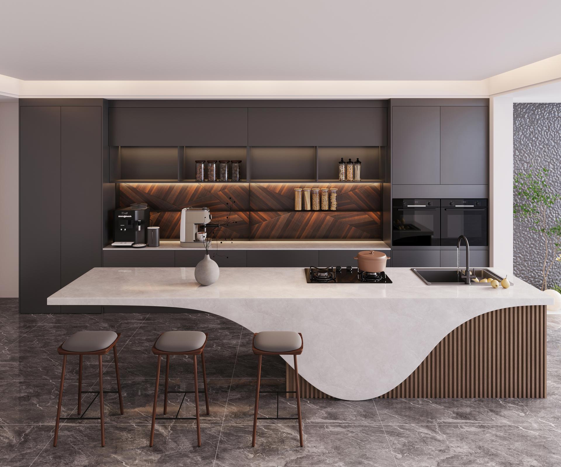 The Bray series features an open-layout design that maximizes space utilization for family interaction through integrated saloon-study and dining-kitchen spaces, the former with the cantilevered TV cabinet and bookcase. It also uses modular sofas as a spatial divider to create a visual separation that defines individual private spaces. This approach seamlessly blends personal solitude and social interaction, ideally suiting the everyday requirements of spouses. The kitchen adopts a linear cabinet layout with tall cabinets incorporating pocket doors. This cleverly provides a specialized area for small appliances and integrates advanced appliances like multifunctional ovens to cater to a variety of culinary demands. Furthermore, a linear island extends to double as a dining sideboard, forming an ideal social hub for hosting gatherings and enjoying meals with friends, thereby adding another layer of pleasure to the cooking experience.