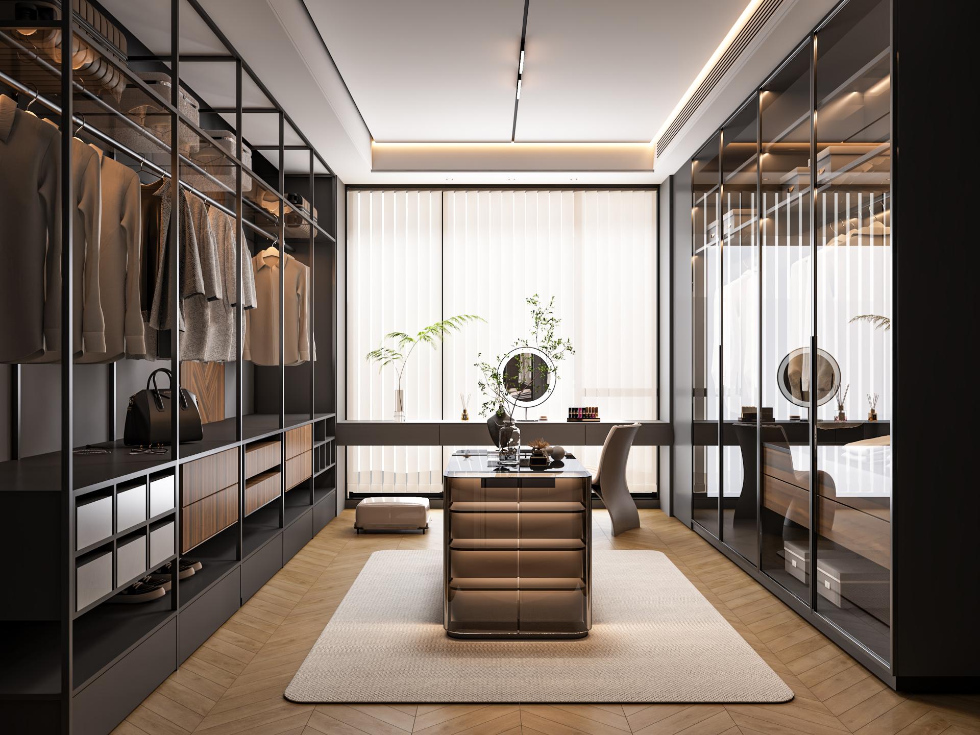 The locker room incorporates a small exhibition-style design, creating a high-end storage space for clothing with an aluminum frame system and aluminum-framed glass door wardrobes, while also accommodating personalized storage needs for males and females in separate areas. A glass island with smooth, curved corners acts as a soft partition, embodying the concept of "spatial co-integration." Two complementary wardrobes with an integrated lighting system combine storage and display, showcasing the desired lifestyle of elegance and sophistication for the intended group.