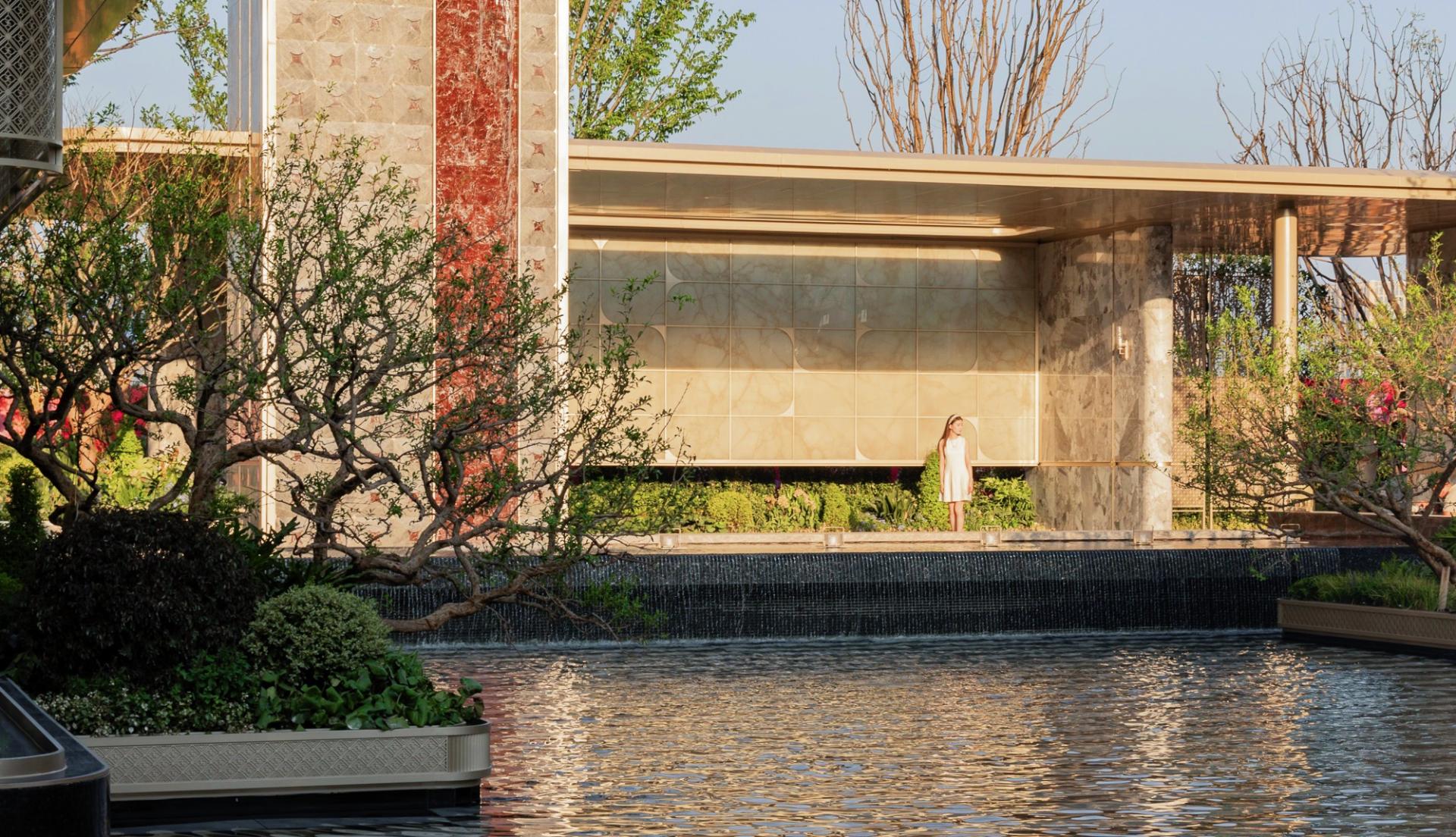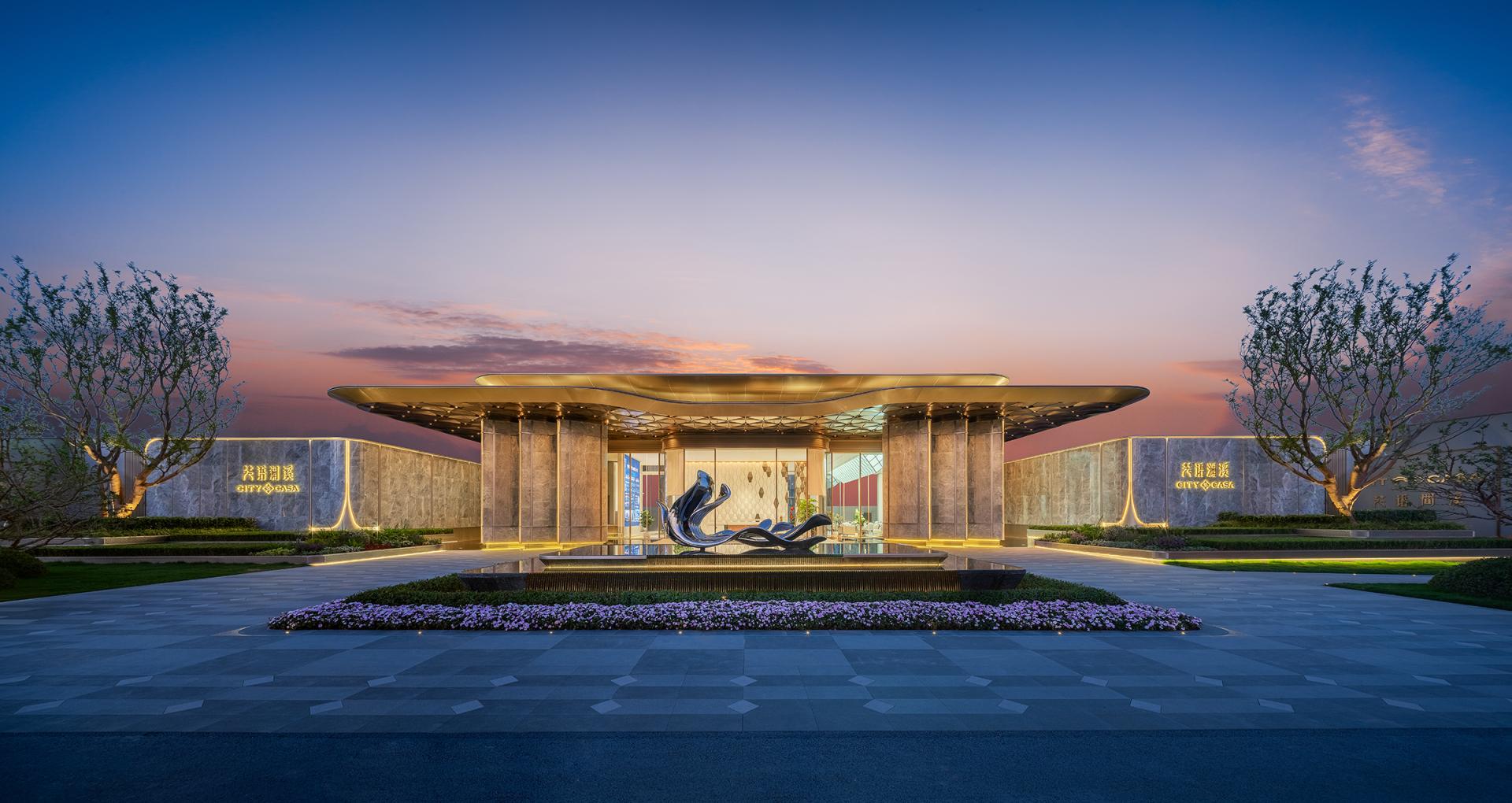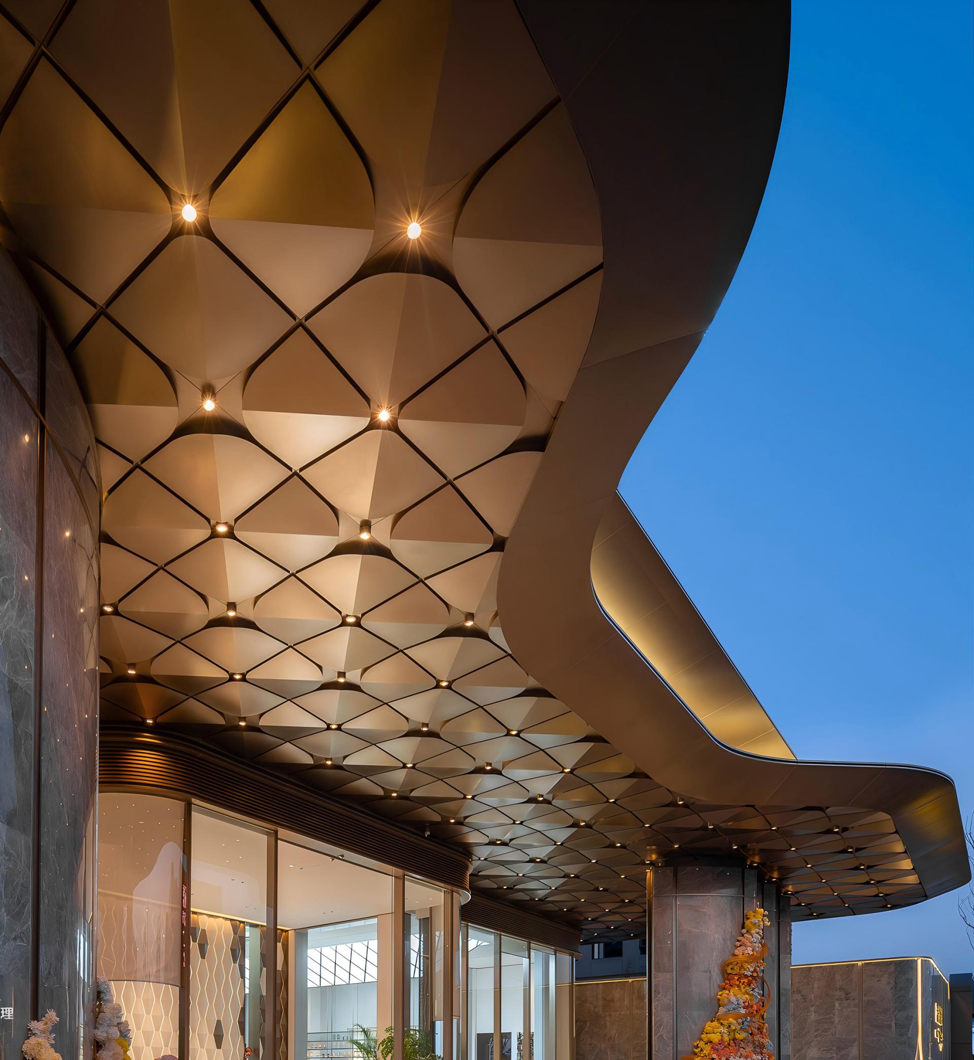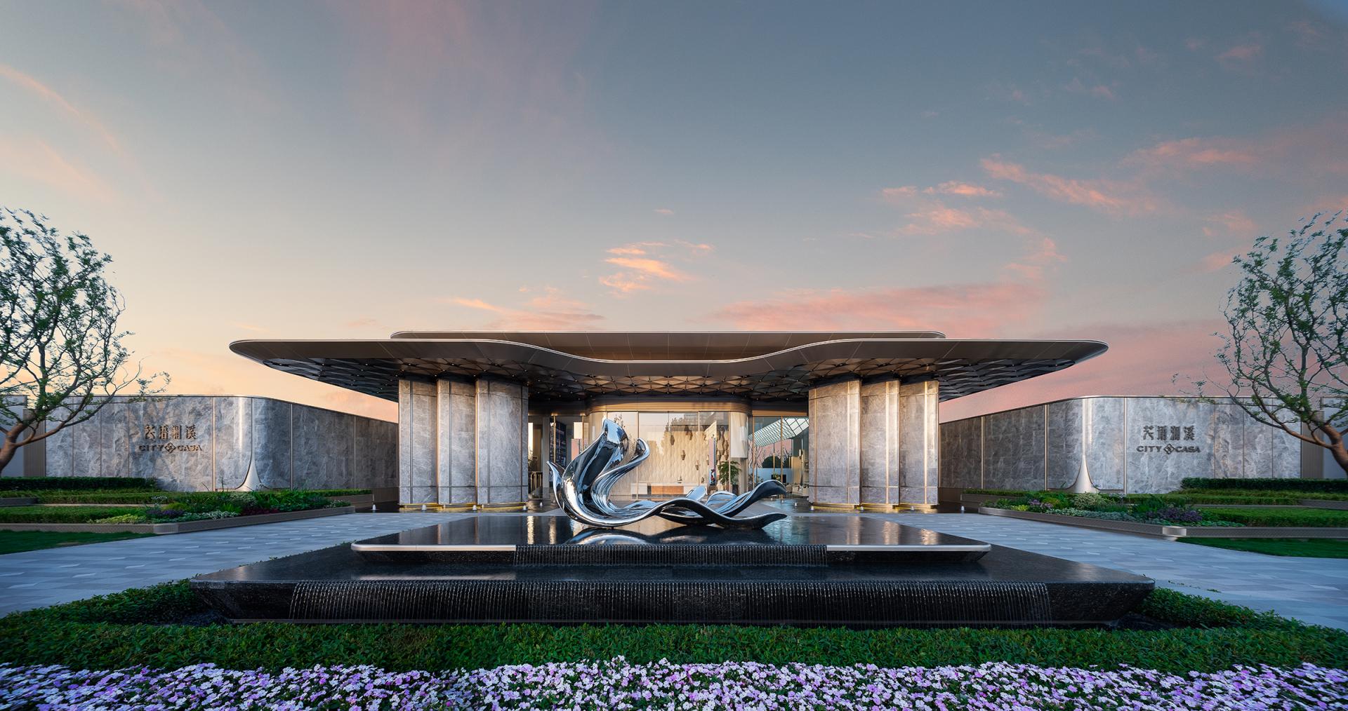 The project is located in Xi 'an International Port Zone, which is an emerging area of the city and a window for Xi 'an to display to the outside world. The surrounding education resources are sufficient, the supporting medical and business atmosphere is mature, and the city has many natural parks, which has strong resources. The architectural design scheme created by Mademake combines the grand style of traditional imperial courtyard with the lightness and delicacy of modernism, aiming to create a high-quality residential area with both Eastern cultural artistic conception and modern aesthetic characteristics. You can see that every design is close to life. Taking "Xi 'an Flower a pomegranate flower" as the prototype, through form extraction, symbol deduction, and geometric reconstruction, the project's own symbol is customized, and it is integrated into all aspects of the community through the presentation of materials, colors and elements. The main entrance image is gorgeous and refined, like a work of art; With a total width of 40 meters and a height of about 9 meters, the super-span gate not only creates a unique aesthetic business card in the urban space, but also completes the field experience from the public domain to the high-end residential area, creating a sense of privilege and belonging. The "pomegranate flower" made of champagne gold aluminum plate, champagne gold stainless steel plate and Italian gray stone will show a mysterious "star" on the surface under the sun or light, and the texture is calm and solemn without sacrificing artistic genius. Through the foyer, you can see a semi-sunken courtyard connecting the gate and the neighborhood center. This sequence of "arrival" - "walk" - "stay" - "experience" is the physical carrier showing the yearning for life. This thousands of square meters of real community atrium space is the place where our hearts aspire to live.
