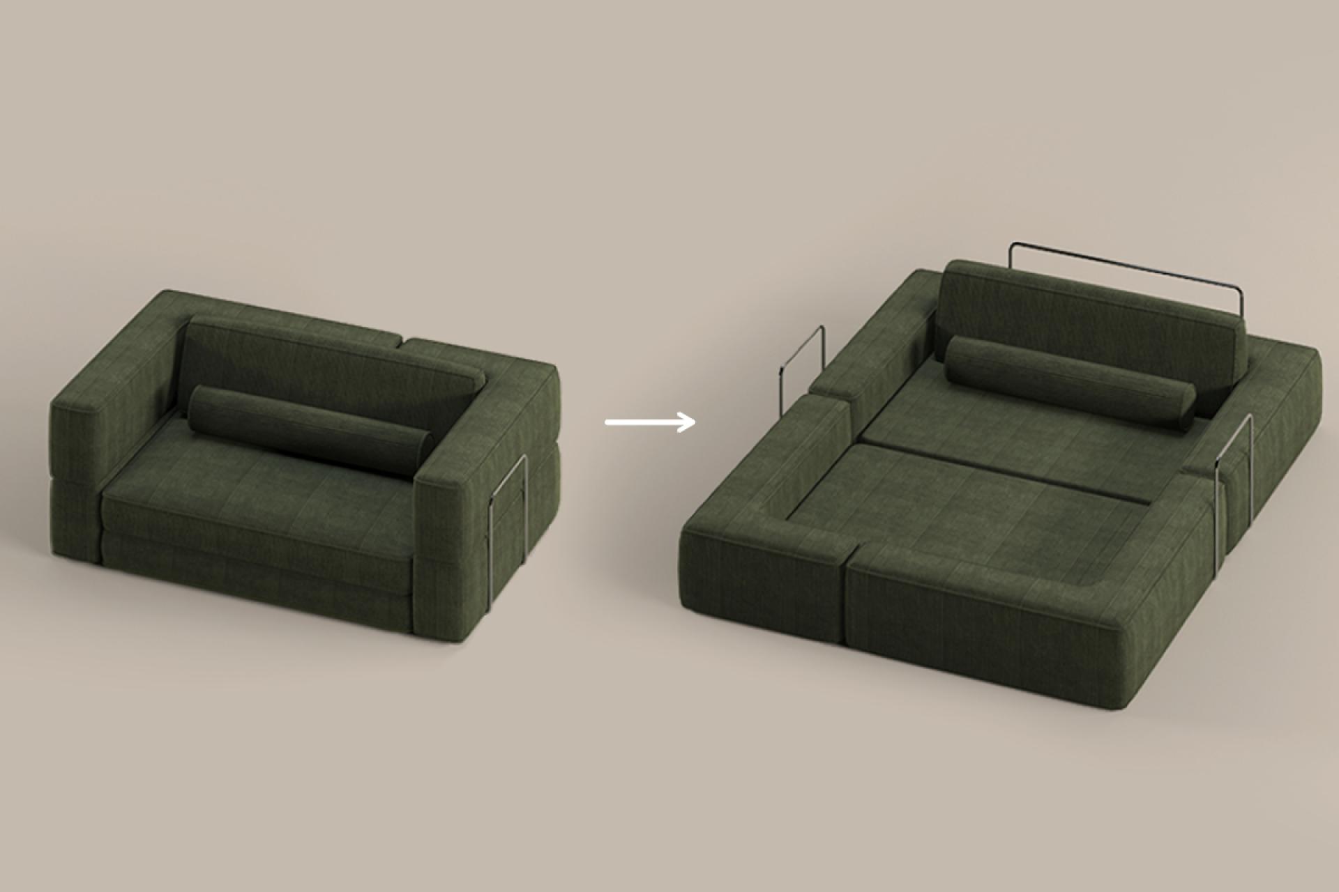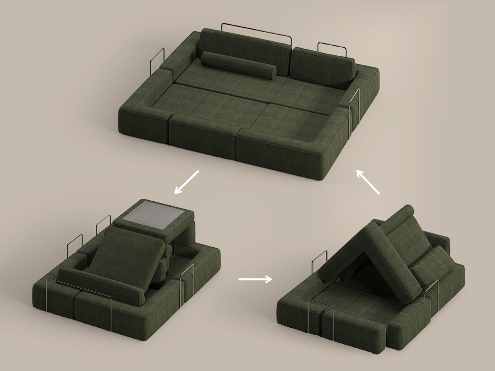 The sofa cushion module is a reversible design that folds up into a sofa cushion and unfolds into a standard mattress. Particularly suitable for small spaces or families that need multi-functional furniture. It not only saves space and reduces additional furniture expenses, but also effectively reduces resource waste and renews the planet.