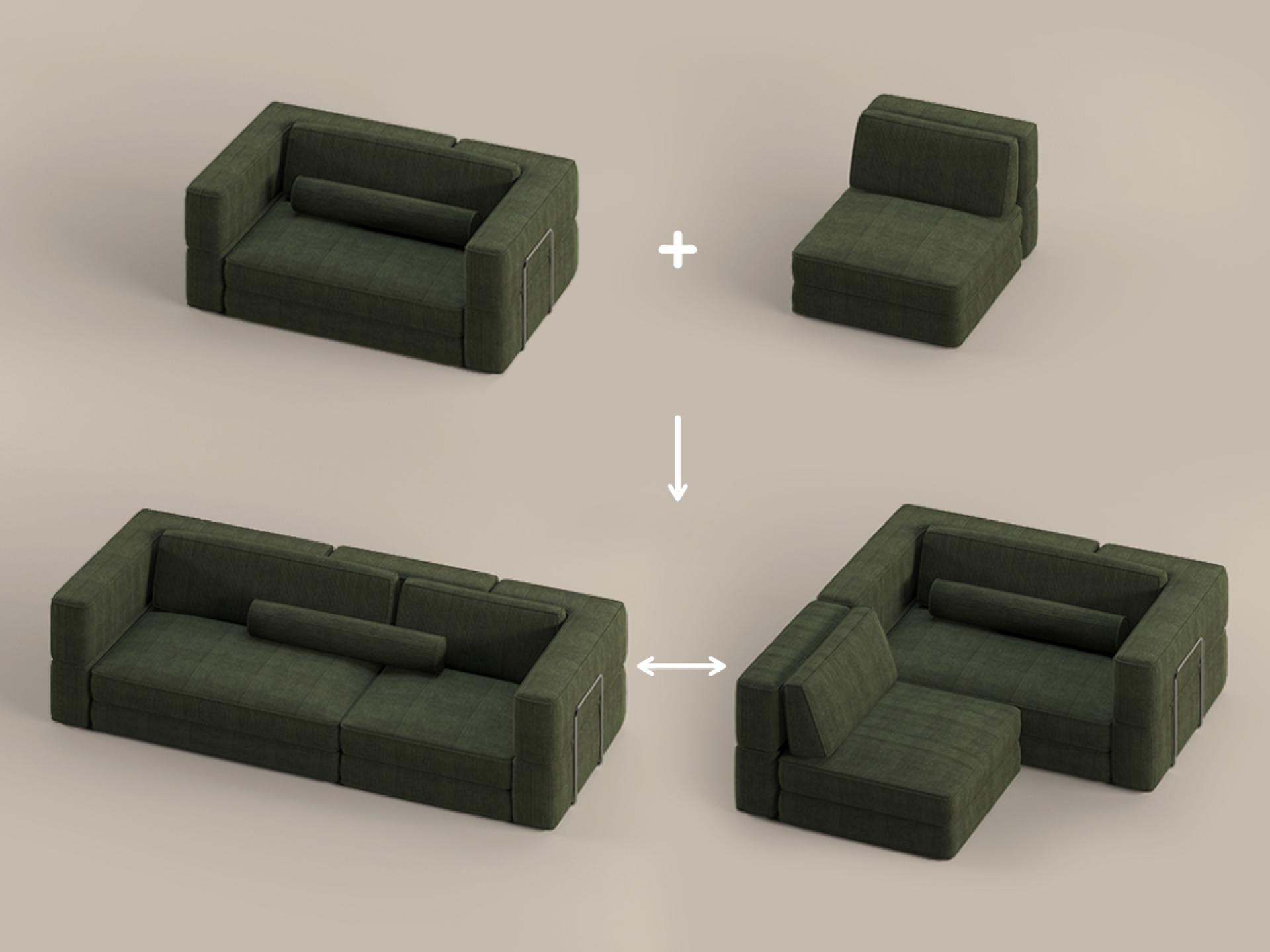 The sofa adopts a modular design, mainly divided into armrest module, cushion module and seat cushion module. Each module can be spliced and combined like Tetris, allowing users to create different layouts and shapes according to their own preferences and space needs.