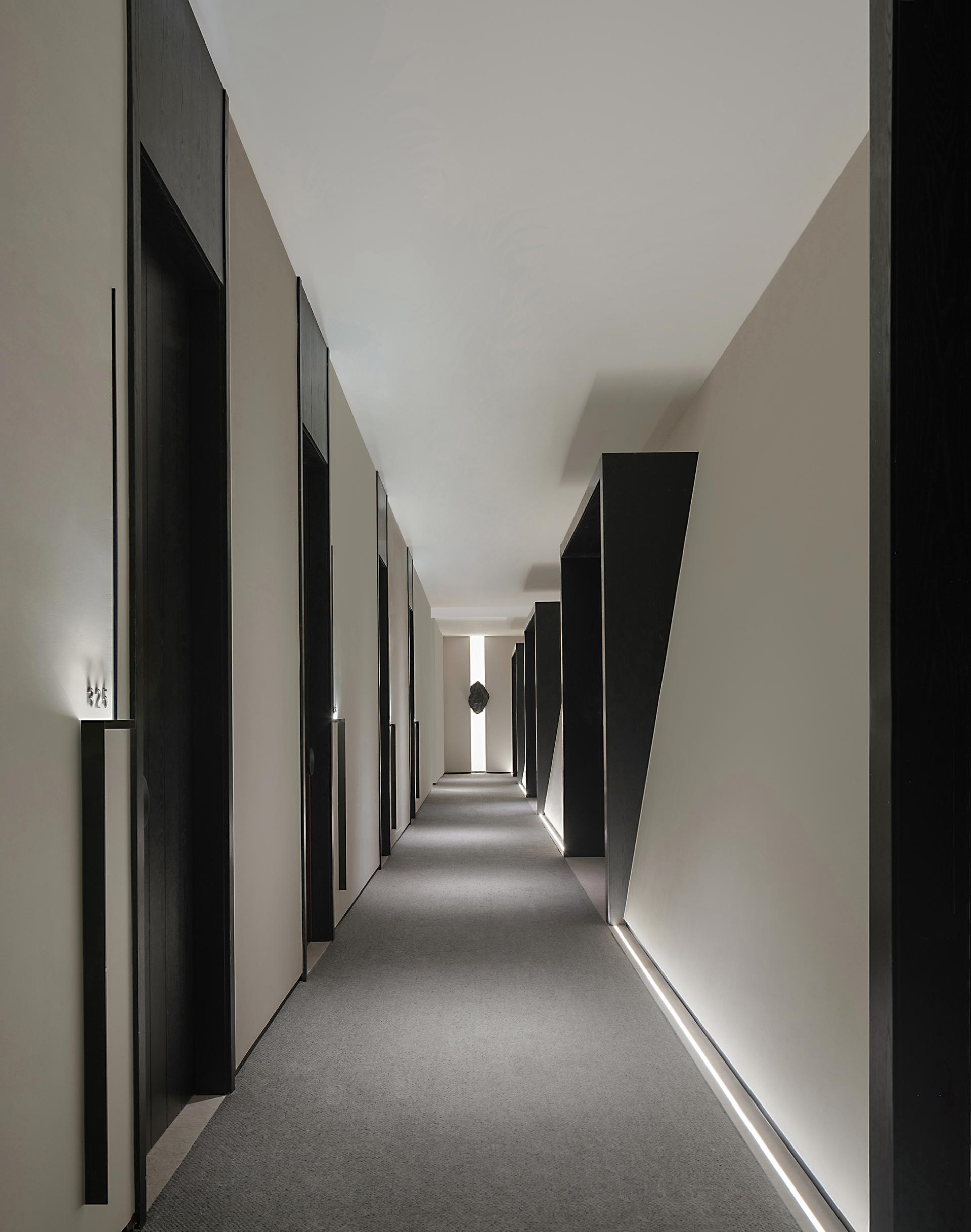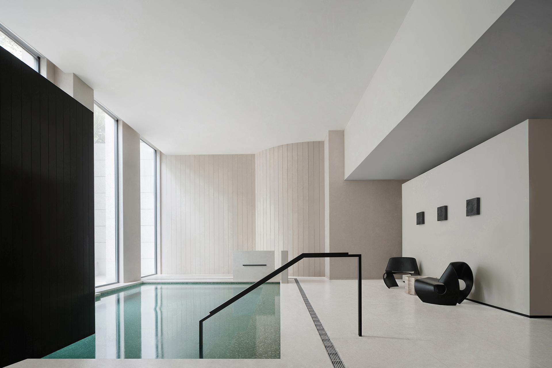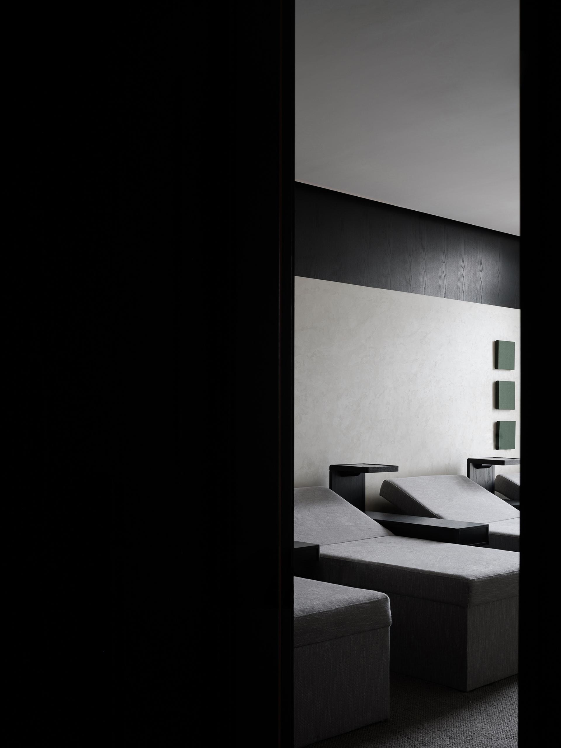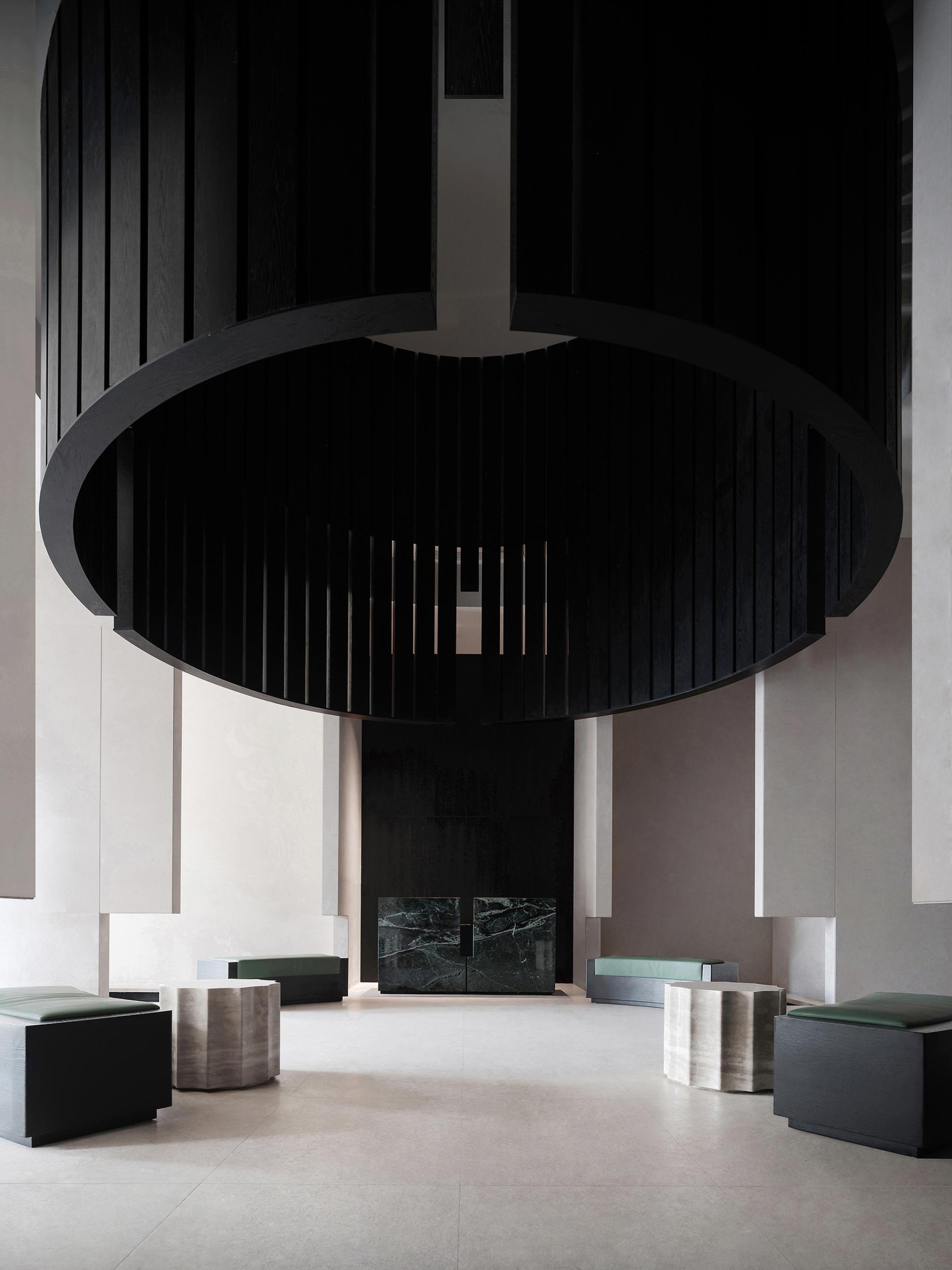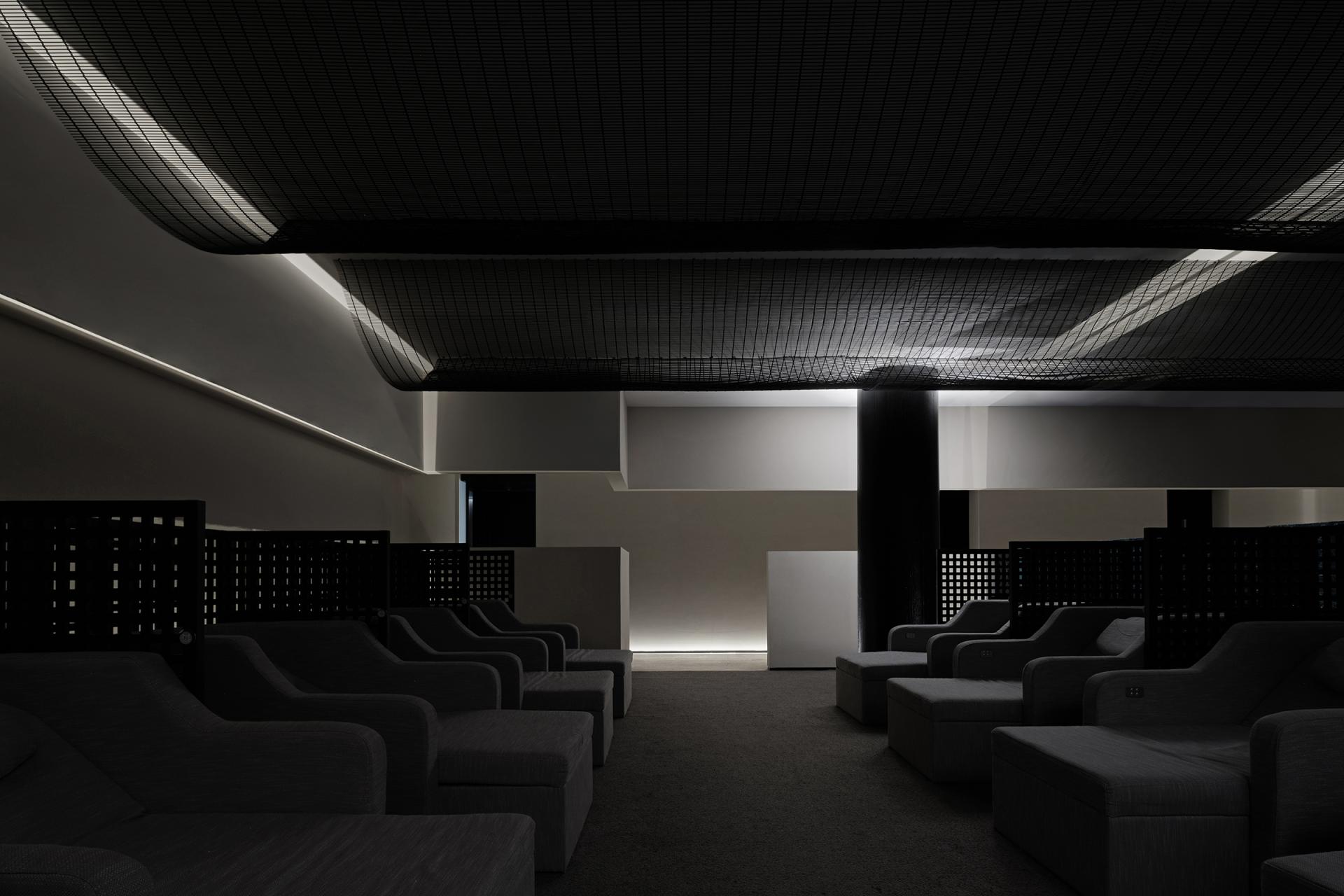 The exterior of the building is in the classical Western style, so the interior design follows the architectural form and is deconstructed with abstract expression. The basic unit of geometry is reshaped by superposition, intersperse, array and other techniques, and by controlling the proportion and scale of colors, materials and shapes, it forms a changing and unified spatial order. The atrium axis is symmetrical and the interface is balanced. The lobby space with a ceiling height of 7 meters, the middle of which extends vertically upwards, seems to have a dialogue with time and space. The circular geometric shape suspended in the air, the black wood grain is depressed, and the simple texture is intertwined with natural light, carving the power and beauty of the space. The sunken pool blends with the greenery outside the window, blurring the boundaries between the inside and outside, and bringing the four-season landscape indoors. At the same time, through superimposition and interspersed design techniques, the steam room is suspended above the water surface, redefining the spatial content. The luminous soft film with variable light in the hall guides and prompts the direction of the experiencer by controlling the light, and the multiple paths in the space, the line of sight and the movement line change, allowing the experiencer to flow in the space. The relationship between the display column system and the staircase is orderly. The division and enclosure between interfaces is the existence of a non-static state of space. By deconstructing the large space, the SPA area is placed in a container. Immersing yourself in it is as if you have entered another dimension of space, briefly withdrawing from the hustle and bustle of the city, and enjoying the intimate and revered physical and mental healing. The straw texture of the walls, the rough stone texture of the bathing area, and the log smell of the floor...... The subtle details are immersed in nature everywhere, and a light shines in from between the walls, adding a bit of interest.