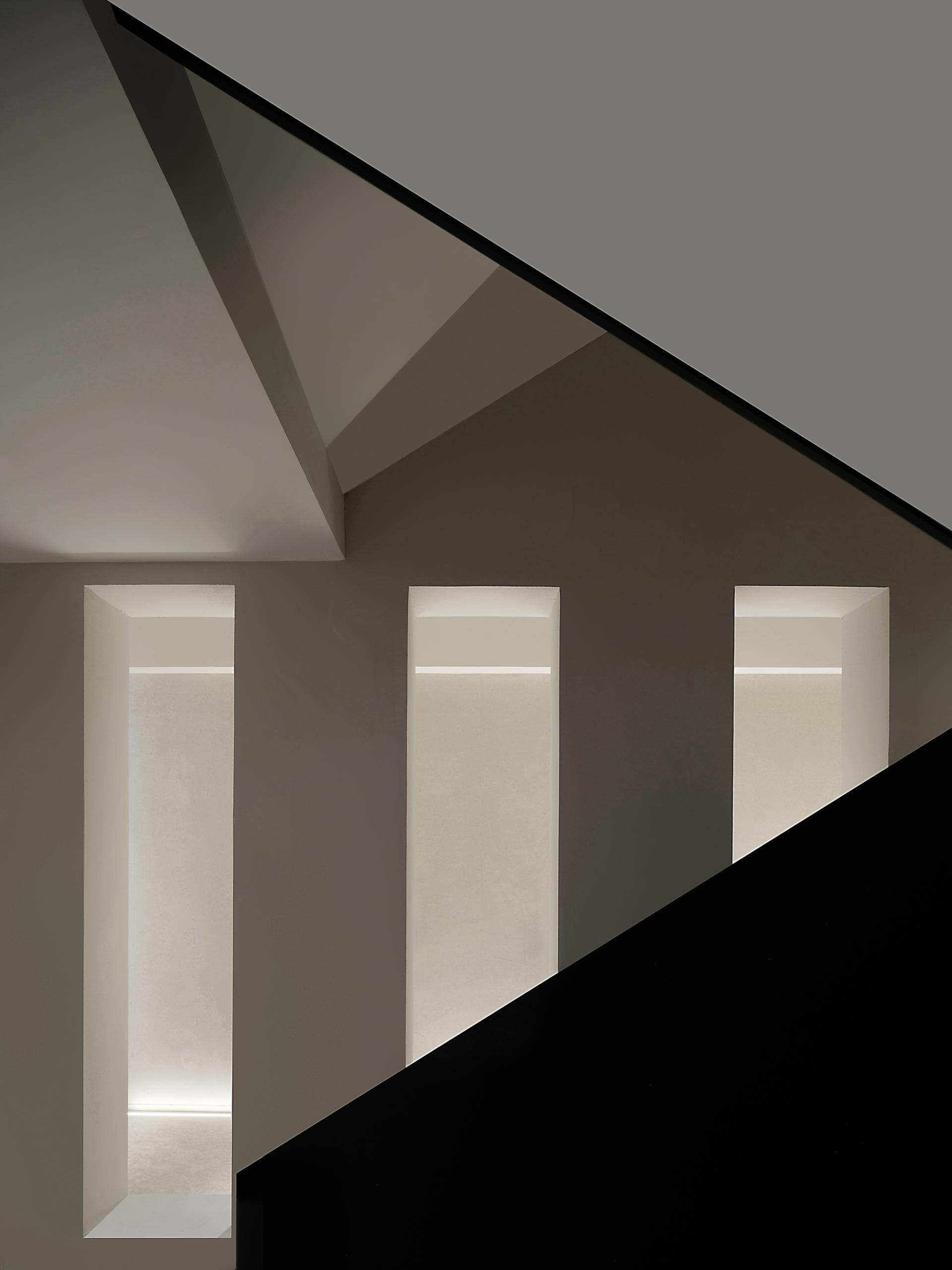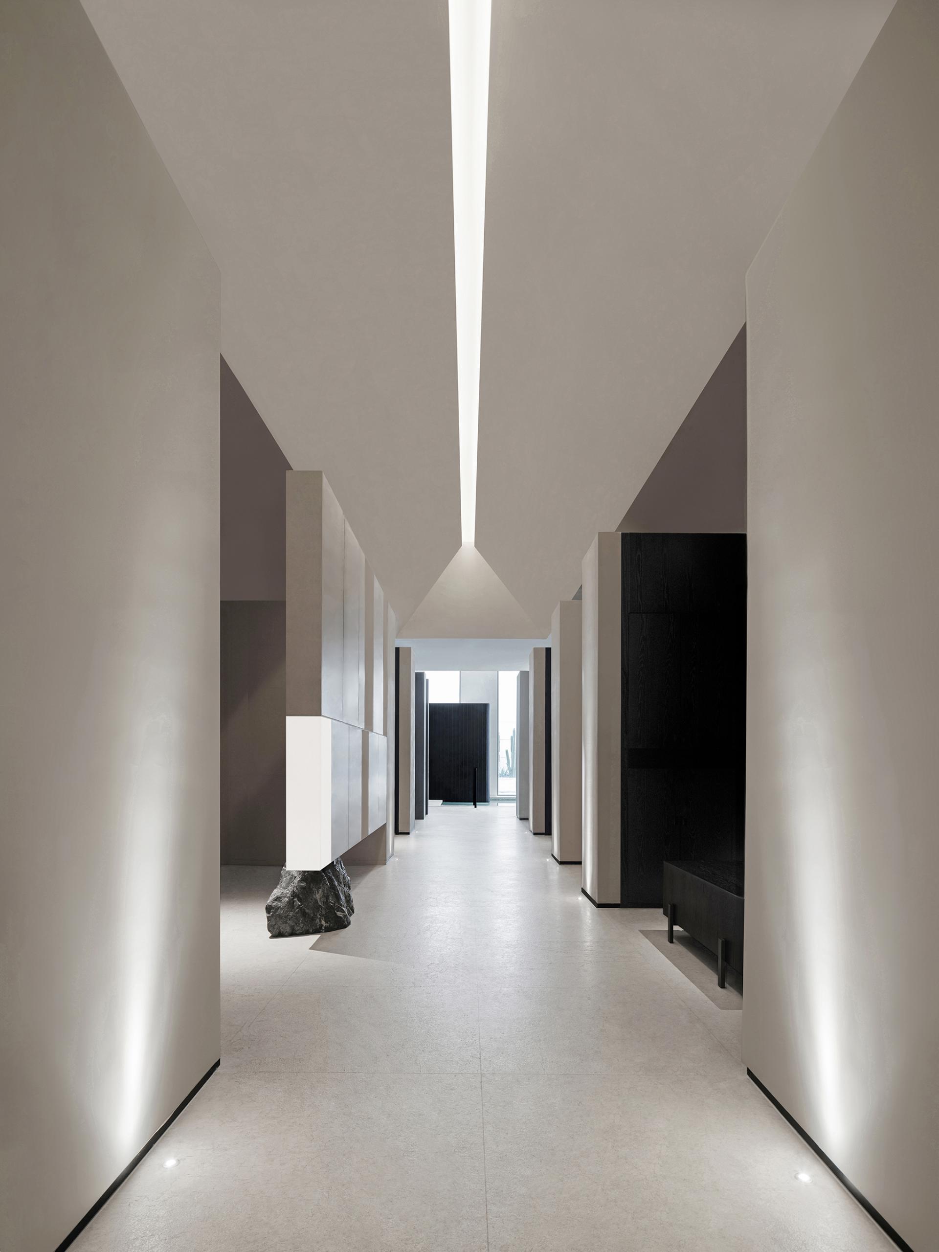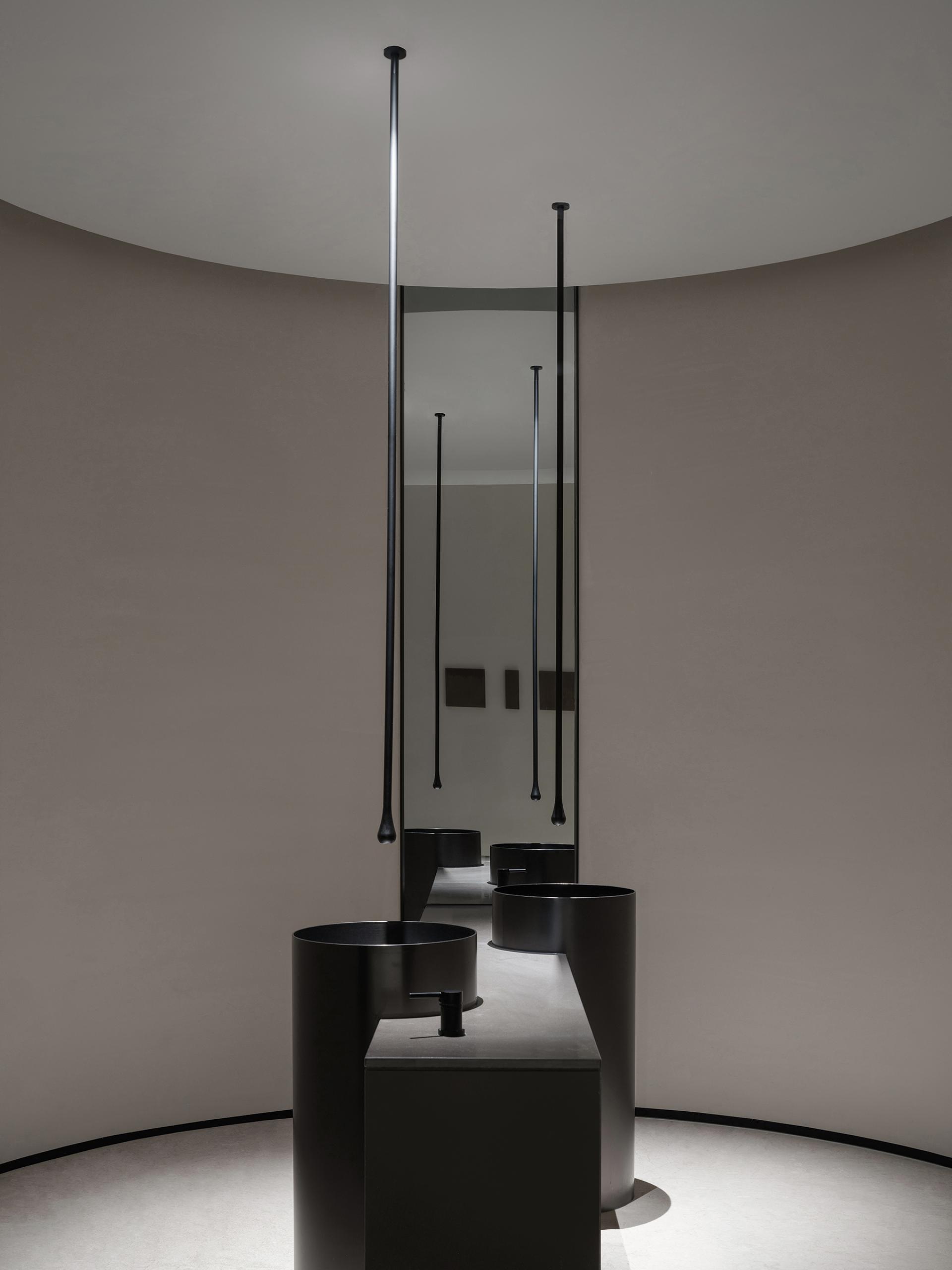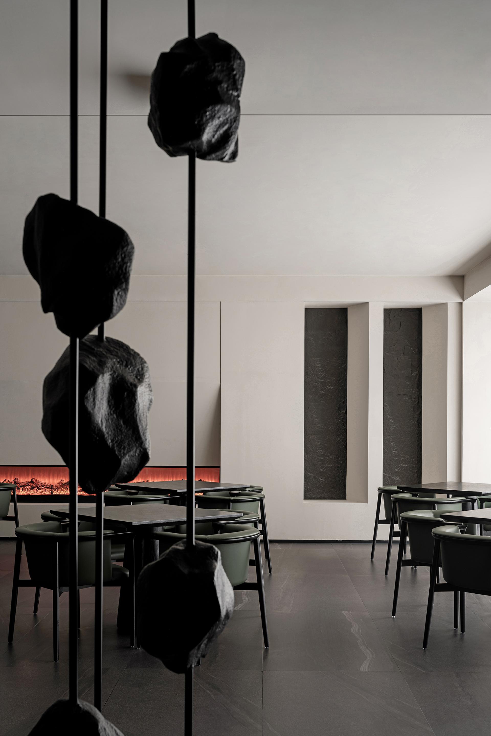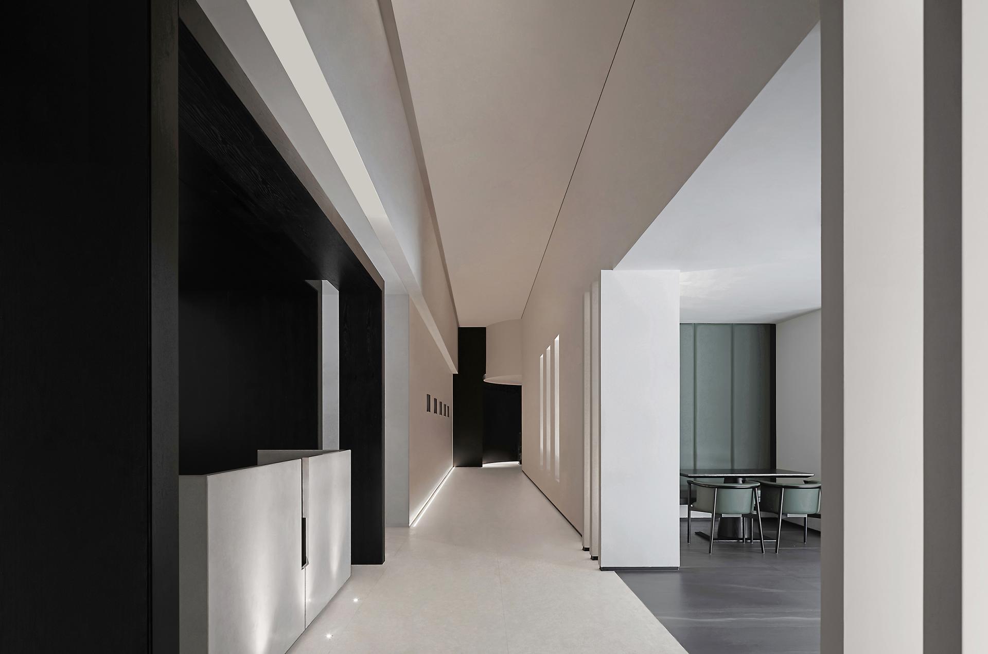The exterior of the building is in the classical Western style, so the interior design follows the architectural form and is deconstructed with abstract expression. The basic unit of geometry is reshaped by superposition, intersperse, array and other techniques, and by controlling the proportion and scale of colors, materials and shapes, it forms a changing and unified spatial order. The atrium axis is symmetrical and the interface is balanced. The lobby space with a ceiling height of 7 meters, the middle of which extends vertically upwards, seems to have a dialogue with time and space. The circular geometric shape suspended in the air, the black wood grain is depressed, and the simple texture is intertwined with natural light, carving the power and beauty of the space. The sunken pool blends with the greenery outside the window, blurring the boundaries between the inside and outside, and bringing the four-season landscape indoors. At the same time, through superimposition and interspersed design techniques, the steam room is suspended above the water surface, redefining the spatial content. The luminous soft film with variable light in the hall guides and prompts the direction of the experiencer by controlling the light, and the multiple paths in the space, the line of sight and the movement line change, allowing the experiencer to flow in the space. The relationship between the display column system and the staircase is orderly. The division and enclosure between interfaces is the existence of a non-static state of space. By deconstructing the large space, the SPA area is placed in a container. Immersing yourself in it is as if you have entered another dimension of space, briefly withdrawing from the hustle and bustle of the city, and enjoying the intimate and revered physical and mental healing. The straw texture of the walls, the rough stone texture of the bathing area, and the log smell of the floor...... The subtle details are immersed in nature everywhere, and a light shines in from between the walls, adding a bit of interest.