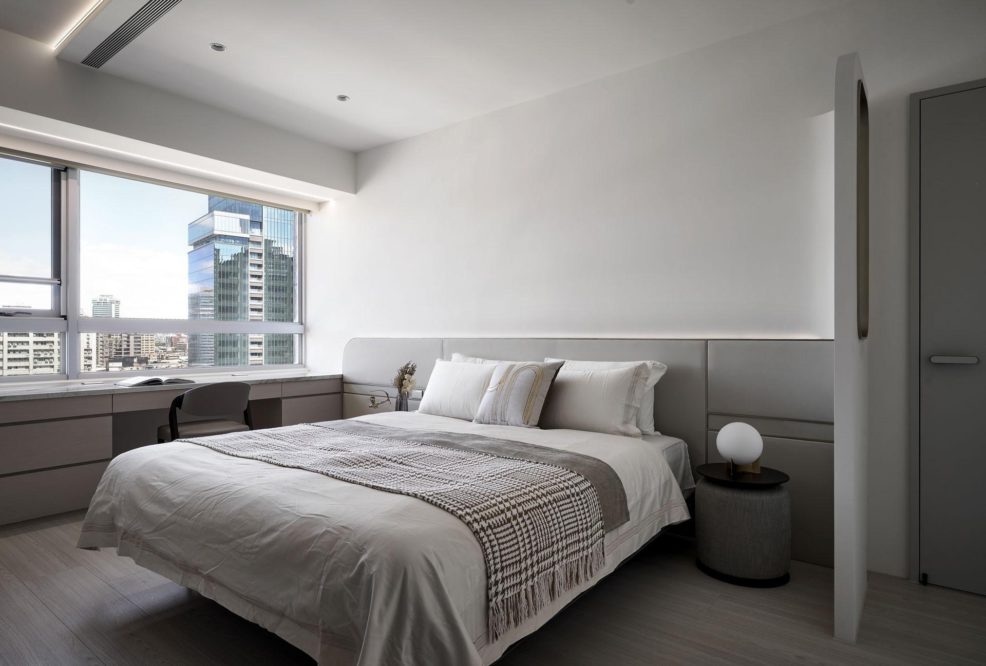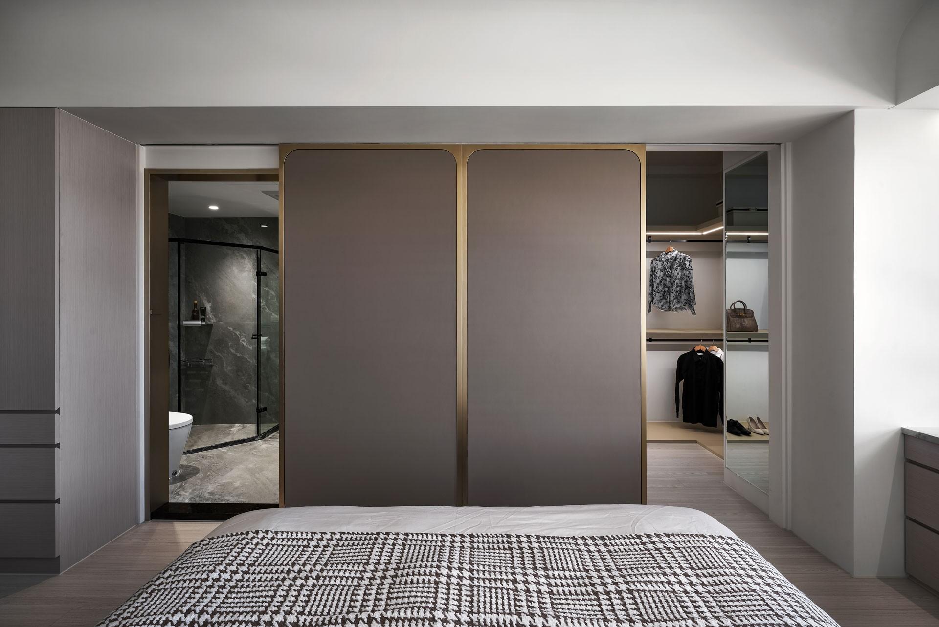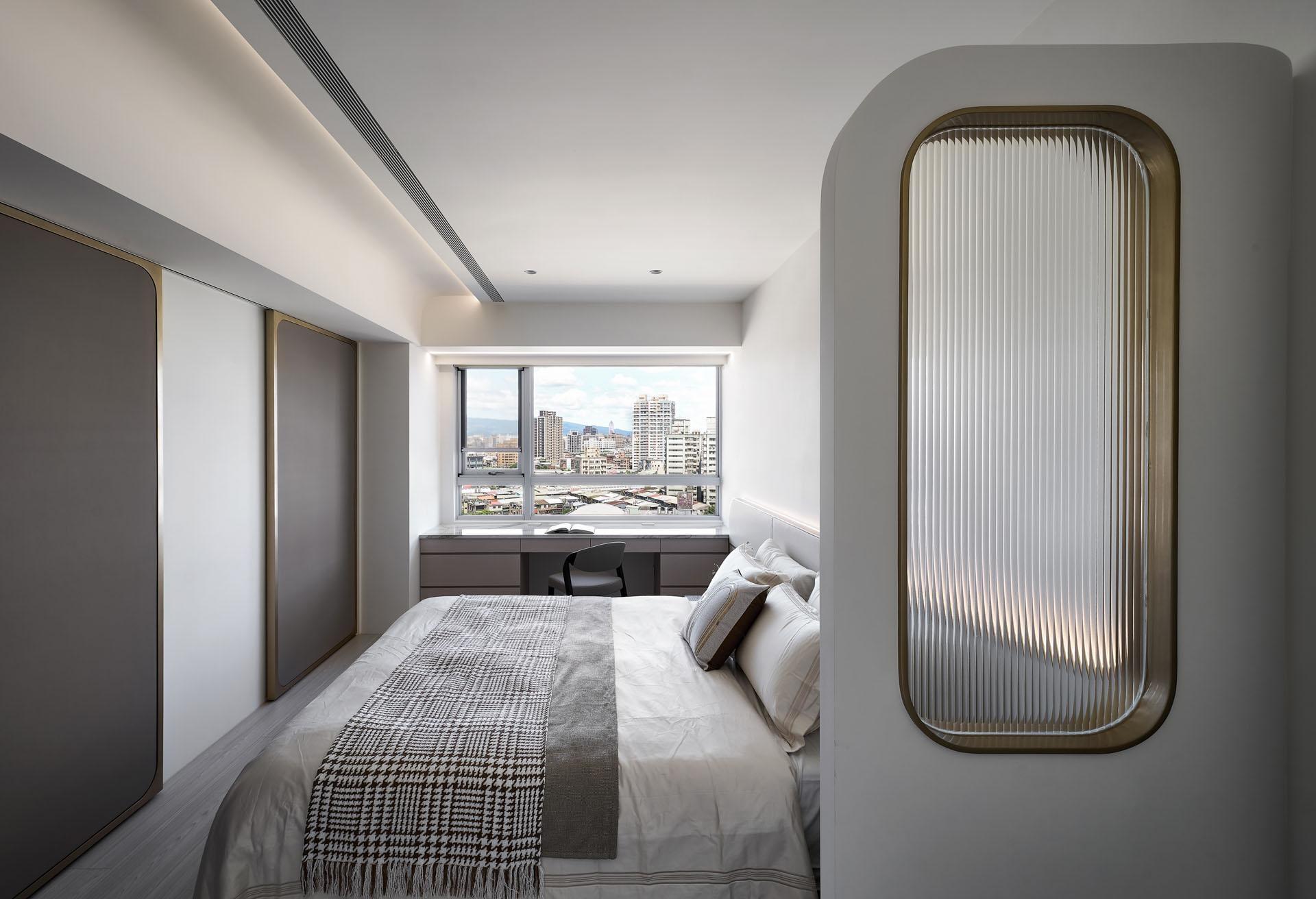 In the master bedroom, a partition wall ensures privacy, with ribbed glass panels in the center allowing light to pass through. The partition seamlessly extends with a curved design that connects to the headboard wall, bridging different spatial elements to create a more fluid visual flow. Symmetrical sliding doors create a visual balance, while the details feature rounded edges that subtly reflect the theme of harmony and completeness.