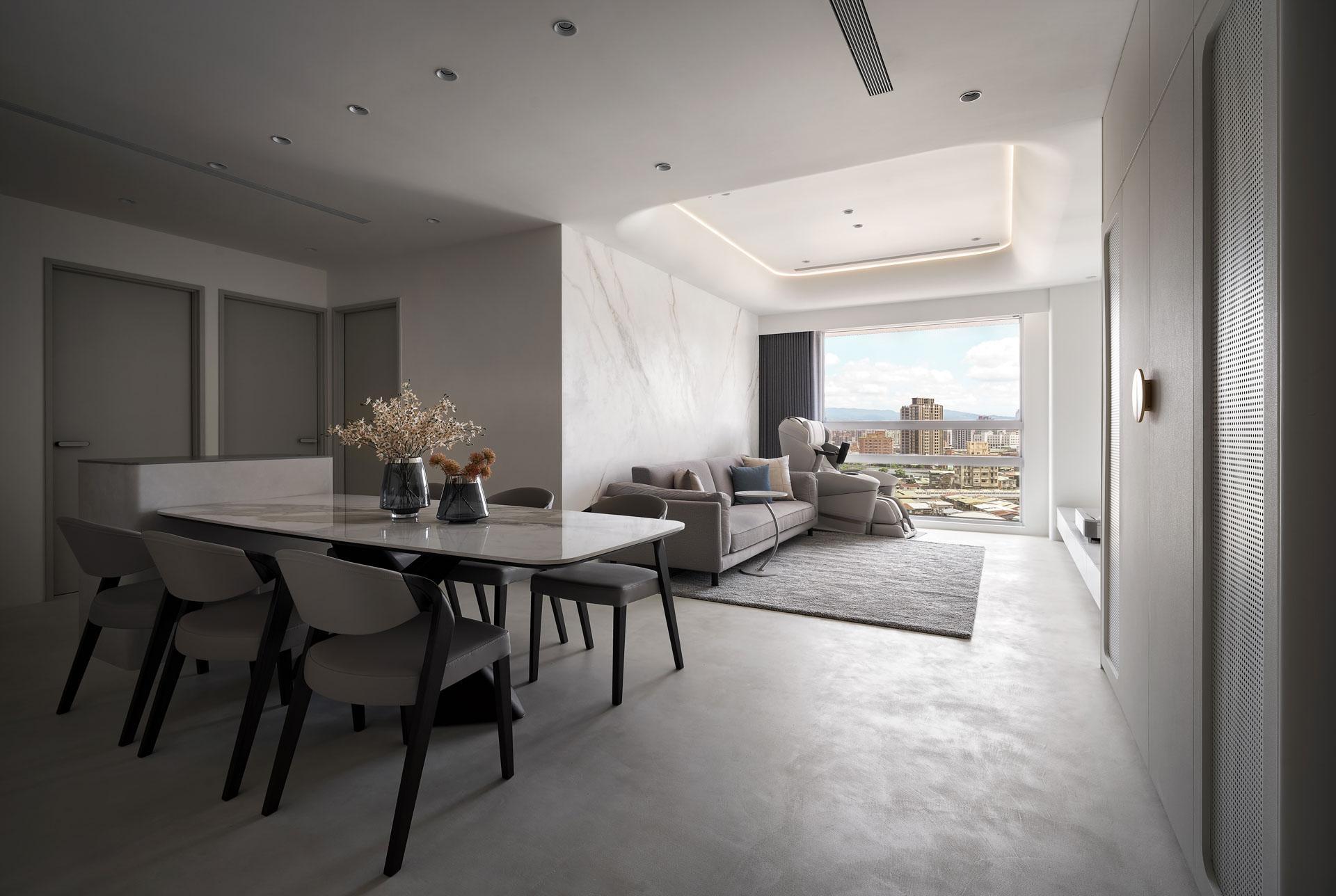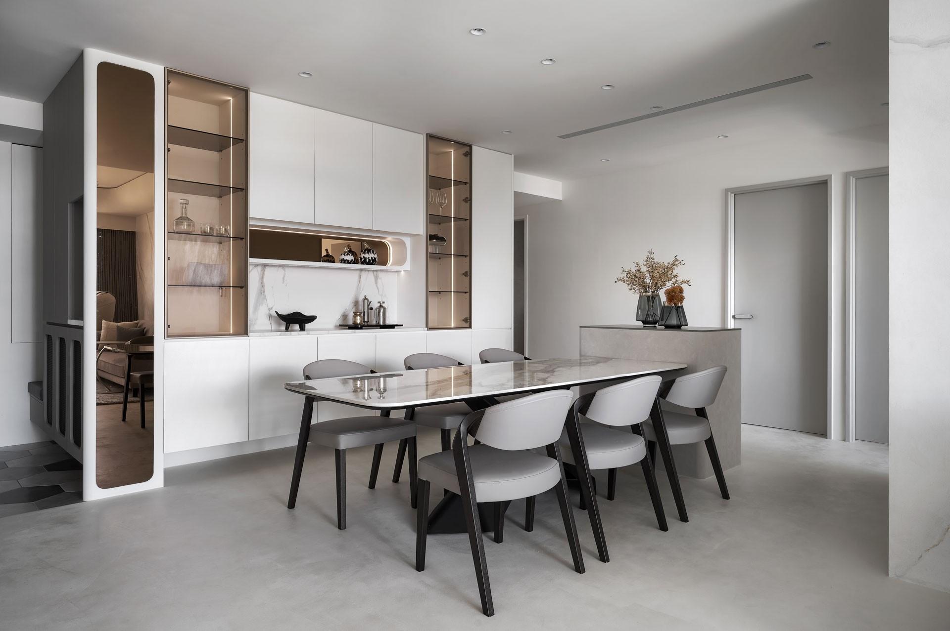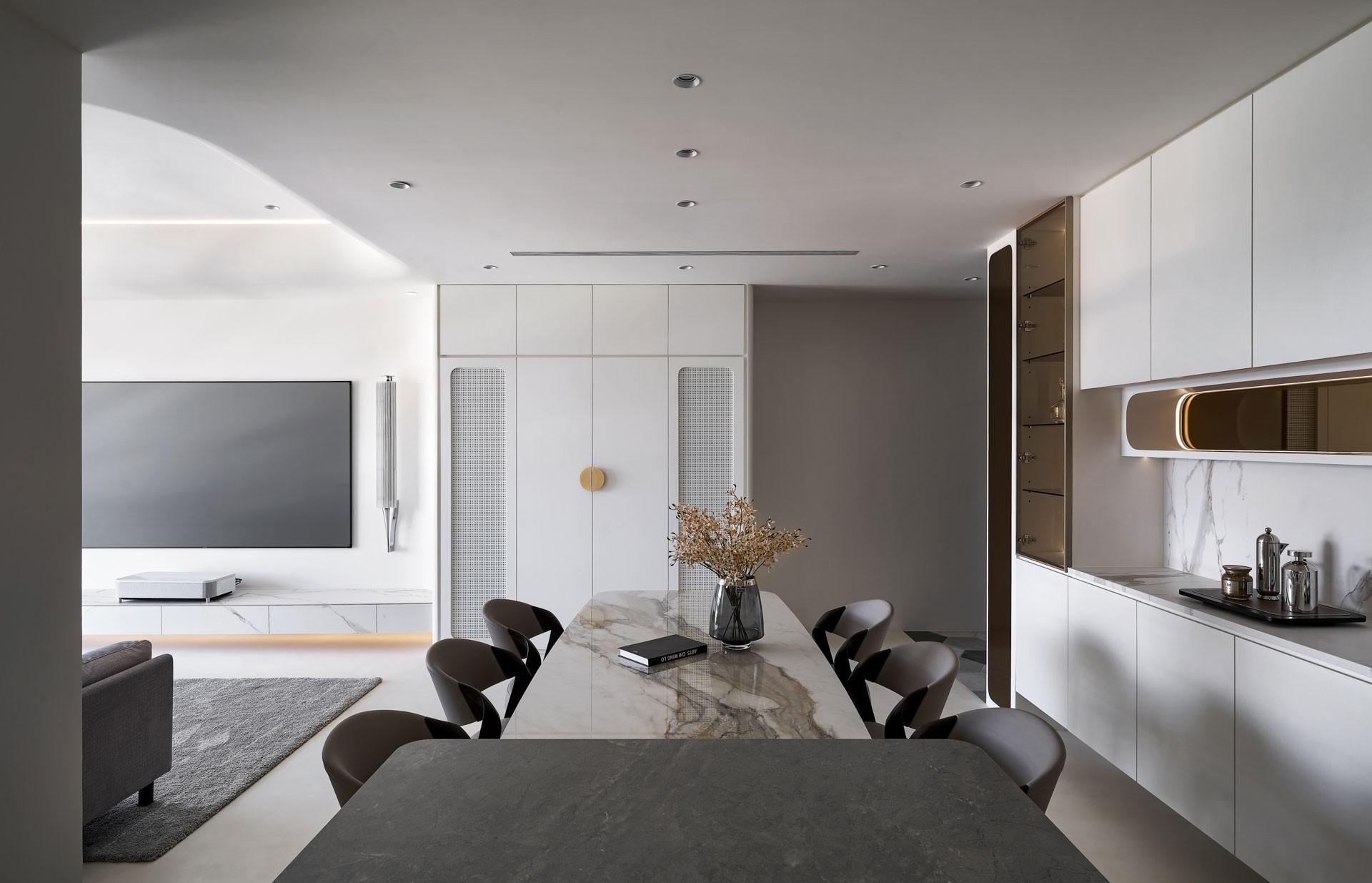 The entryway is designed with gray in different shades, creating a stable and calming first impression. Behind the entryway, expansive windows offer unobstructed views of the surroundings, allowing residents to enjoy the changing seasons. In the light-toned space, subtle details are thoughtfully woven, reflecting a harmonious balance of layered textures. The pristine white TV feature wall incorporates gentle curves on both sides, softening the rigidity of a monochromatic color scheme and flat surfaces. The transitions between volumes create a three-dimensional visual effect, while the overhead lighting accentuates the interplay of light and shadow, enriching a sense of depth. The flooring features hand-troweled textures with varying depths, while the wall behind the sofa showcases the natural texture of stones, effortlessly bringing the natural landscape into the space. In the dining area, materials like bronze mirrors and glass introduce a luminous charm. Bathed in the soft glow of LED strips, these elements reflect light and enrich the dining atmosphere. These details add a sense of comfort and warmth to the serene space.