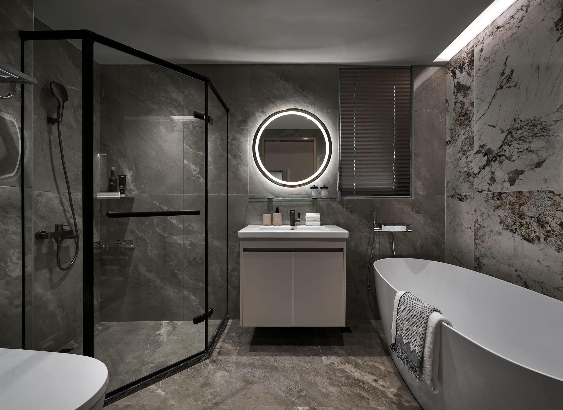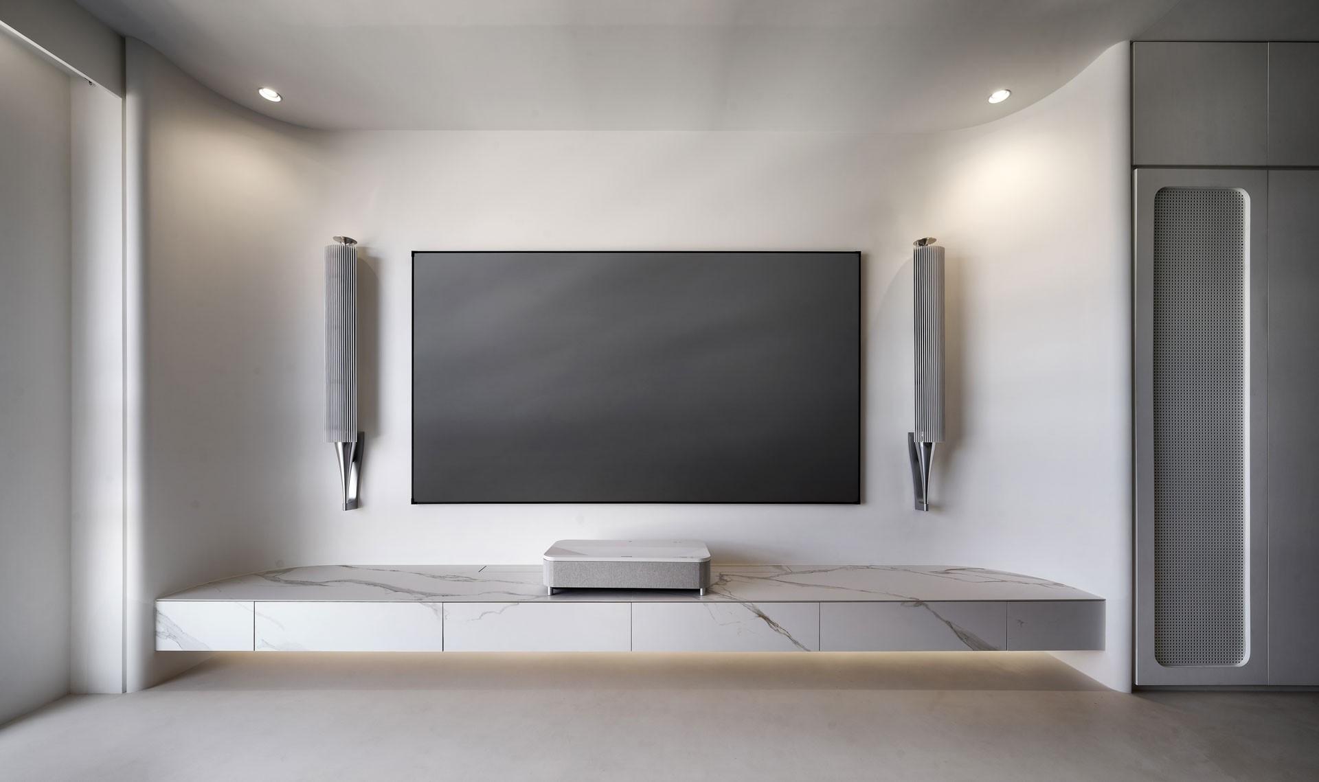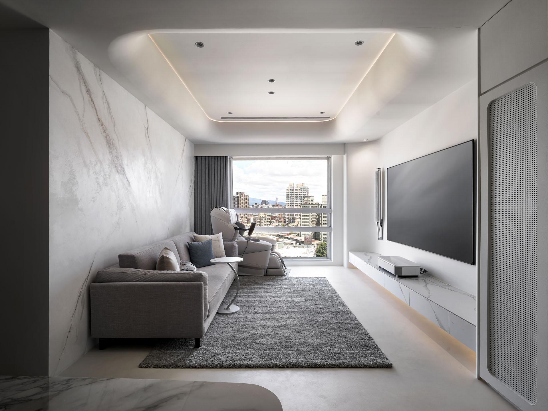 The entryway is designed with gray in different shades, creating a stable and calming first impression. Behind the entryway, expansive windows offer unobstructed views of the surroundings, allowing residents to enjoy the changing seasons. In the light-toned space, subtle details are thoughtfully woven, reflecting a harmonious balance of layered textures. The pristine white TV feature wall incorporates gentle curves on both sides, softening the rigidity of a monochromatic color scheme and flat surfaces. The transitions between volumes create a three-dimensional visual effect, while the overhead lighting accentuates the interplay of light and shadow, enriching a sense of depth. The flooring features hand-troweled textures with varying depths, while the wall behind the sofa showcases the natural texture of stones, effortlessly bringing the natural landscape into the space. In the dining area, materials like bronze mirrors and glass introduce a luminous charm. Bathed in the soft glow of LED strips, these elements reflect light and enrich the dining atmosphere. These details add a sense of comfort and warmth to the serene space.