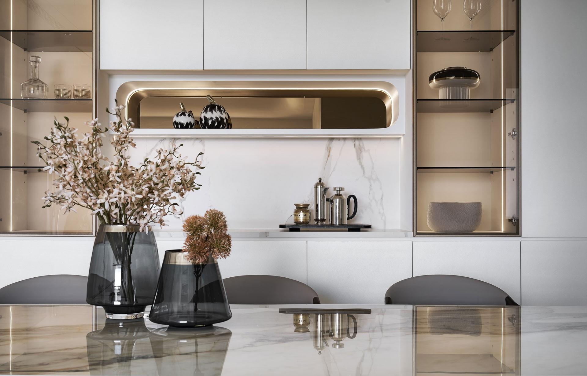 The residence enjoys an abundance of natural light and beautiful views. The open layout invites ample natural light to fill the space, creating an airy and welcoming ambiance. The living room is connected to the dining area, fostering a sense of togetherness and strengthening family bonds. To create an ideal tranquil and comfortable living space for the house owners, a base of pure gray and white sets the tone for the space, complemented by translucent materials such as silver stones, mirrors, and glass. Minimalist design embodies the “less is more” philosophy. It seeks to distill the essence of space by stripping away excess ornamentation, intricate details, and superfluous features.