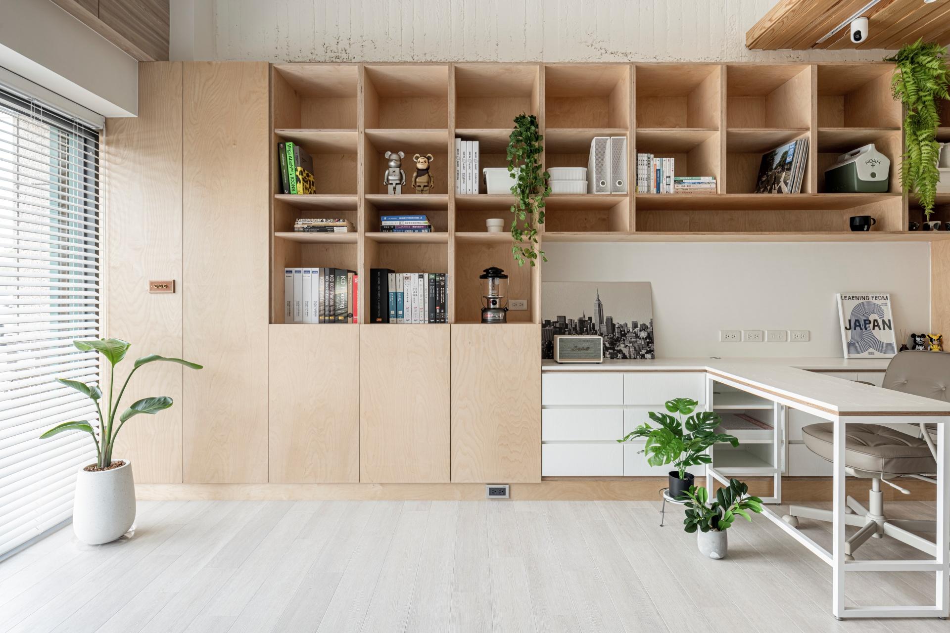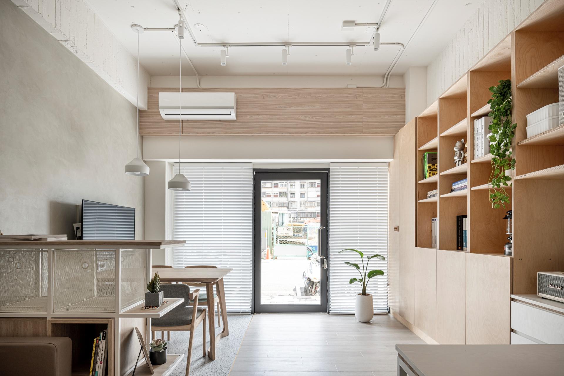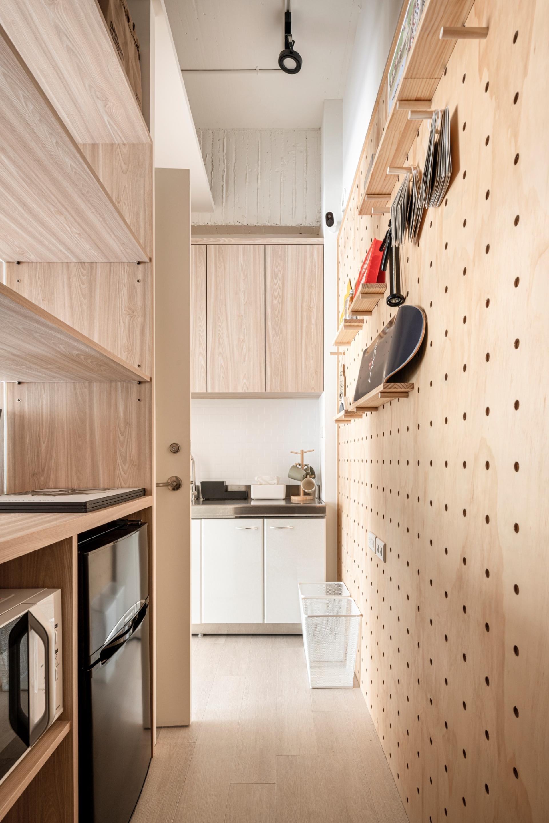 In terms of functionality, the layout emphasizes the seamless integration of storage and display. A cabinet is placed beneath the beam, with display compartments of varying sizes to break up the rigidity of the structure. A recessed countertop in the center enhances visual balance and provides breathing space for the eyes. Adjacent to the lounge area, a built-in display cabinet is secured to a hollowed-out wall, creating a sense of balance between the solid and void. Additionally, pegboard accessories are thoughtfully incorporated into the background, enhancing the overall sense of fluidity and adding visual depth to the space.