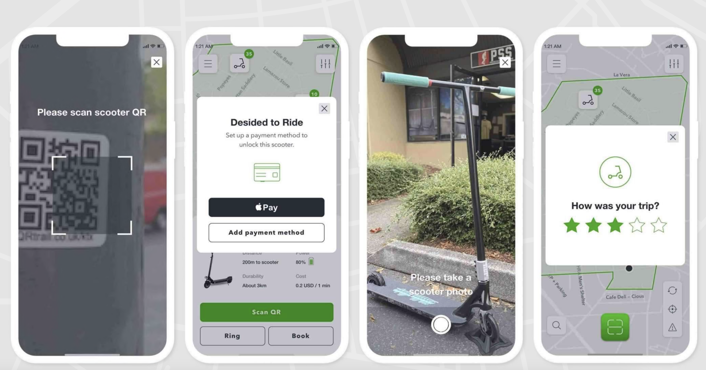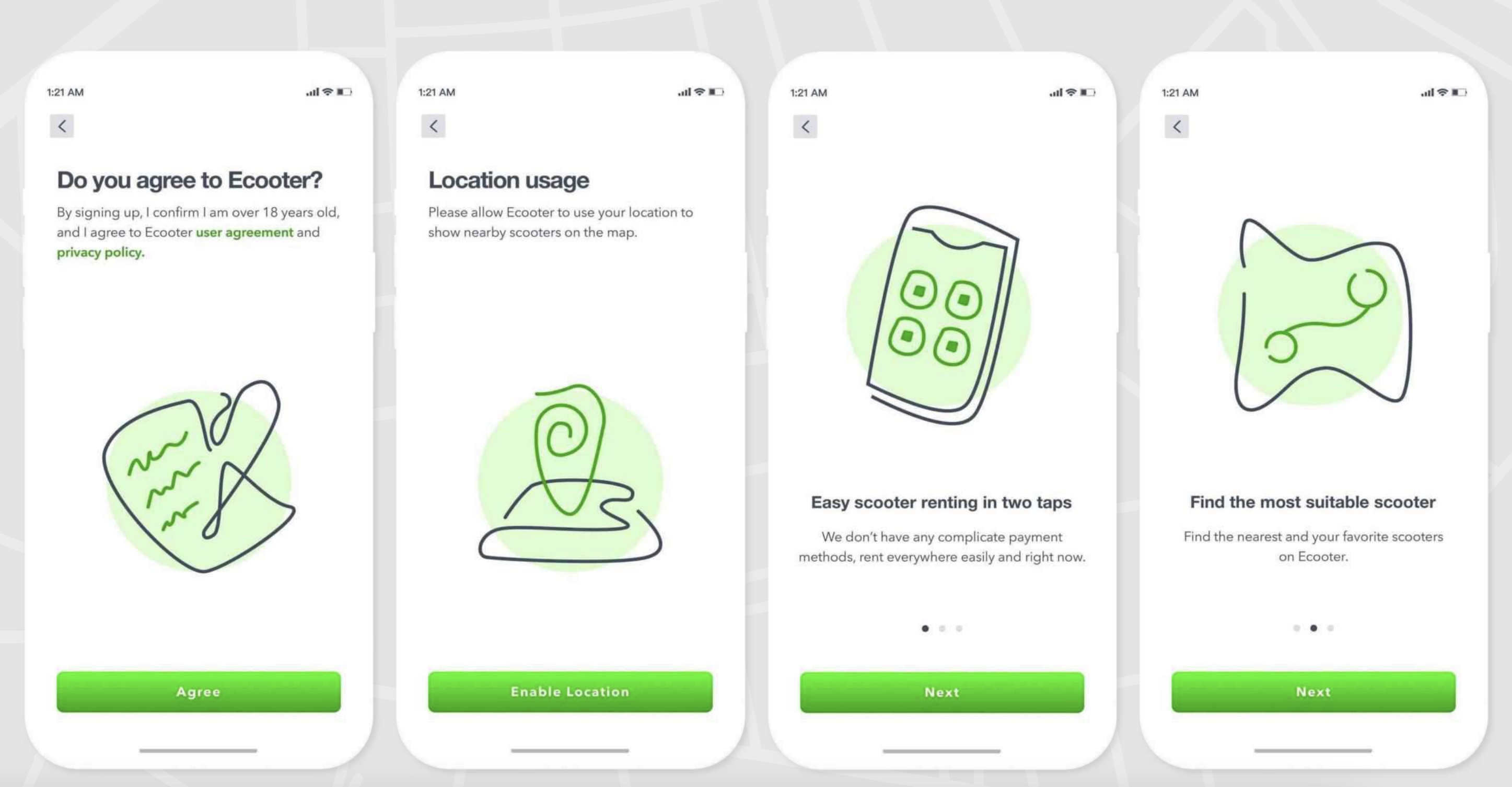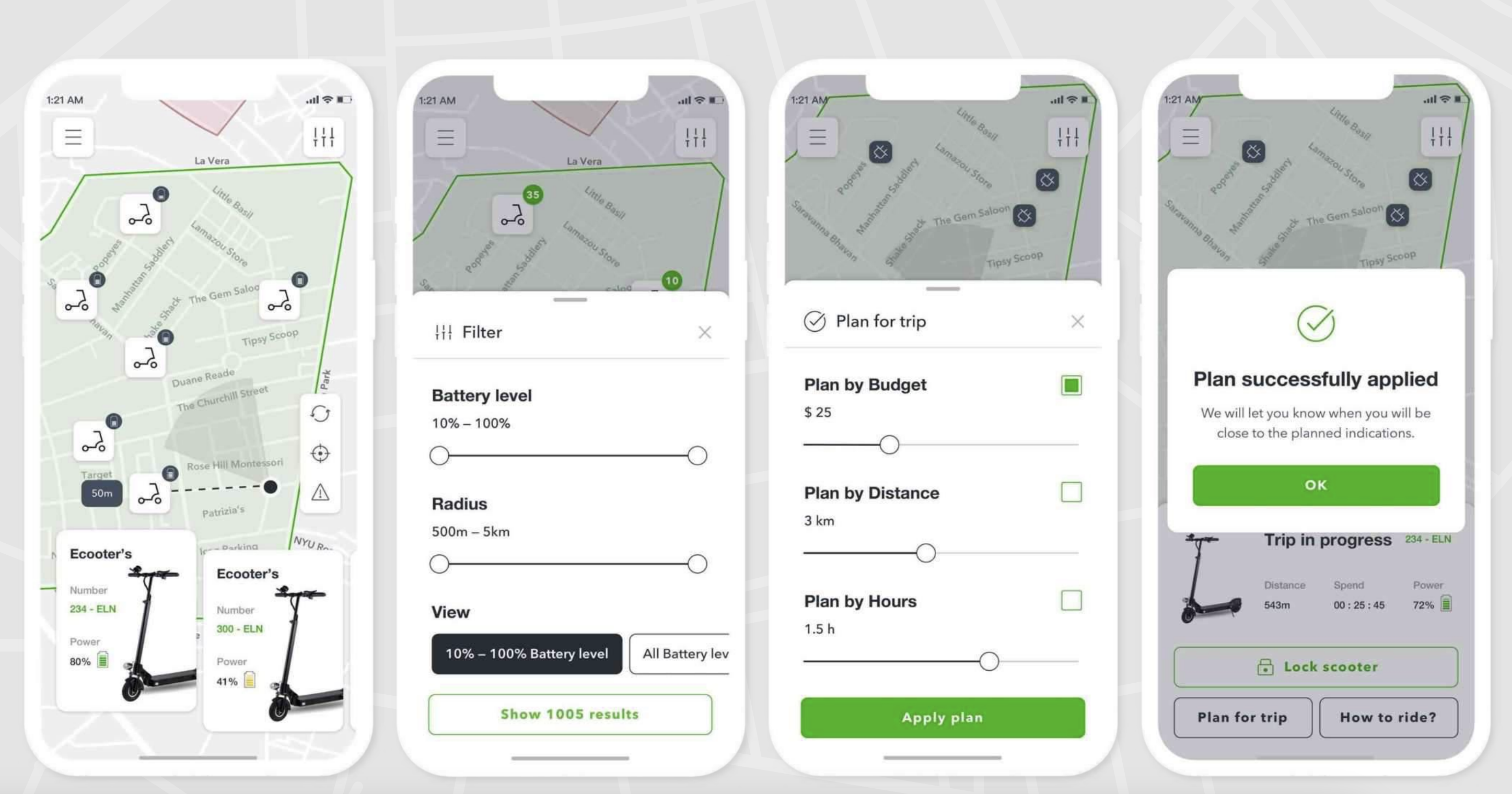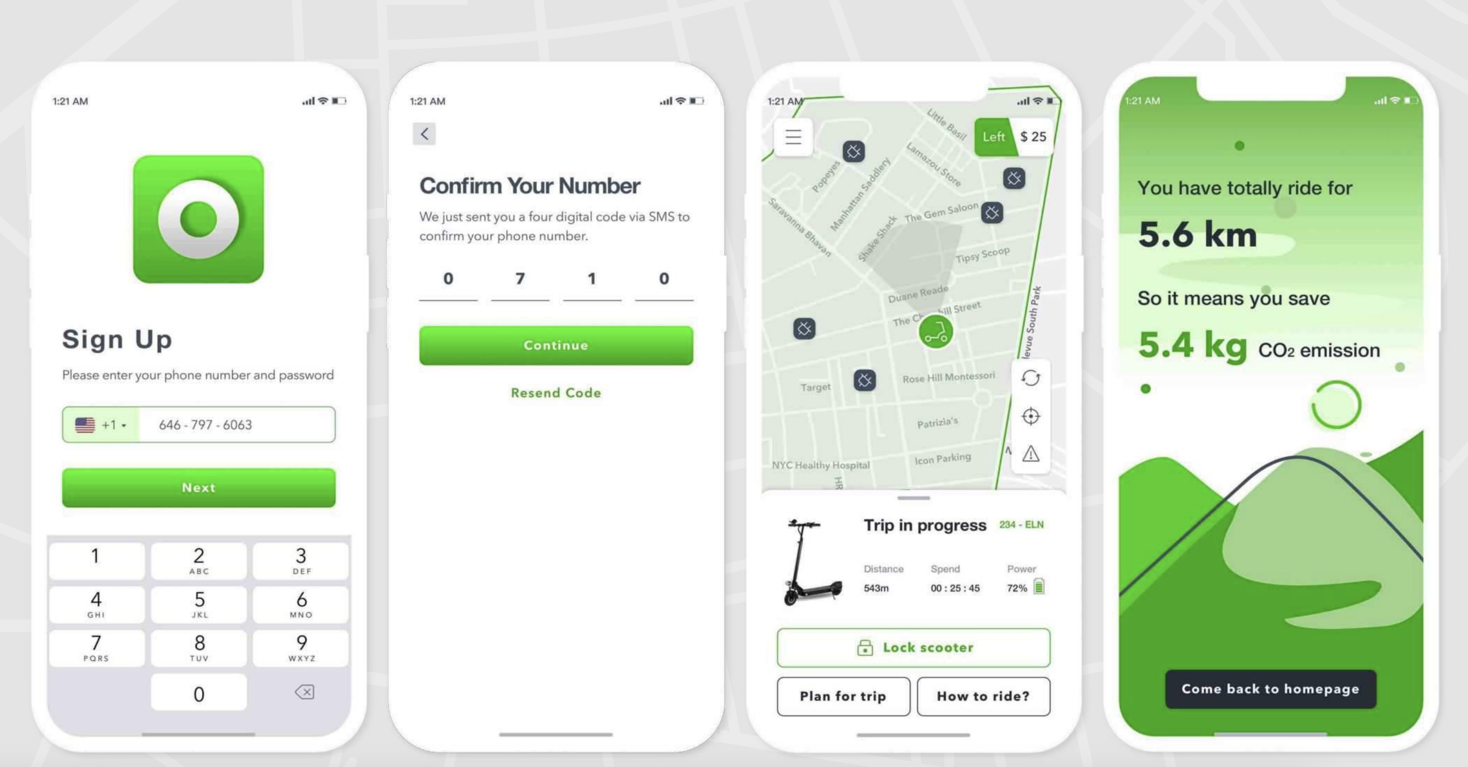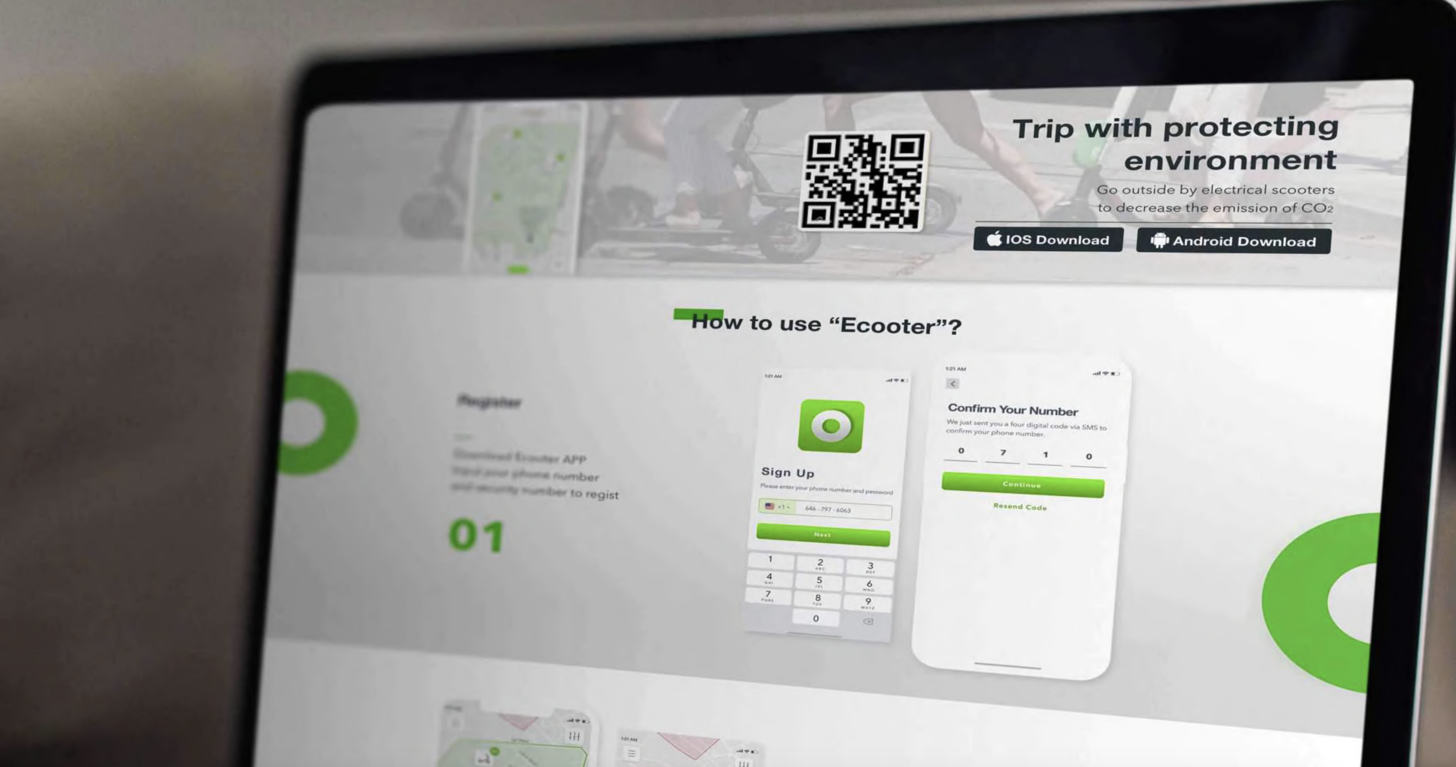 The app makes it easy to book scooters, check availability, and see battery levels and even shows how much CO2 users save. The website explains Ecooter’s goals and billboards in busy areas remind people about choosing greener travel.