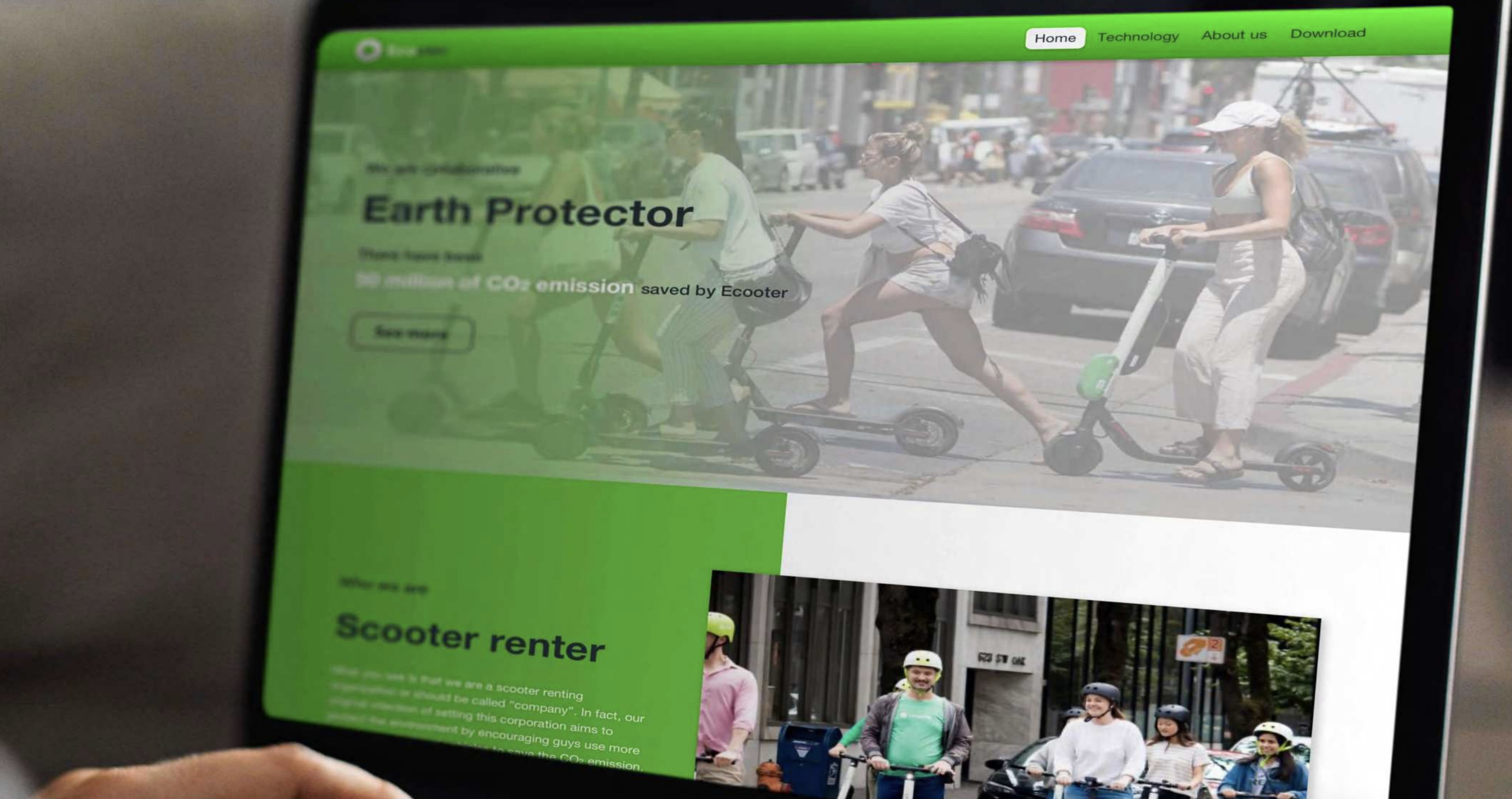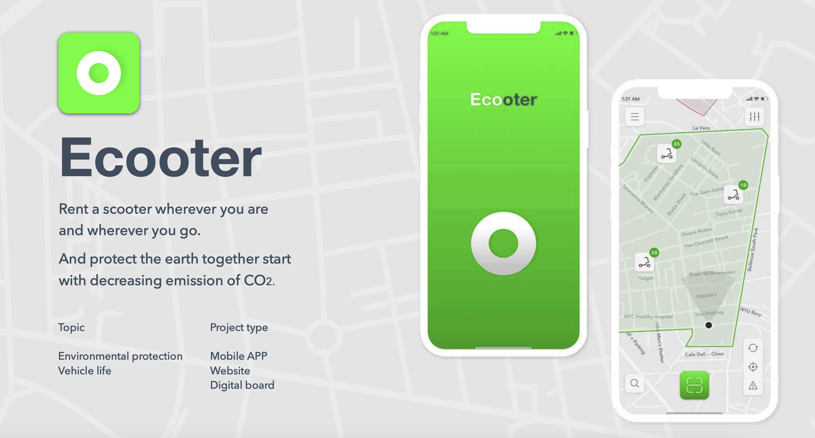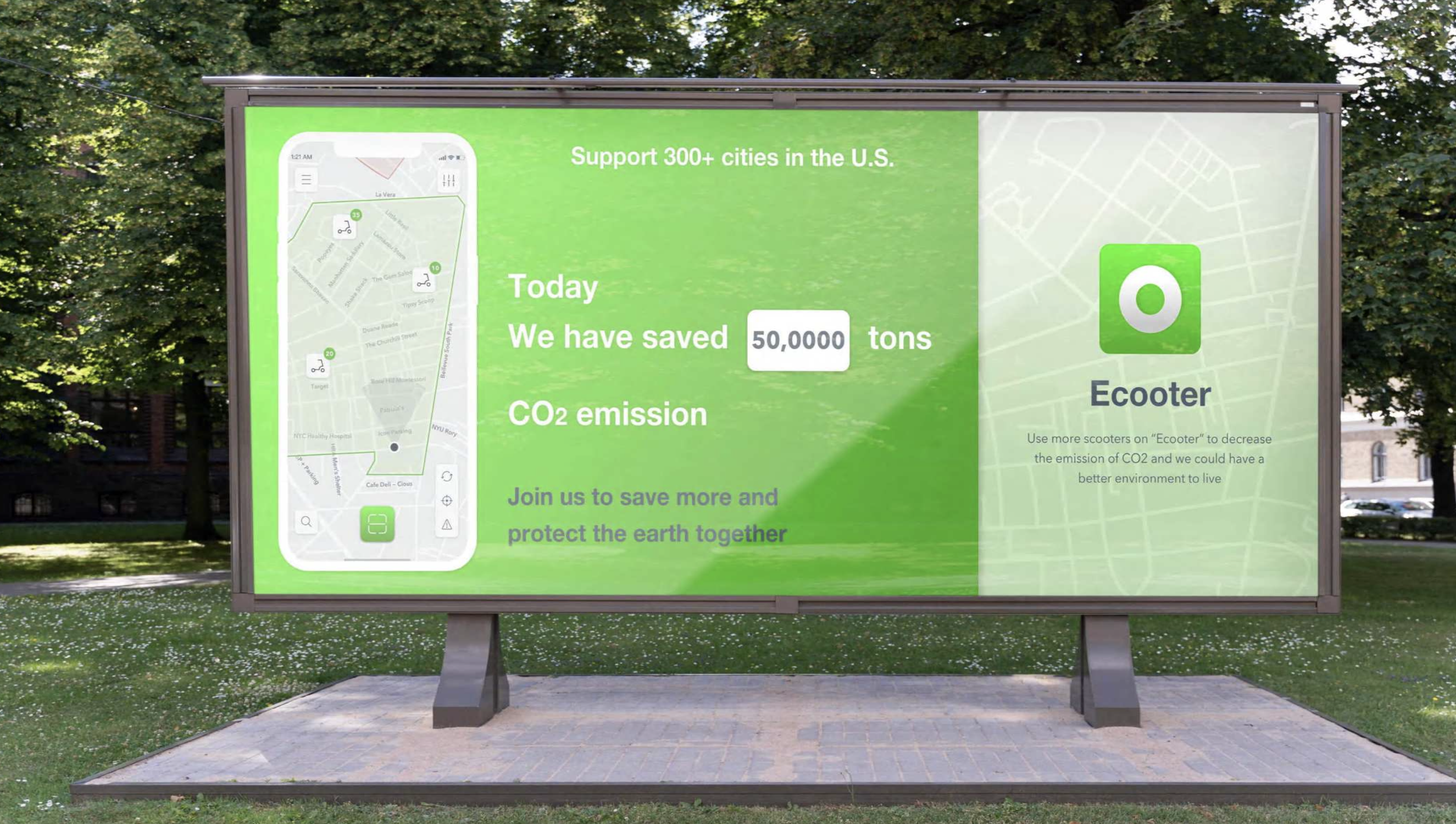 Ecooter helps young people, ages 18-25, cut down on CO2 emissions by encouraging them to use electric scooters instead of gas cars. It uses an app, website, and billboards to share why eco-friendly travel matters.