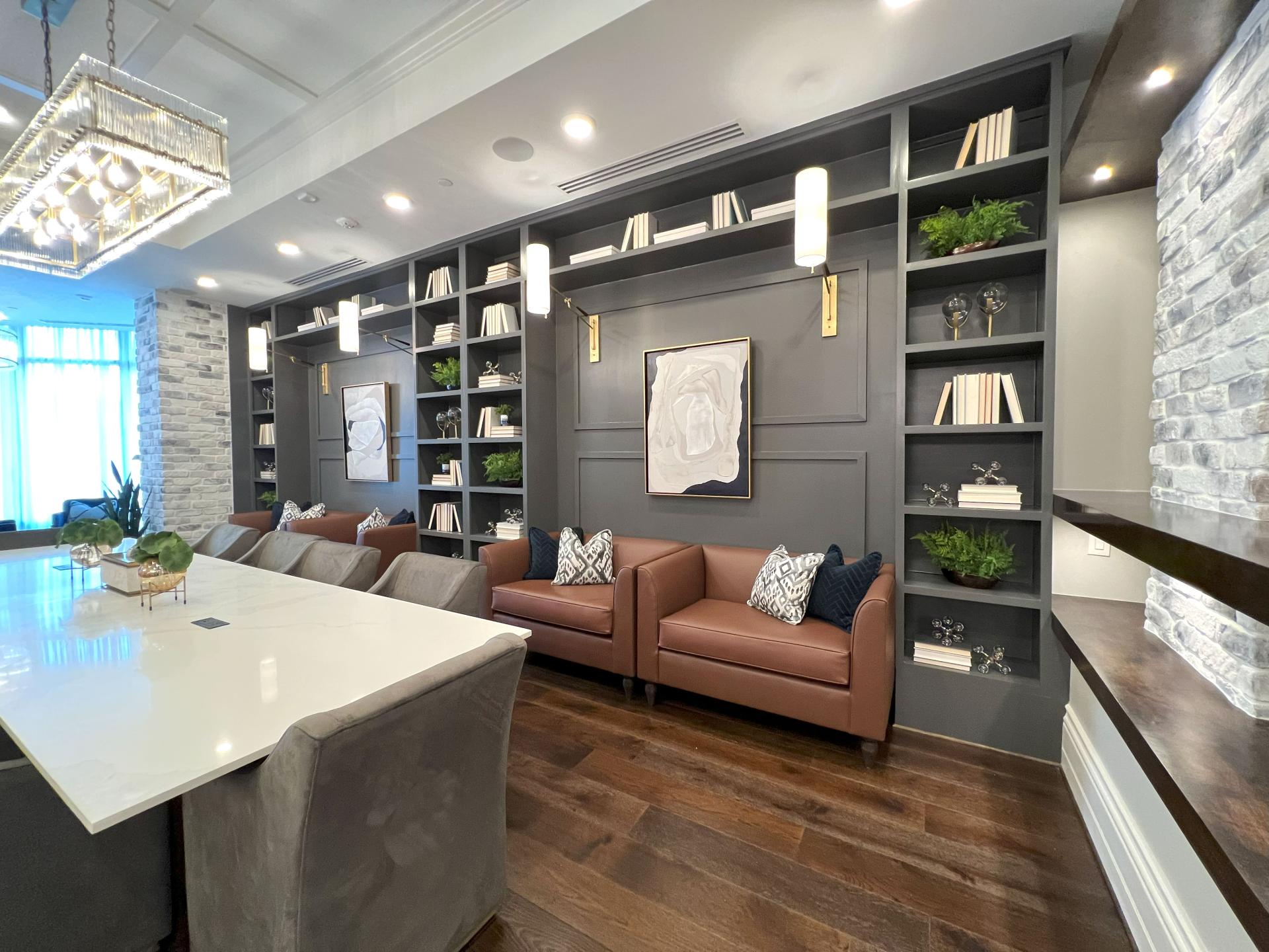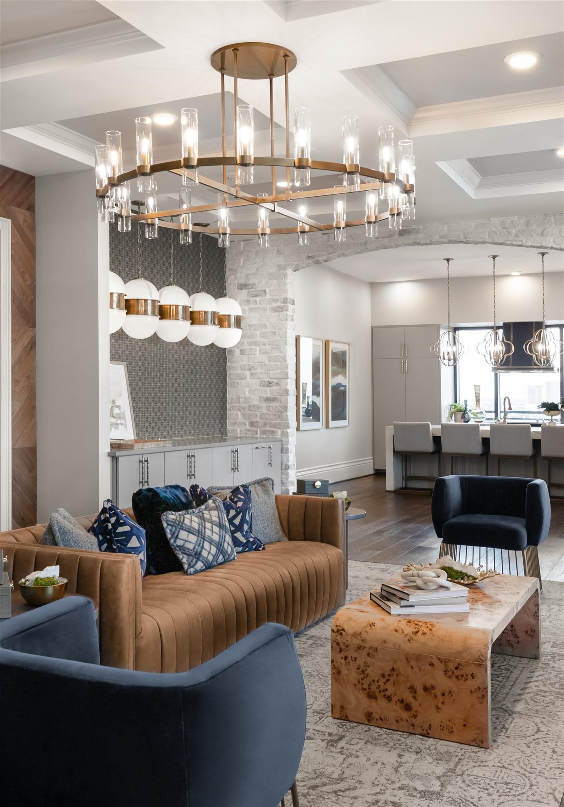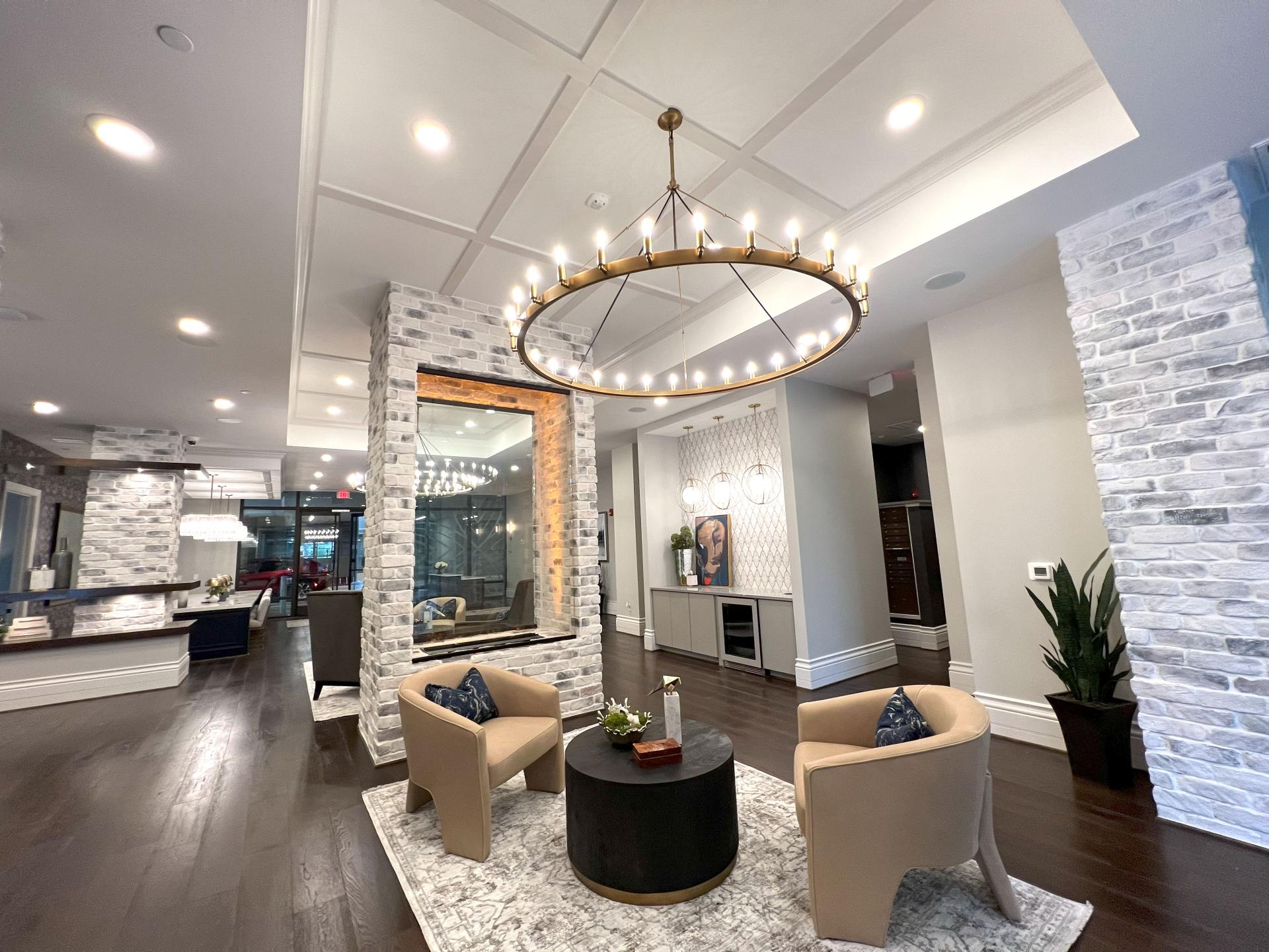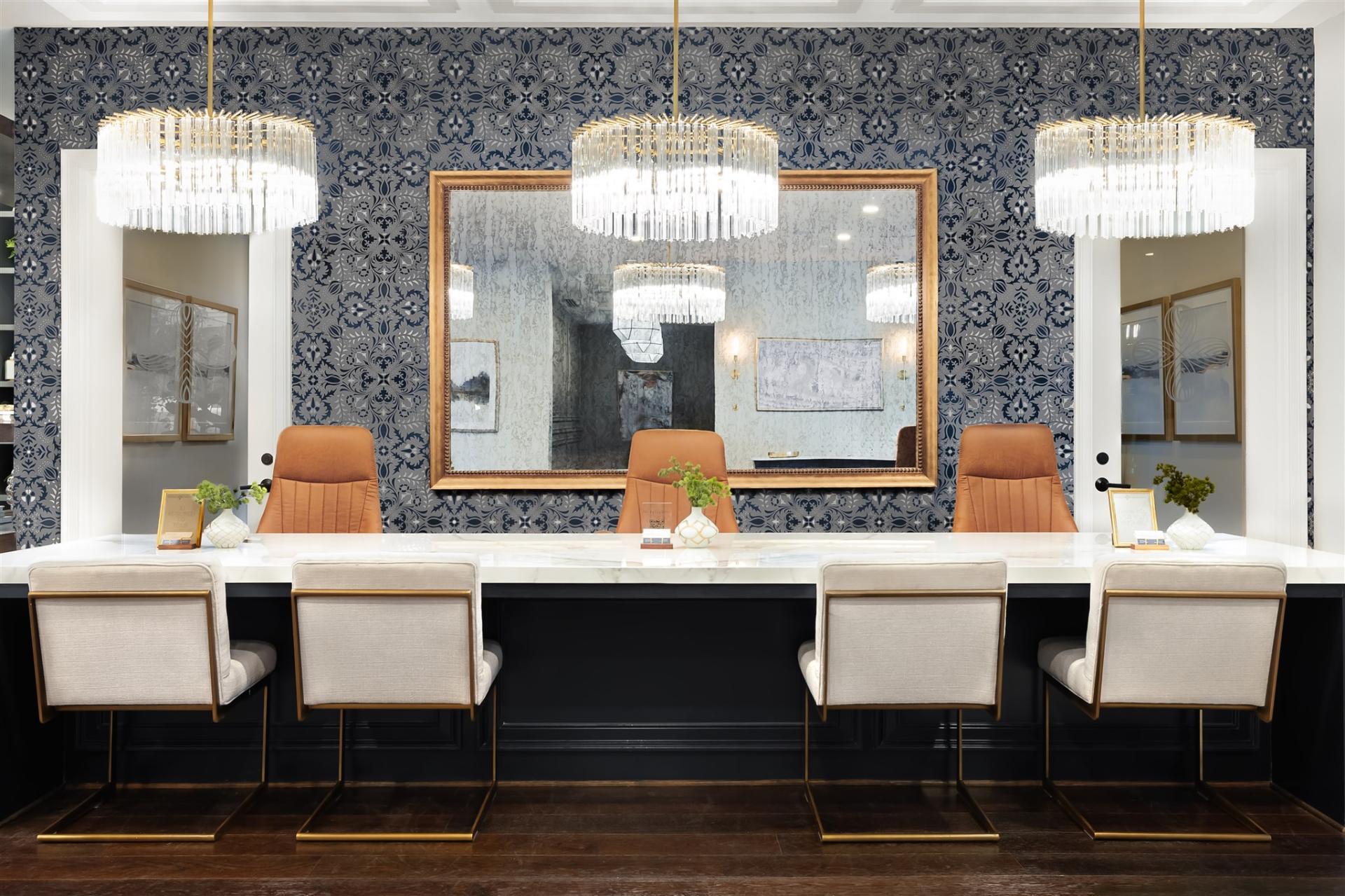 Pearl Rosemont is a luxury high-rise apartment community in the heart of the Houston Montrose district. Multiple levels of amenity spaces were designed to make residents feel as though they are living in a single-family home. The amenities feature a “den” area with a library, a dining and gathering place, a top-of-the-line fitness center, and a covered aqua lounge adjacent to the extraordinary pool and outdoor space. The penthouse level sky lounge is meant for hosting lively get-togethers or private dining parties with soaring views of Houston. The offices were carefully designed to maintain the residential feel while providing a functional working space. The property leasing agents’ desk combines beauty and practicality with a substantial, book matched slab built-in desk highlighted by crystal chandeliers. The property concierge greets potential residents from a custom desk meticulously designed to mimic an antique bombe chest. No spectacular detail was missed, from rich hardwood floors with marble inlay patterns to replicate, to stunning lighting that highlights each space, to custom-designed wallcoverings. The feel of high-end residential luxury is reinforced with antique mirror or marble and brass backsplash tiles, book matched counters and fireplace surrounds and carefully curated artwork and furniture. Pearl Rosemont embodies timeless and elegant high-rise living.