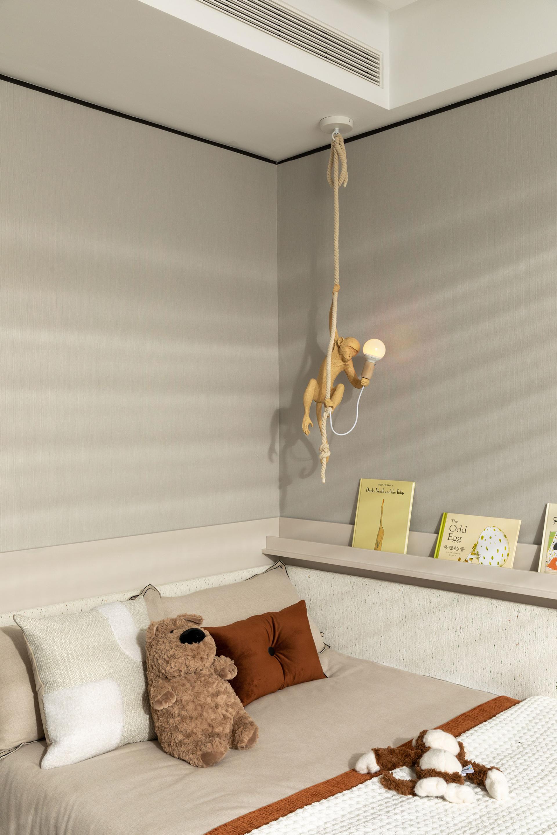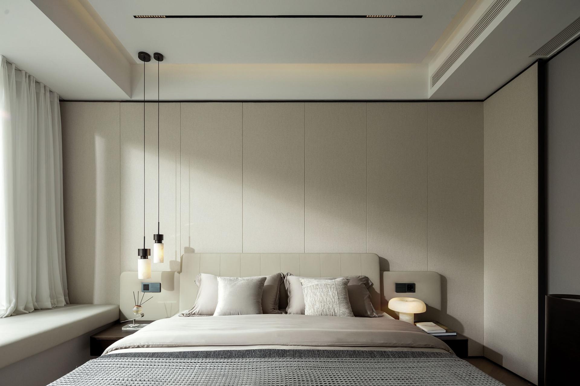 The master bedroom is serene and elegant, with a design that gently expresses delicate emotions through light and shadow. The abundance of white space creates a restful atmosphere, spreading a sense of comfort and coziness throughout the room.