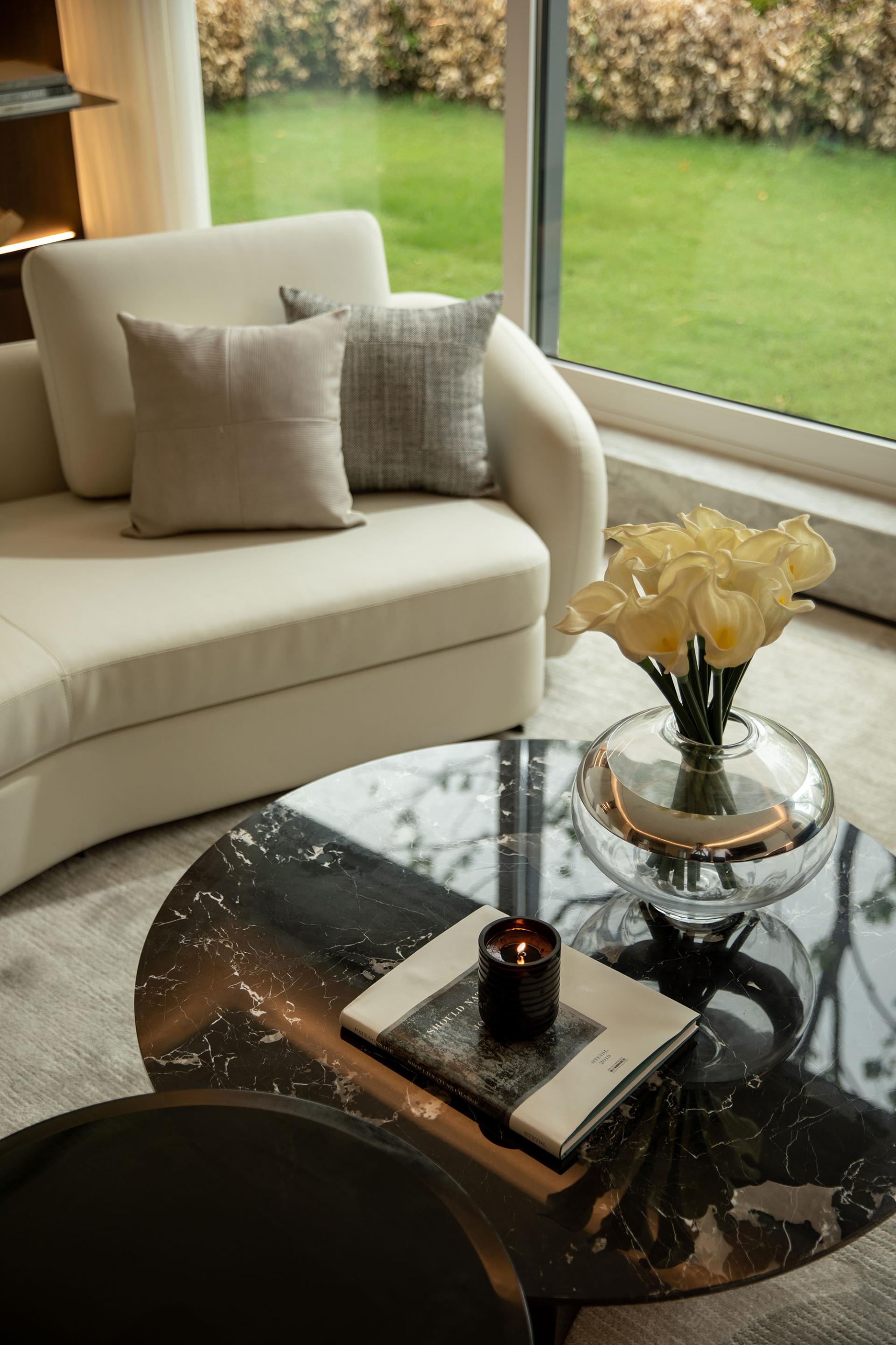 The living room features an open, fluid layout that creates an expansive, undefined space, perfectly balancing luxury and elegance. The design centers around calming black and white tones, interwoven with quiet blue and poetic green accents. These colors come together to create a transparent form of luxury, highlighting the understated refinement of a premier residence.