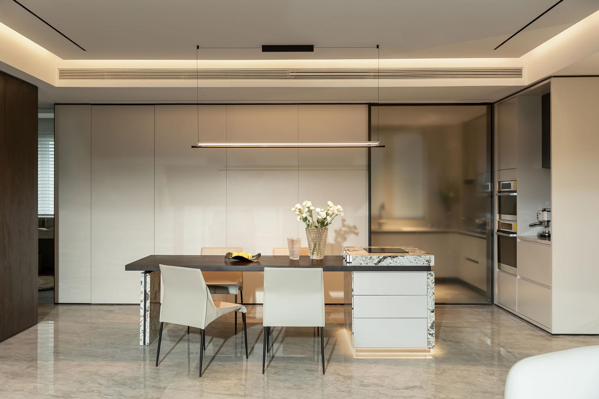 The dining room is a warm and inviting space that encourages interaction. The kitchen and dining area are seamlessly connected, with smooth lines that define the modern aesthetic. Thoughtfully integrated lighting complements the space, adding warmth and enhancing the feeling of home.
