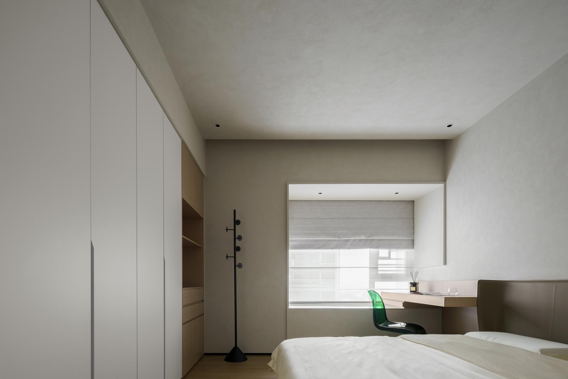 The color palette harmoniously combines cement gray with soft, muted hues. The neutral cement gray strikes a perfect balance with the warmth of the wood, setting a minimalist, modern tone. The low-saturation hues of furnishings and art pieces add character without overwhelming the space, making it feels both cohesive and lively.