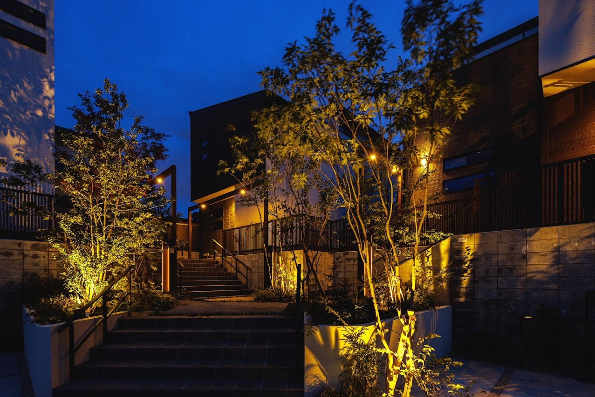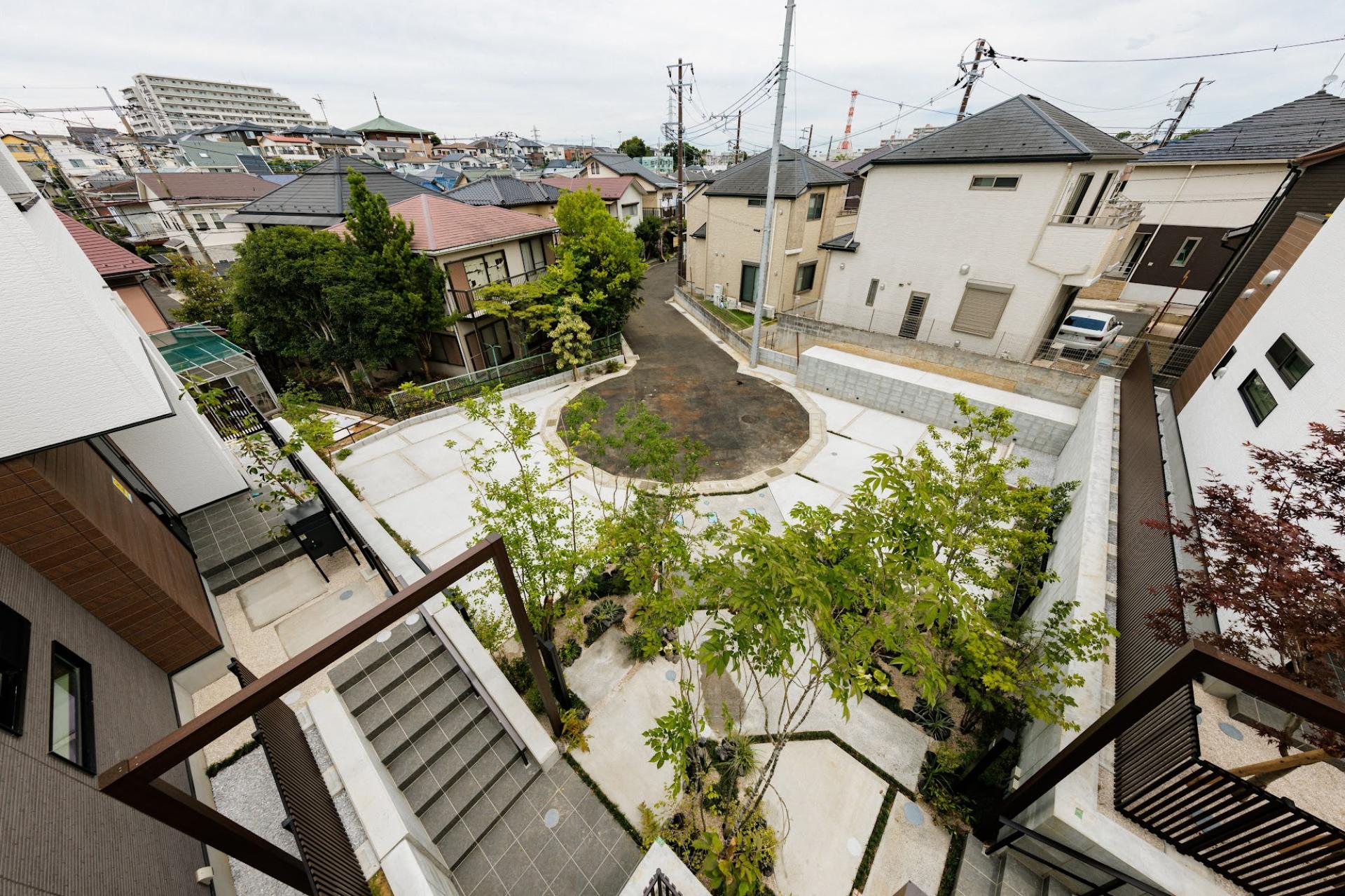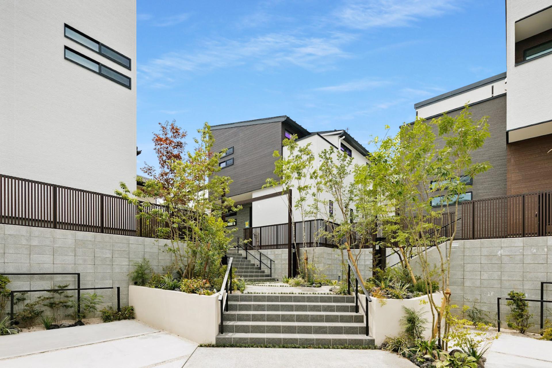 A condominium development where the height difference between the residential site and the road exceeds 2 meters. While many developments use retaining walls within limited sites to eliminate differences in height in cities, this has created a space where the public and private areas of each unit have been separated by overlapping the lines of daily flow.In order to eliminate the feeling of confinement caused by walls due to differences in elevation, the landing is made the center of the open space, making it recognizable from the surrounding area and designed as a symbol of the town.