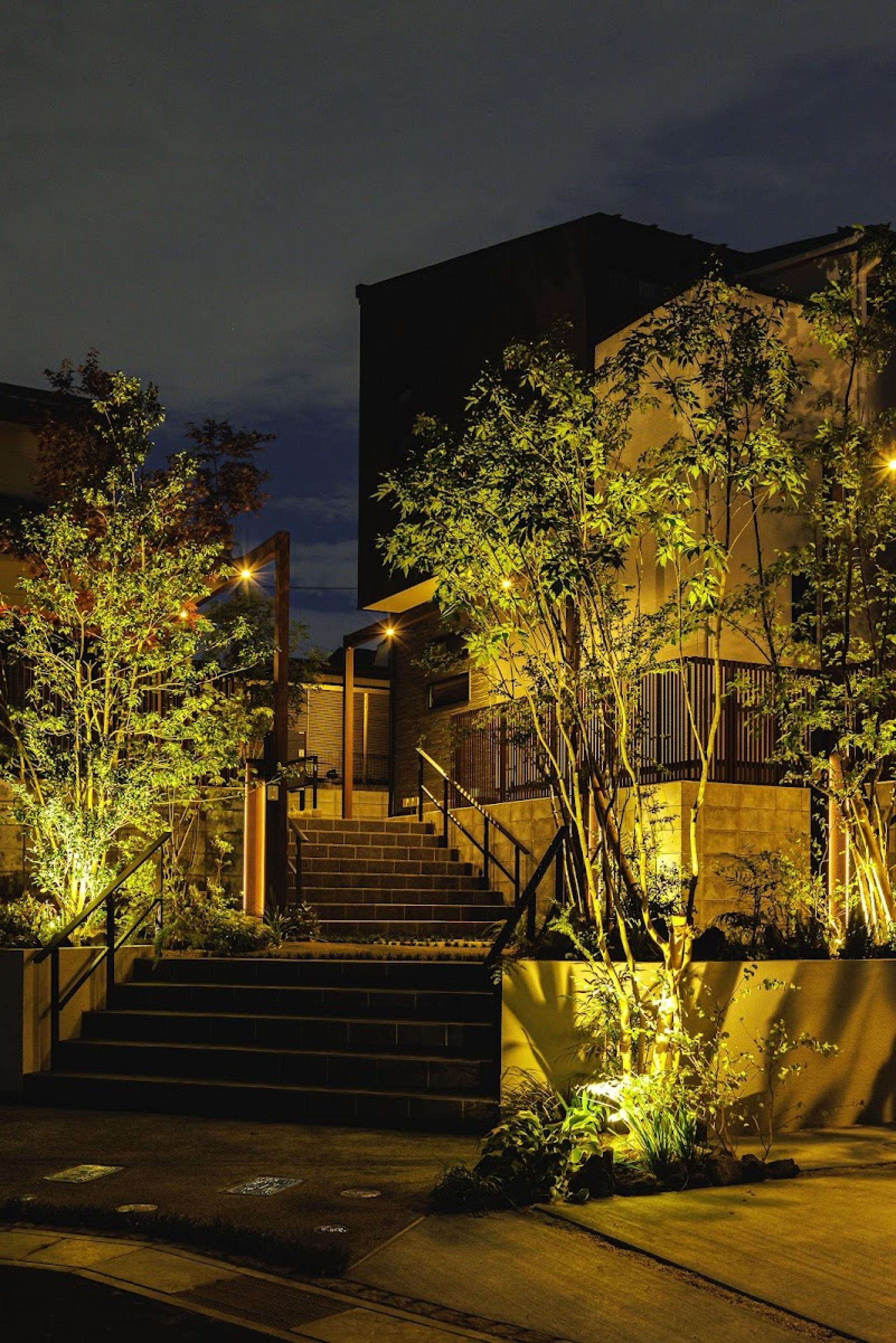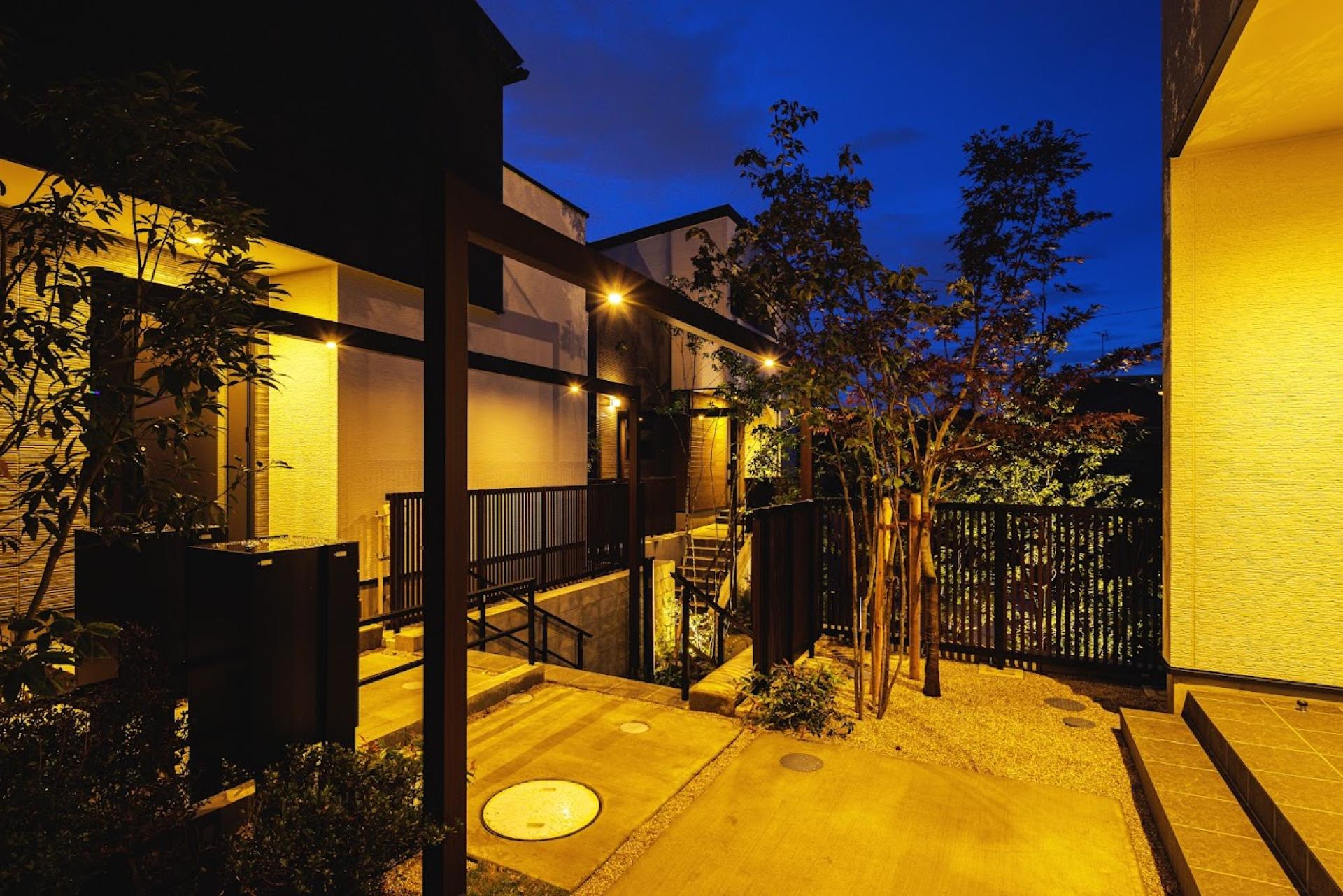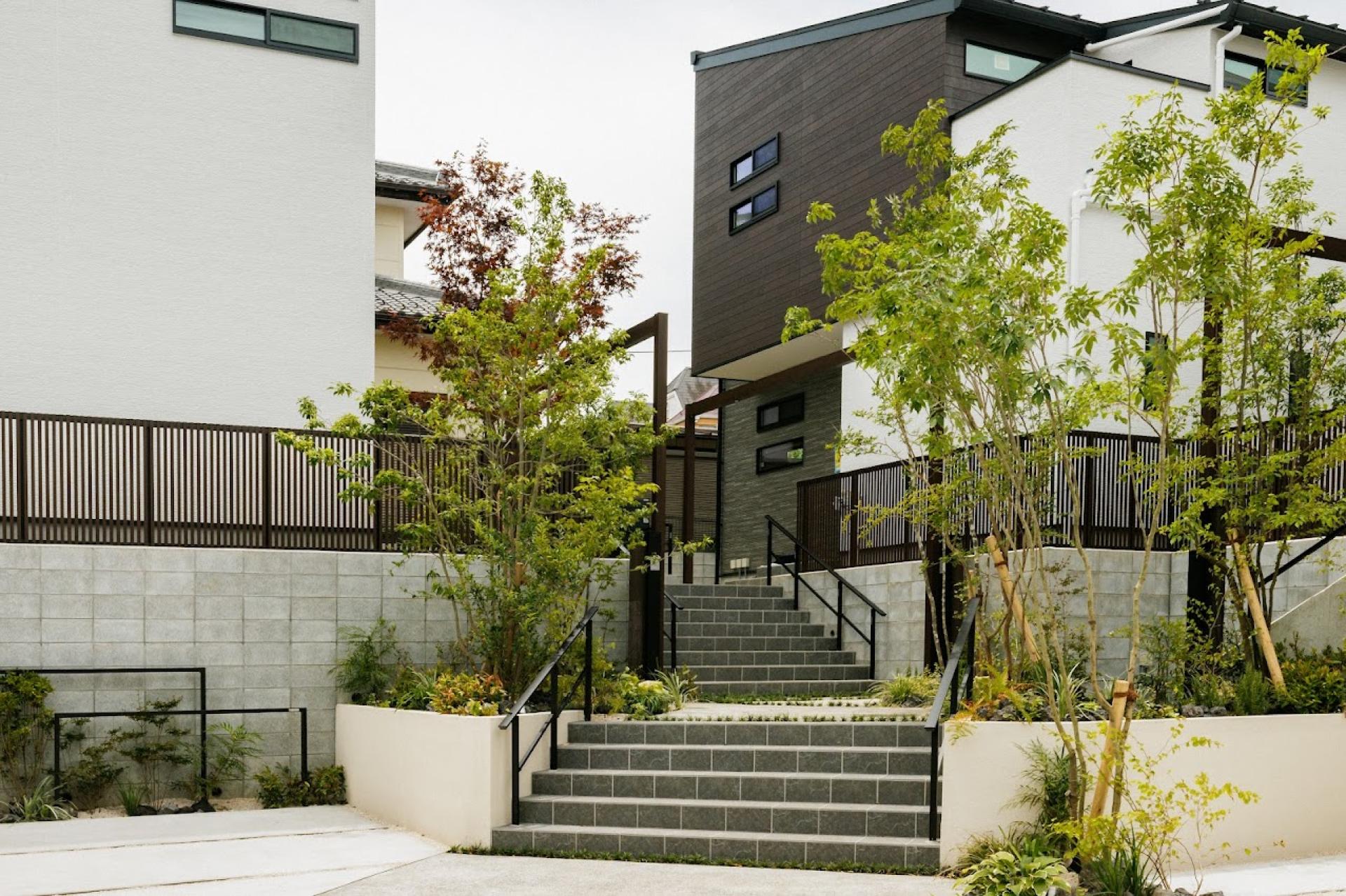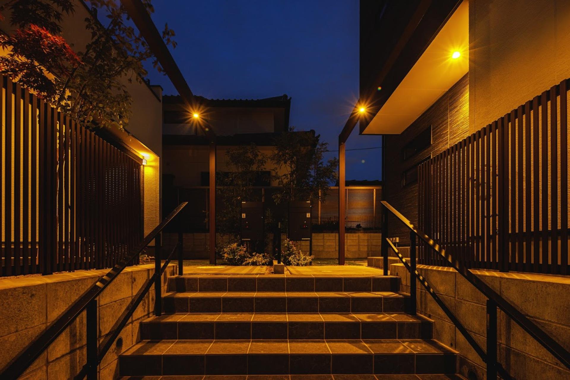 A condominium development where the height difference between the residential site and the road exceeds 2 meters. While many developments use retaining walls within limited sites to eliminate differences in height in cities, this has created a space where the public and private areas of each unit have been separated by overlapping the lines of daily flow.In order to eliminate the feeling of confinement caused by walls due to differences in elevation, the landing is made the center of the open space, making it recognizable from the surrounding area and designed as a symbol of the town.
