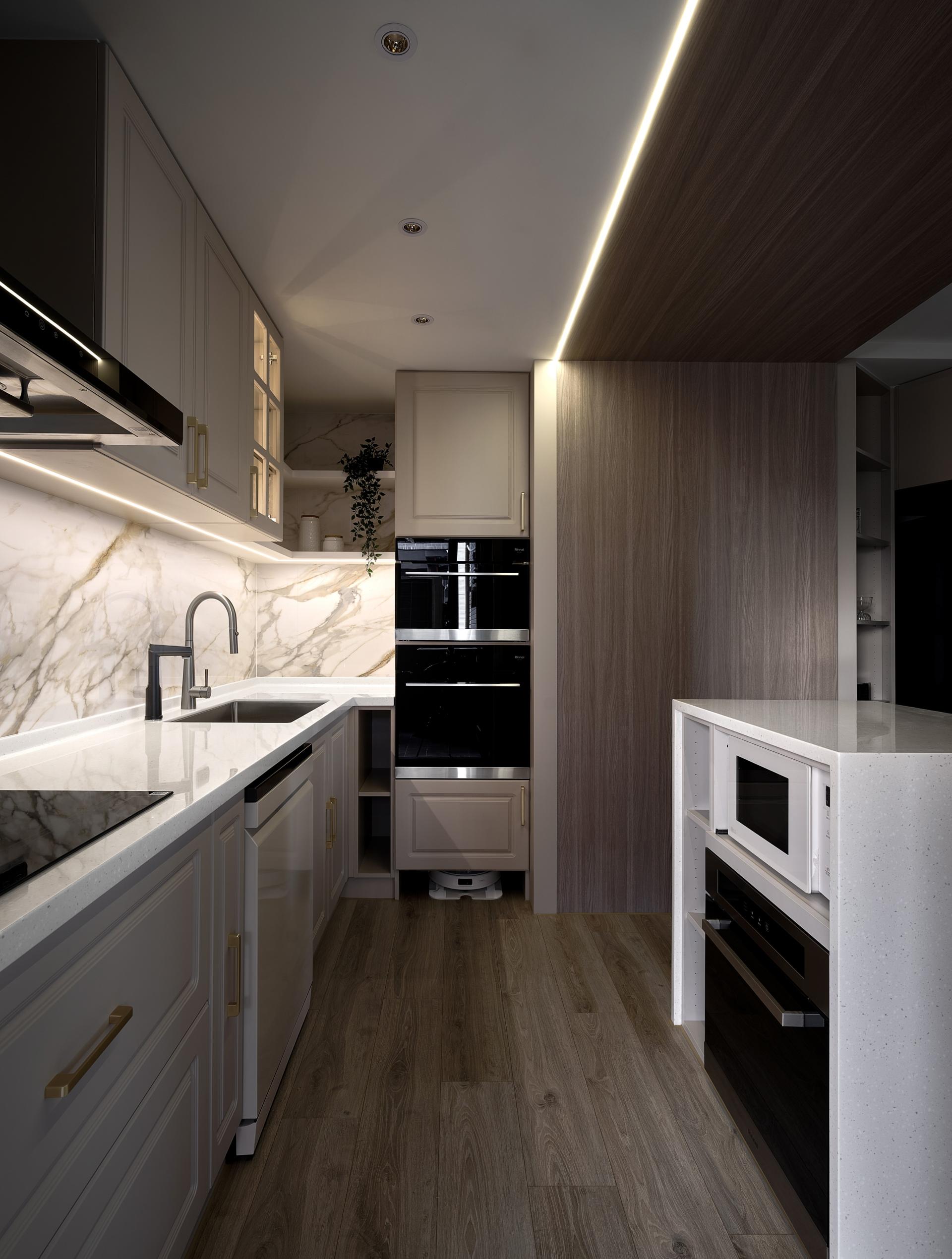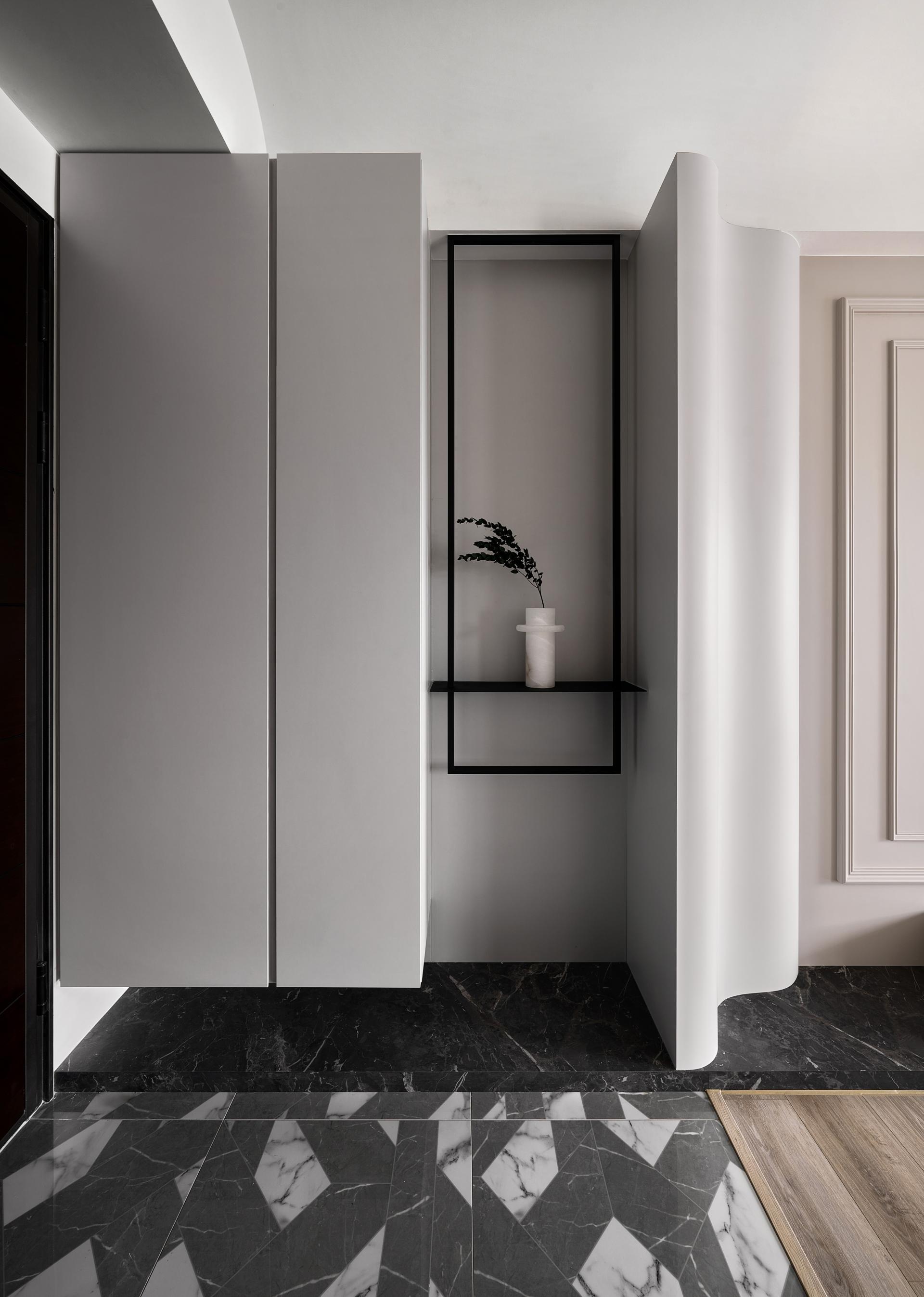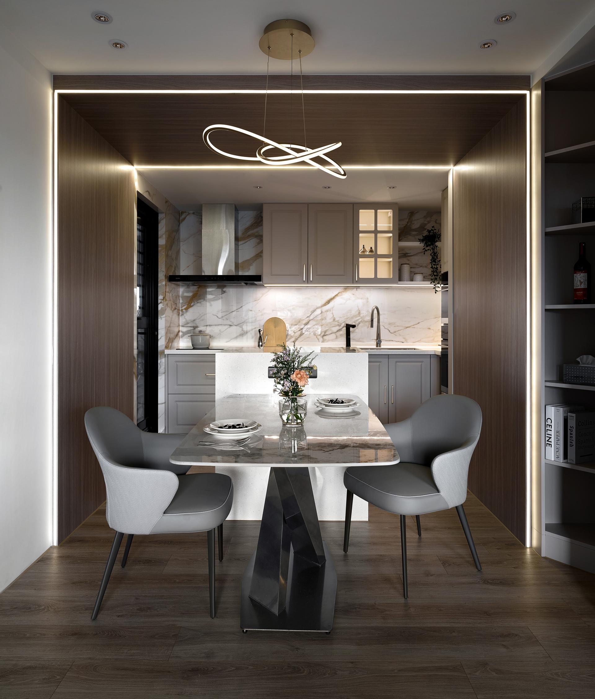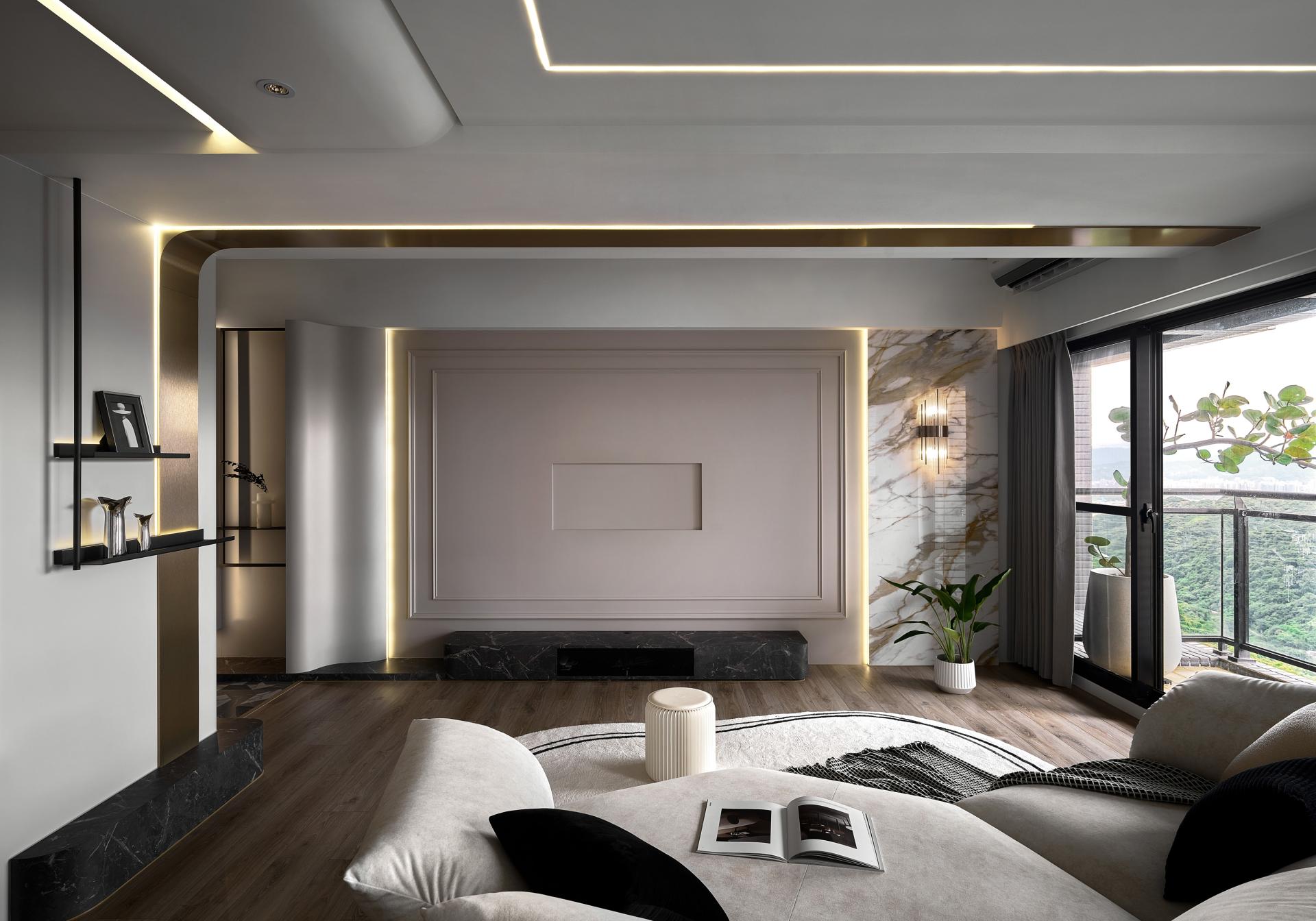 During the discussion on spatial circulation planning, we delved deeper into aesthetic issues, aiming to integrate the homeowner's usage habits and uncover synergies to create a unique and personalized space. In the layout of the common areas, we not only ensured smooth circulation within the open spaces but also used low-saturation tones for a harmonious blend, perfectly aligning with the owner's preference for a subtle yet grand aesthetic. Upon entering, both the homeowner and guests immediately feel the carefully crafted visual art atmosphere. Moreover, the skillful incorporation of curved lines in the elevation and plan designs breaks the monotony of the space, adding a sense of dynamism. The TV wall design seamlessly integrates the homeowner's favored American elements, complementing the overall living room style. The interspersed deep wood grain patterns weave through the negative spaces, further enhancing the depth and beauty of the area.